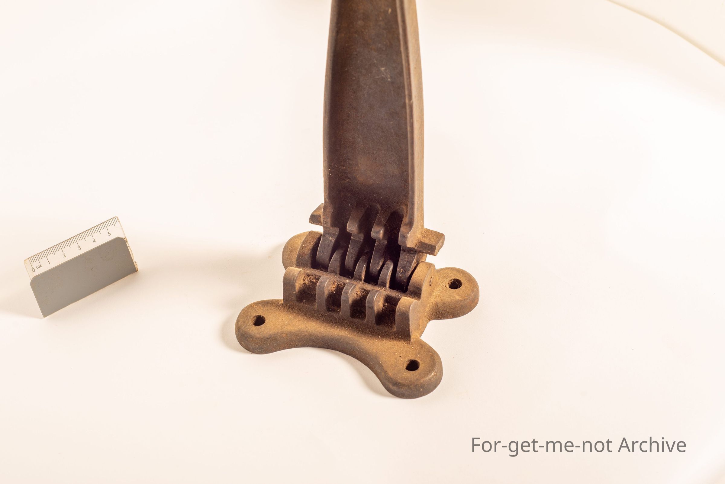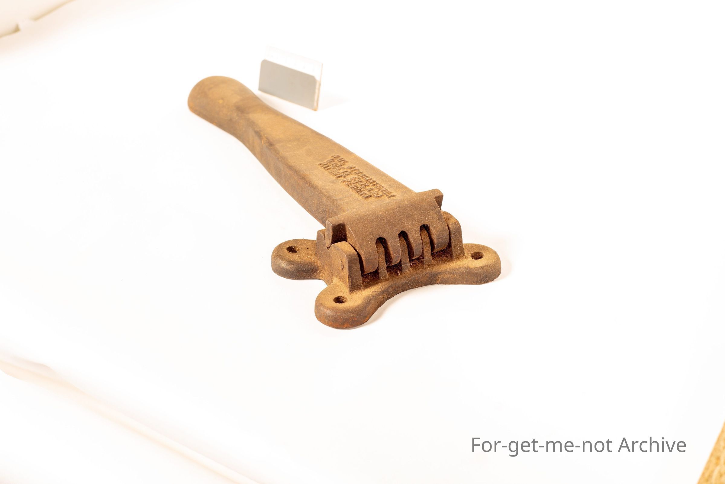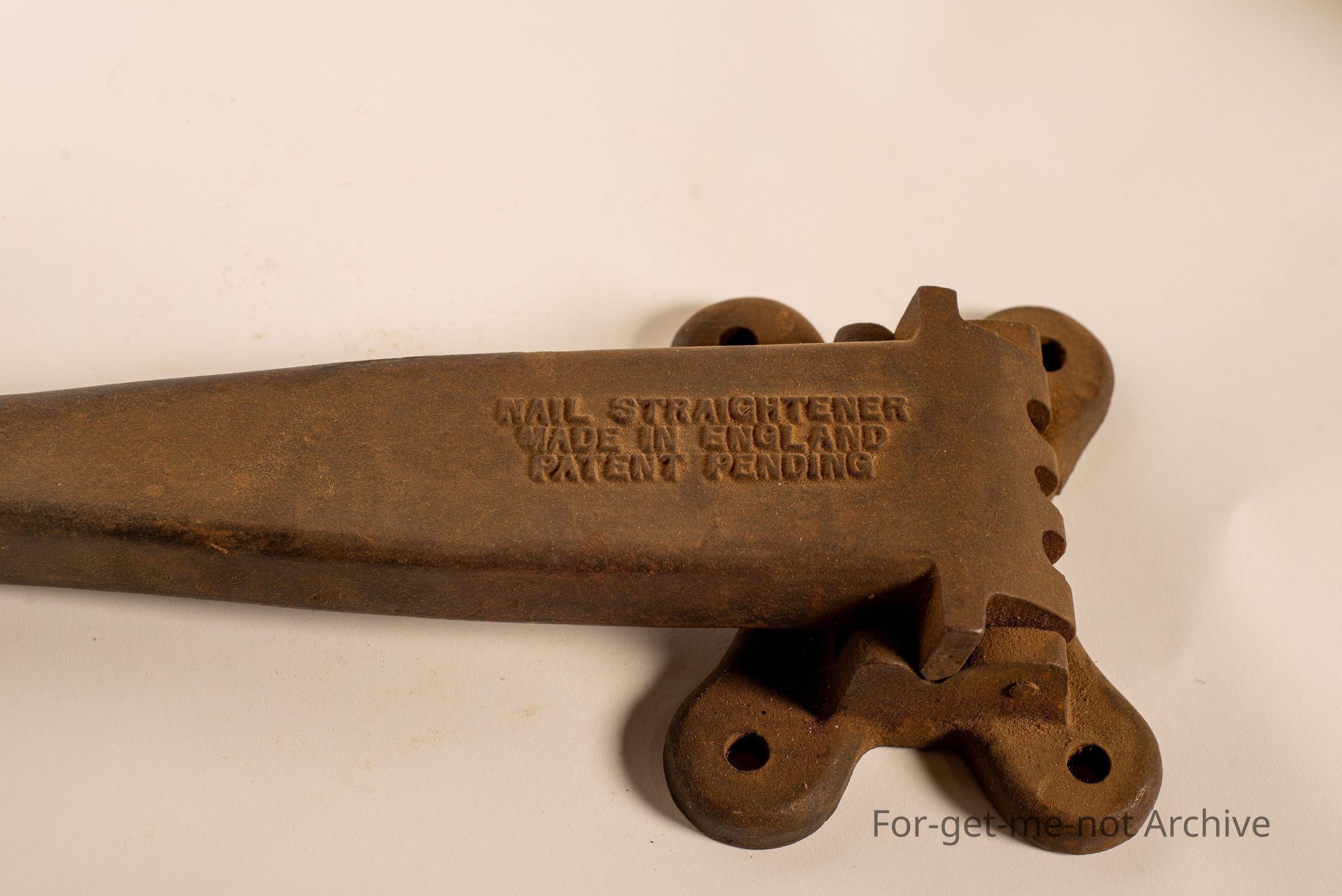 This is a nail straightener, made in England, patent pending, large handle, set of jaws to put the nail in when you push it flat. Bingo. The nail's straight. Unusual tool.