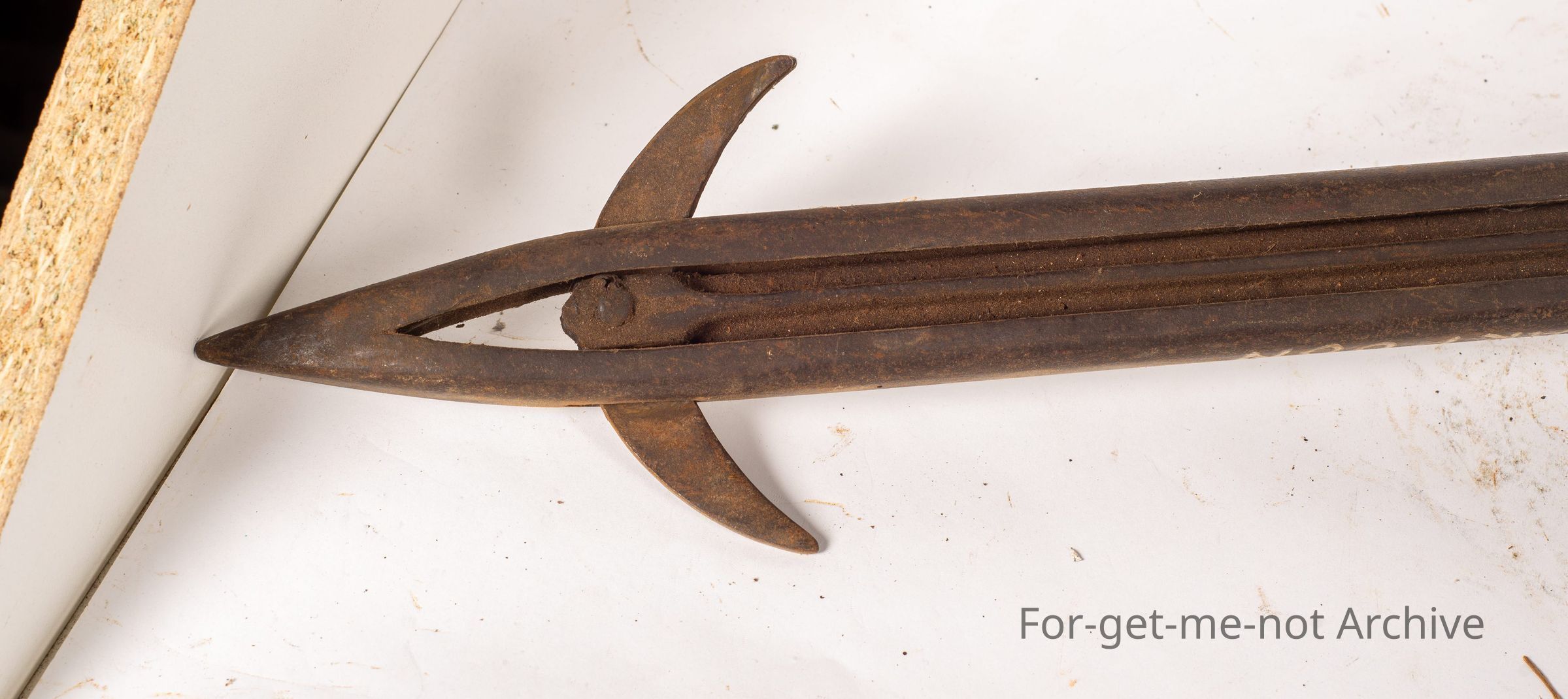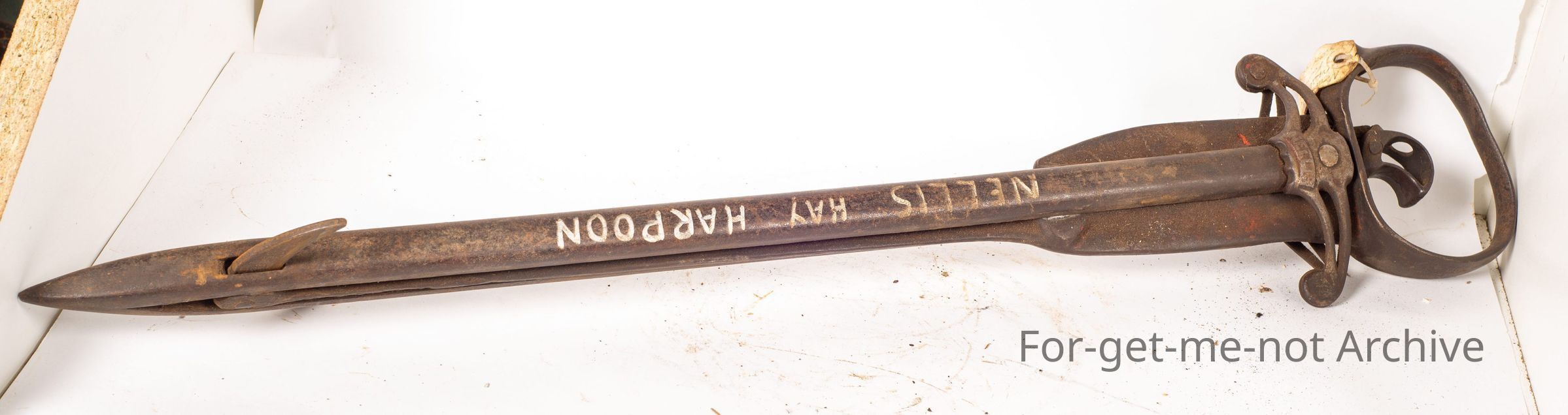 This is called the Nellus Hay Harpoon of American origin. This goes back to the days pre pressing hay where the stacks were fought together. They weathered heavily on the outside. This tool was made to spear into the haystack, pull the trigger, the wings came out and pulled the sample out from the inner part of the stack to see what the quality was like. You would never wear this out heavily built.Collection
