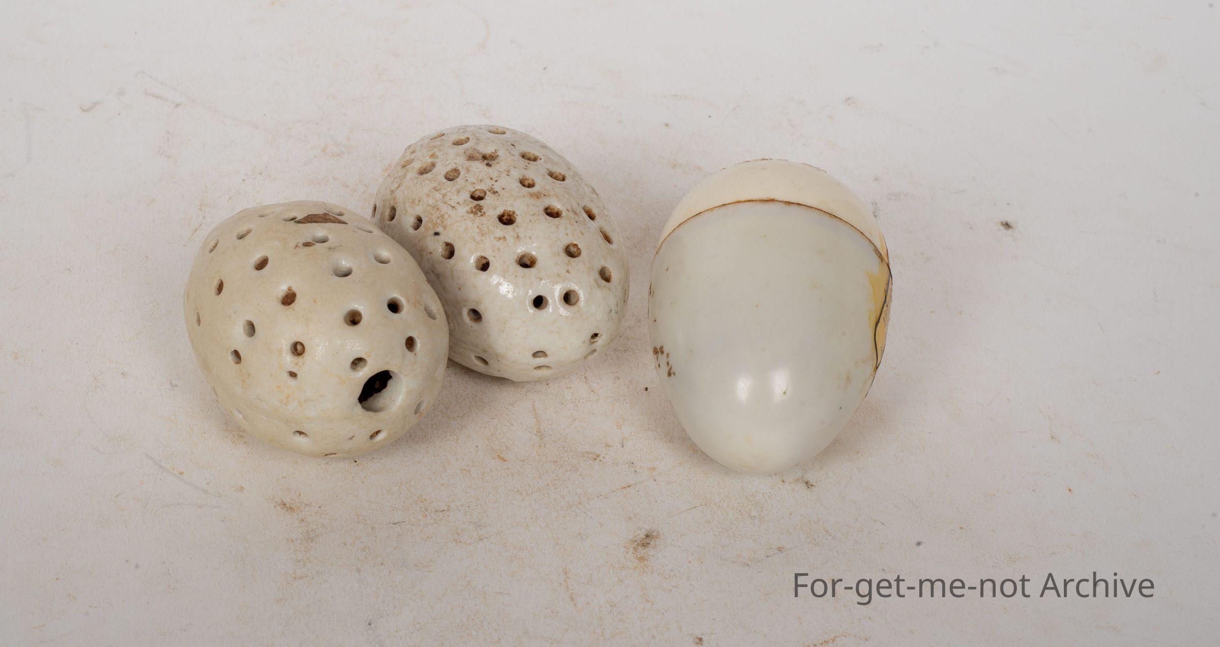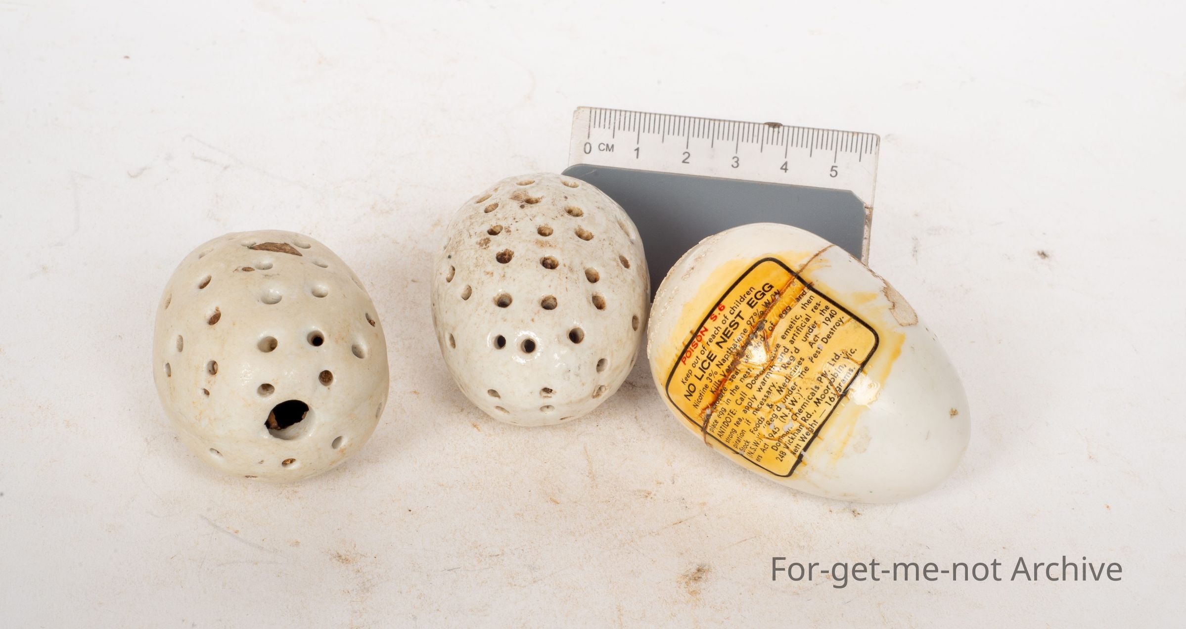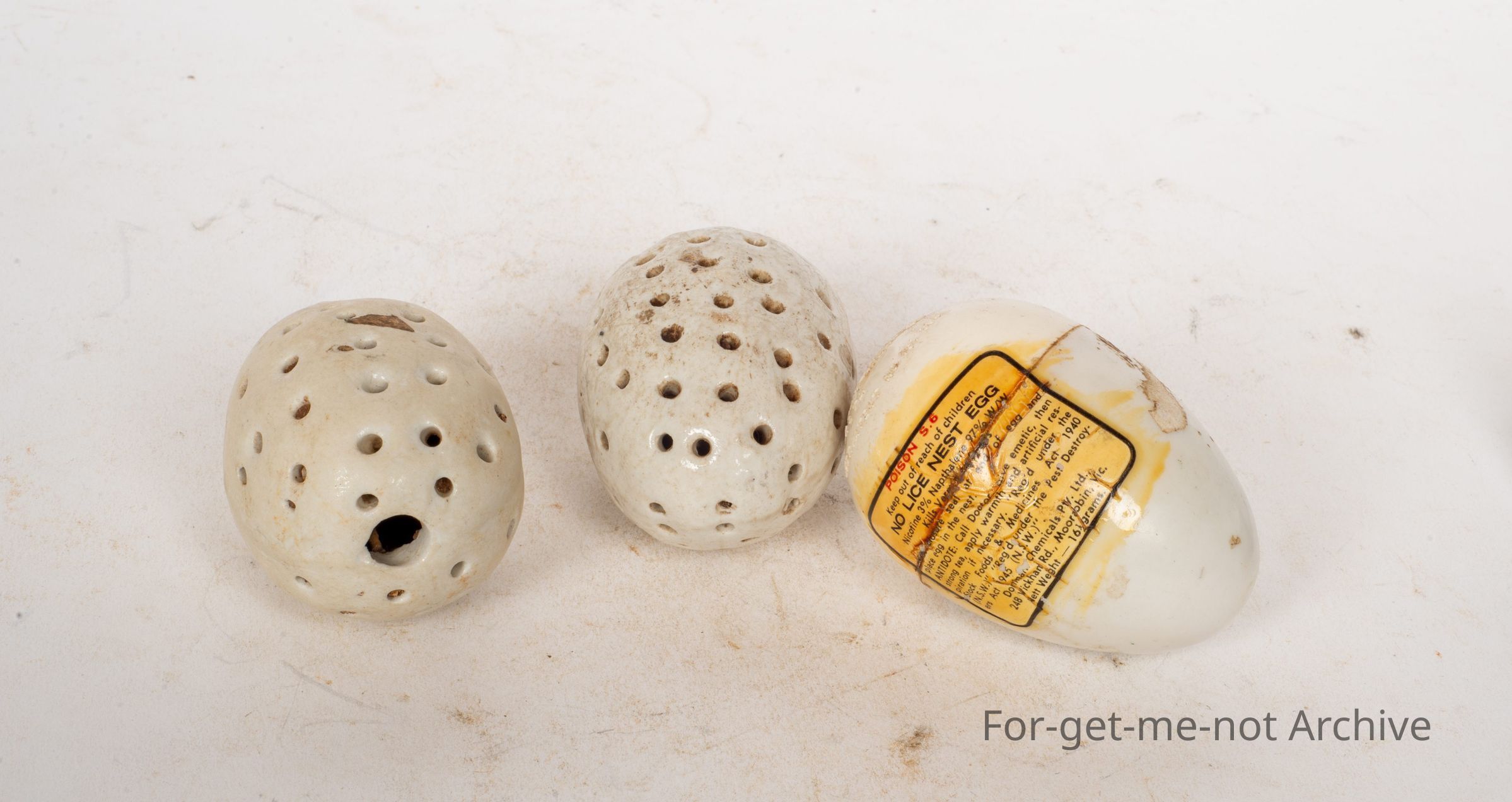 These are 3 nest eggs. 1 plastic. The contents of the plastic one is nicotine, naphthalene, every other poison you can imagine made in Moorabbin in Melbourne. Has a hole in the top to allow the chemicals to disperse into the chook's nest. The other 2 are ceramic, completely perforated all the way around. These were activated by having a piece of sponge inside the egg with a cork. They were usually filled with DDT and left as a nest egg.Collection