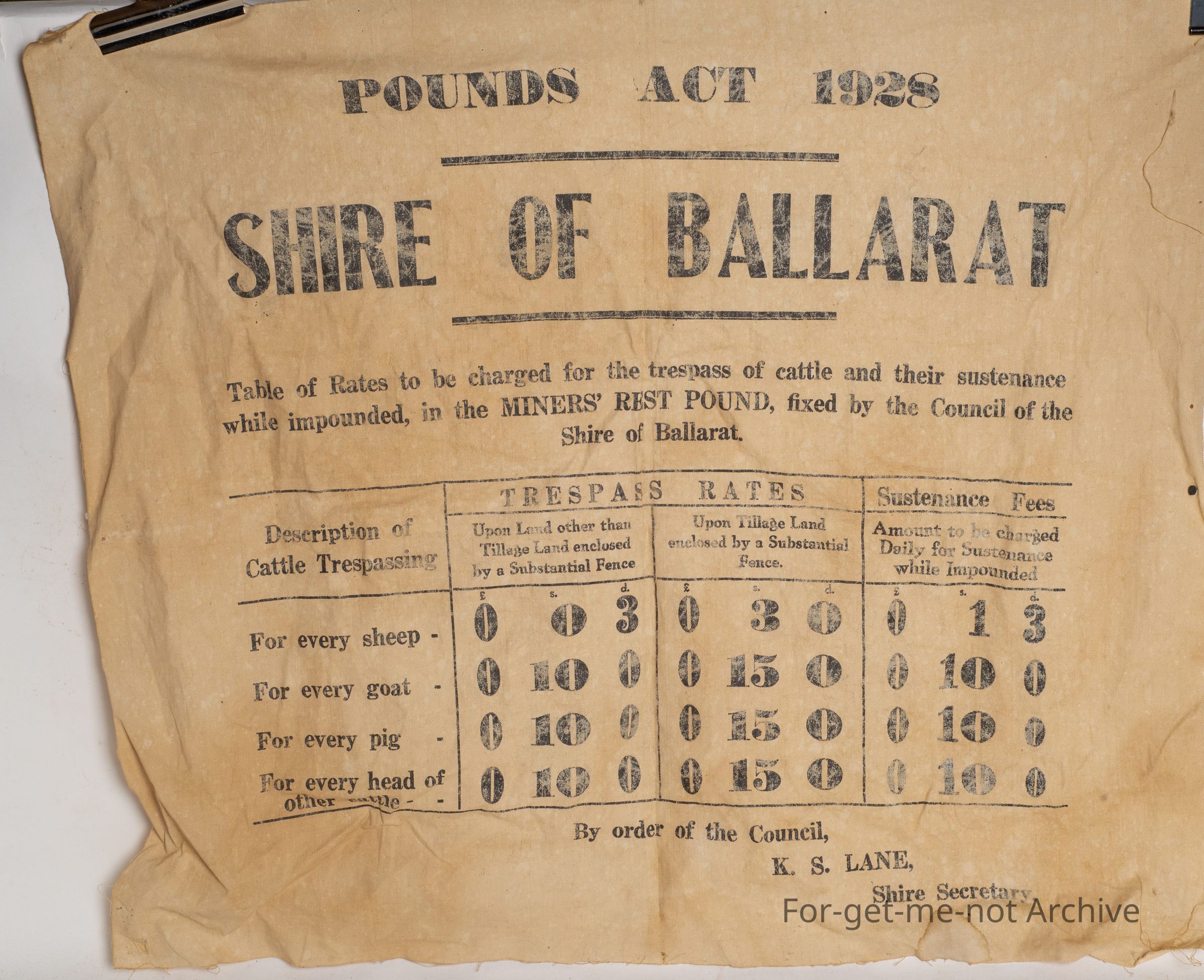 This sign printed on material, A notice concerning the operation of the Ballarat pound with the various rates of penalty for stray stock entering private property. This is dated 1928 from the Ballarat City Council, an important early piece of history.Collection