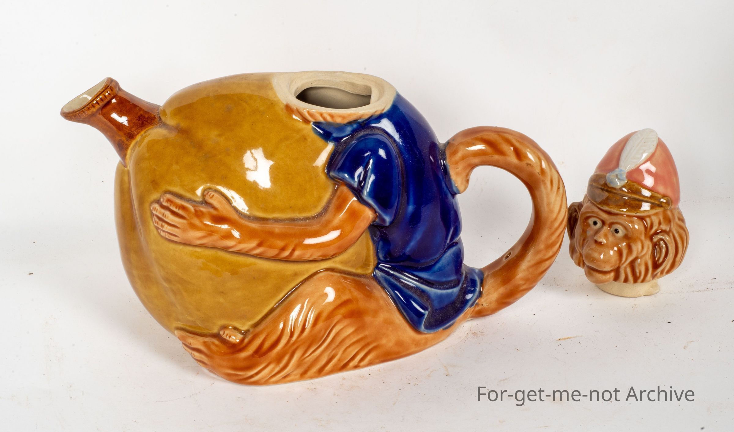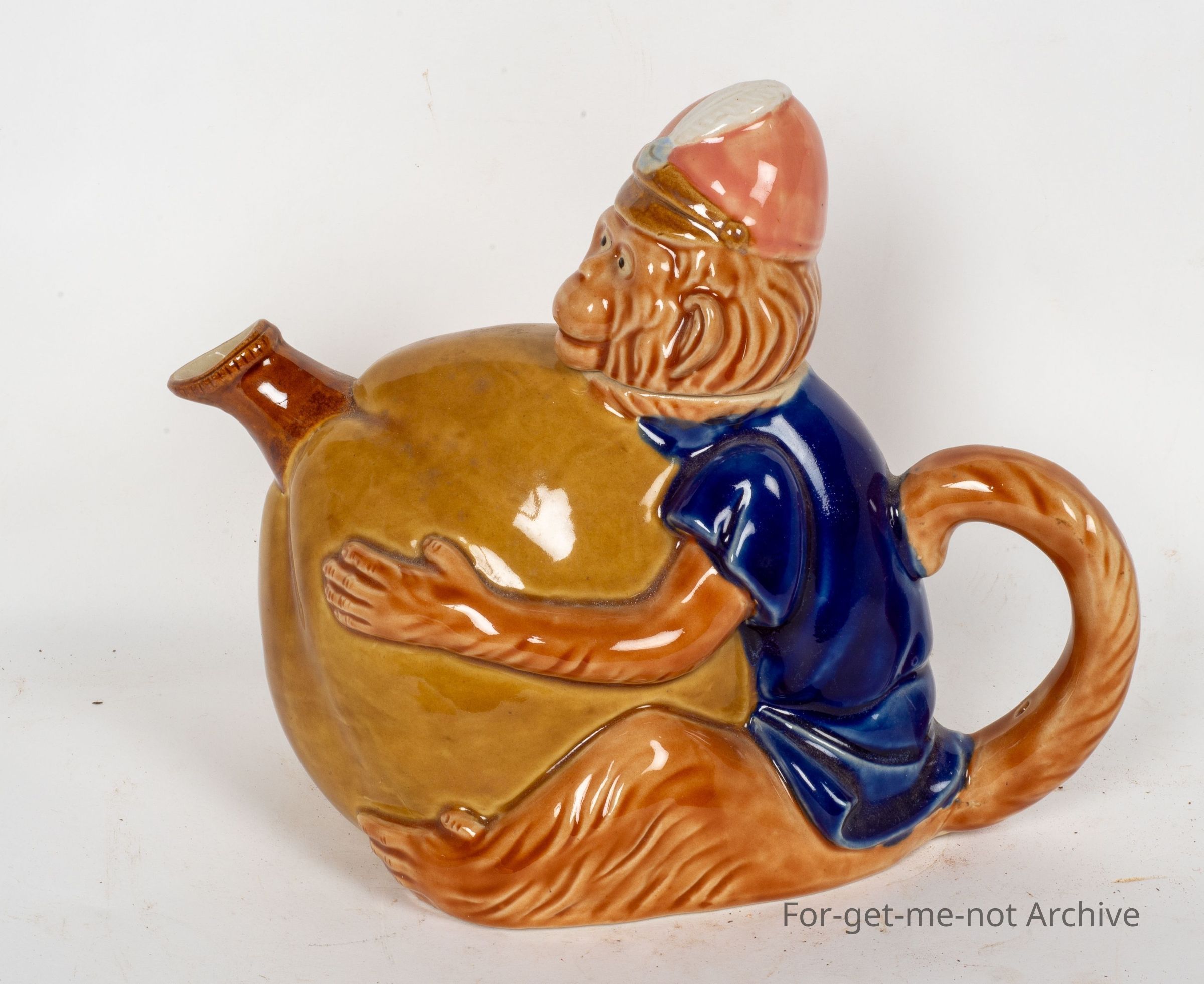 Tea pot in the form of a monkey holding a nut