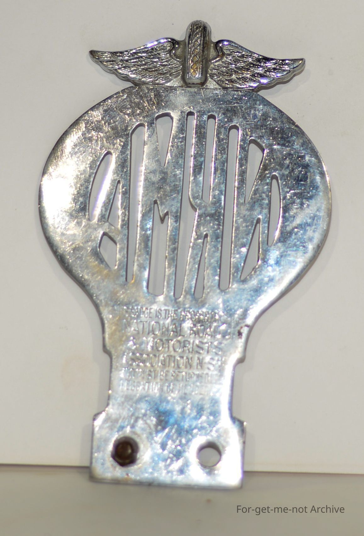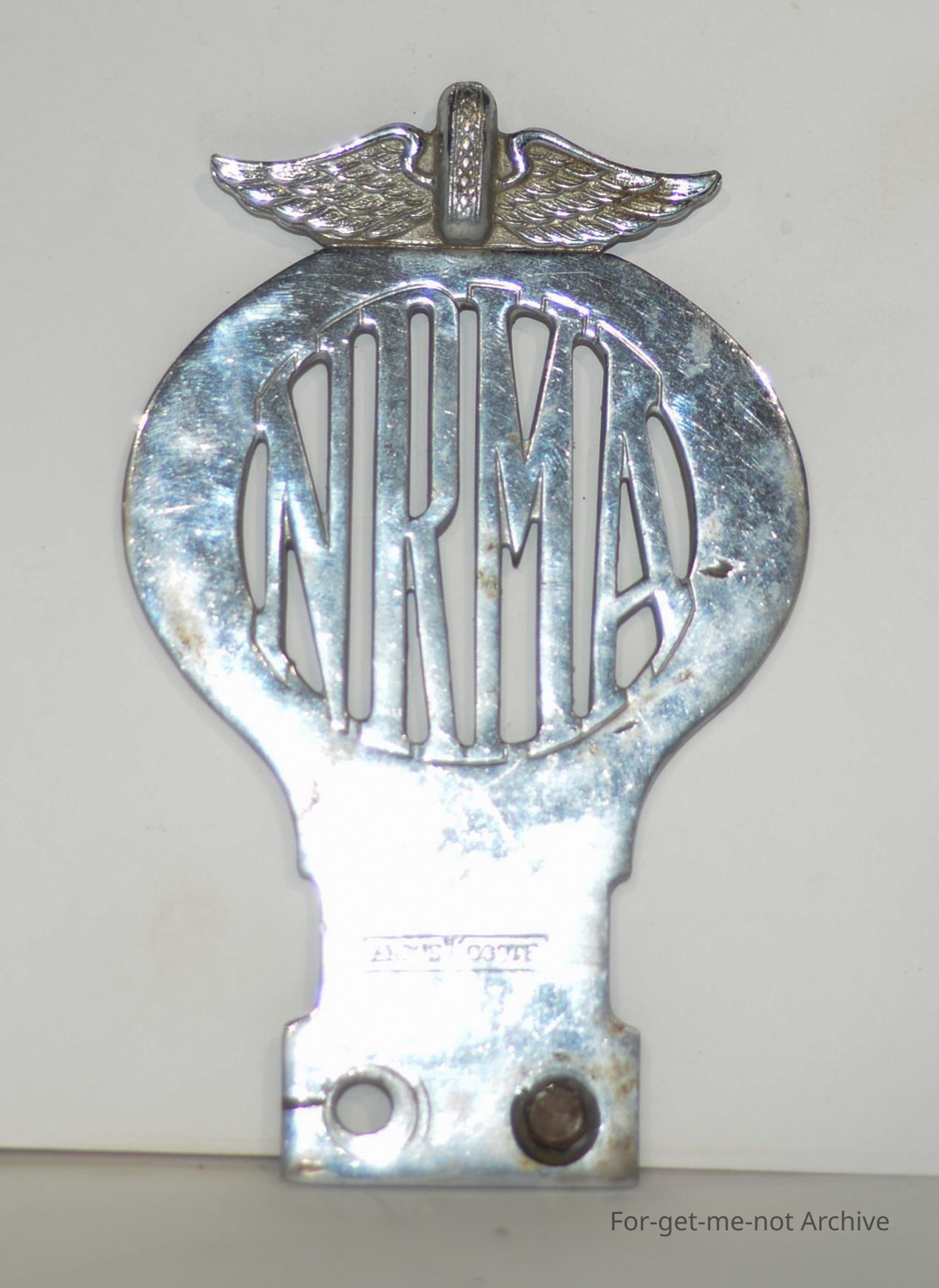 NRMA insignia early how ever plain with cutout letters and chromed finish . Attaches to car bumper