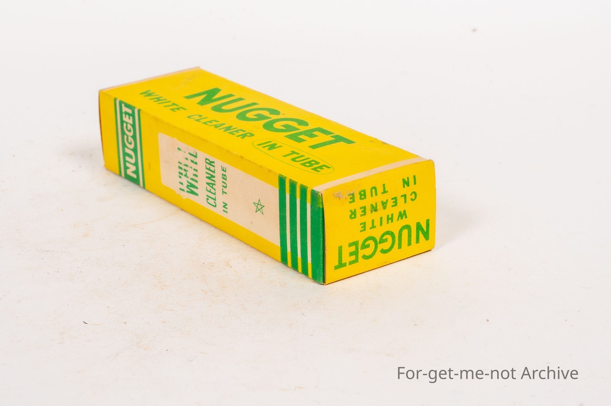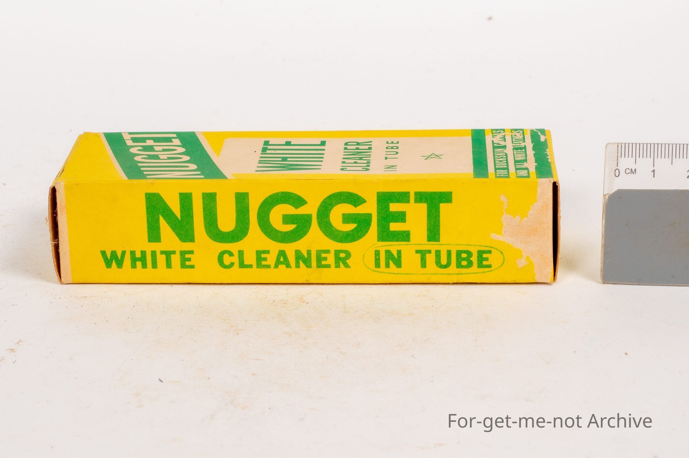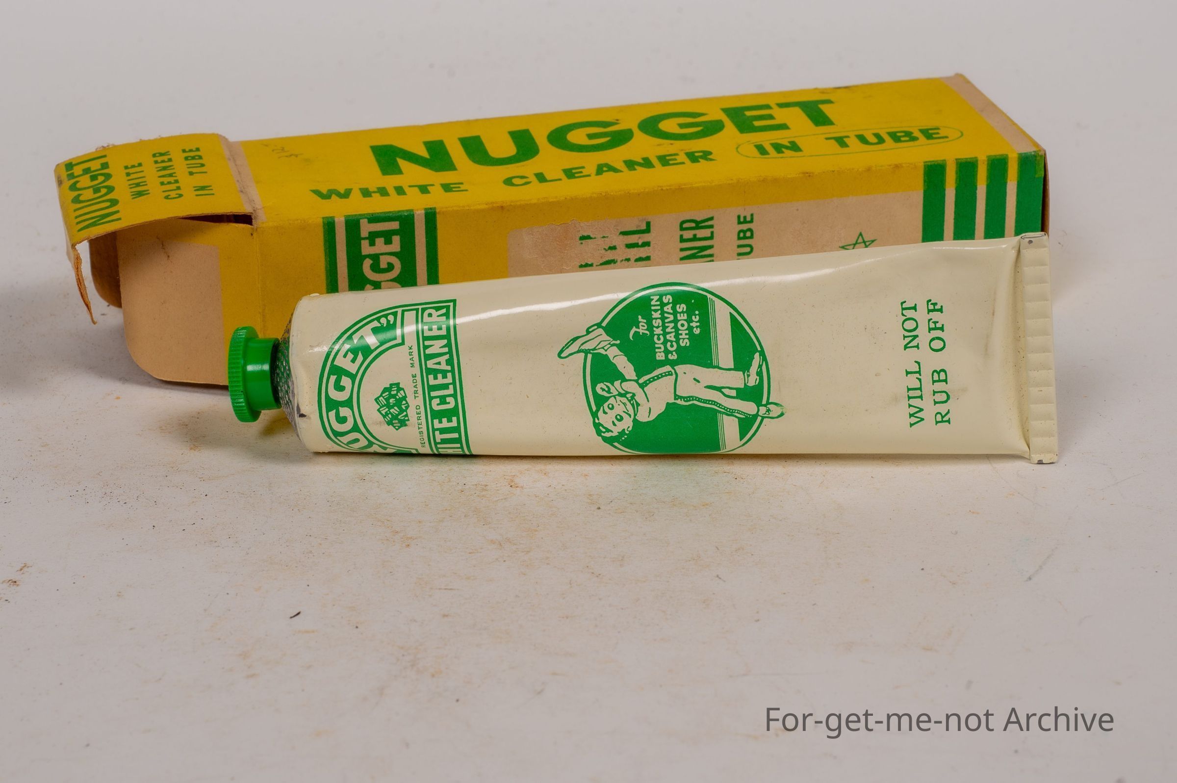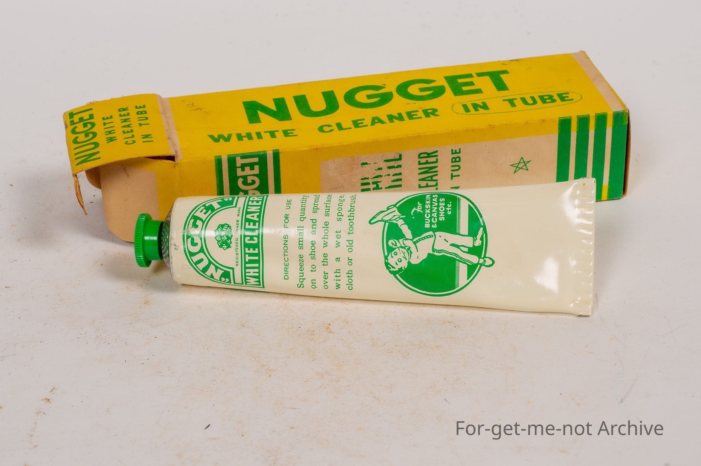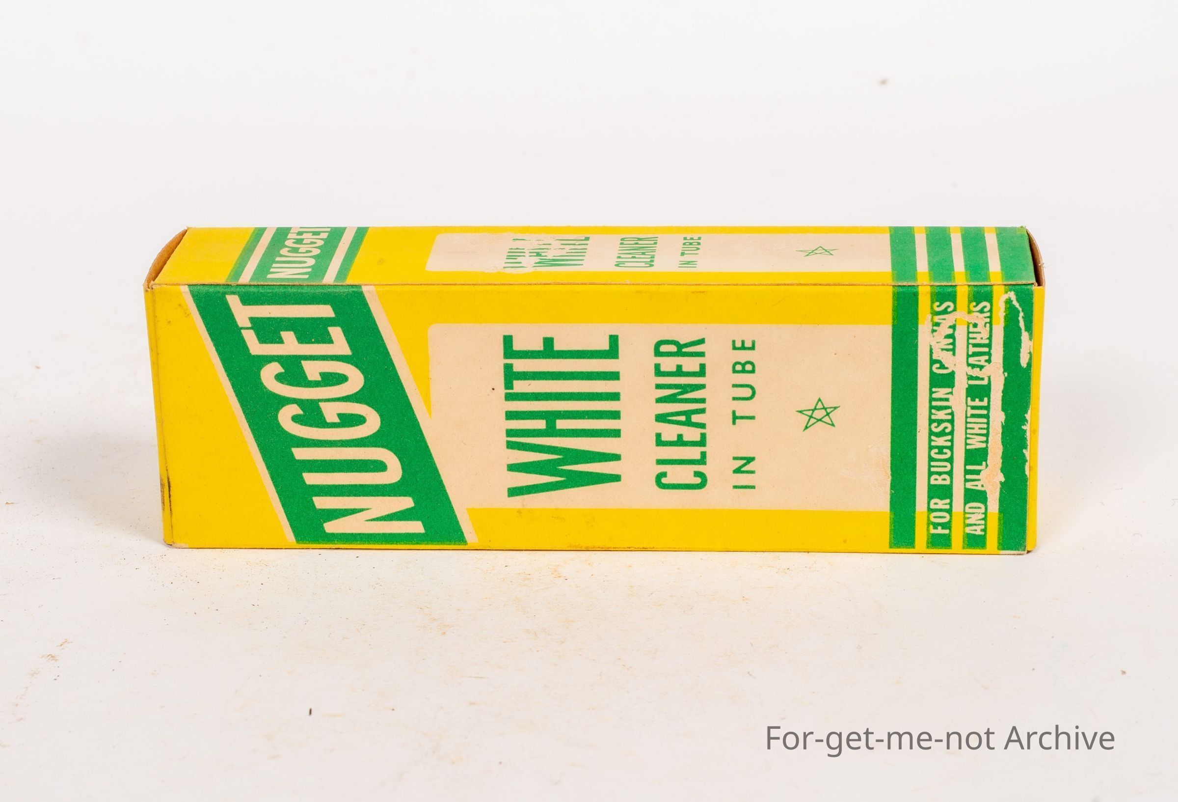 Cardboard box of leather cleaner, Nugget, white cleaner in tube for buckskin, canvas, and all white leathers. A Nugget product
