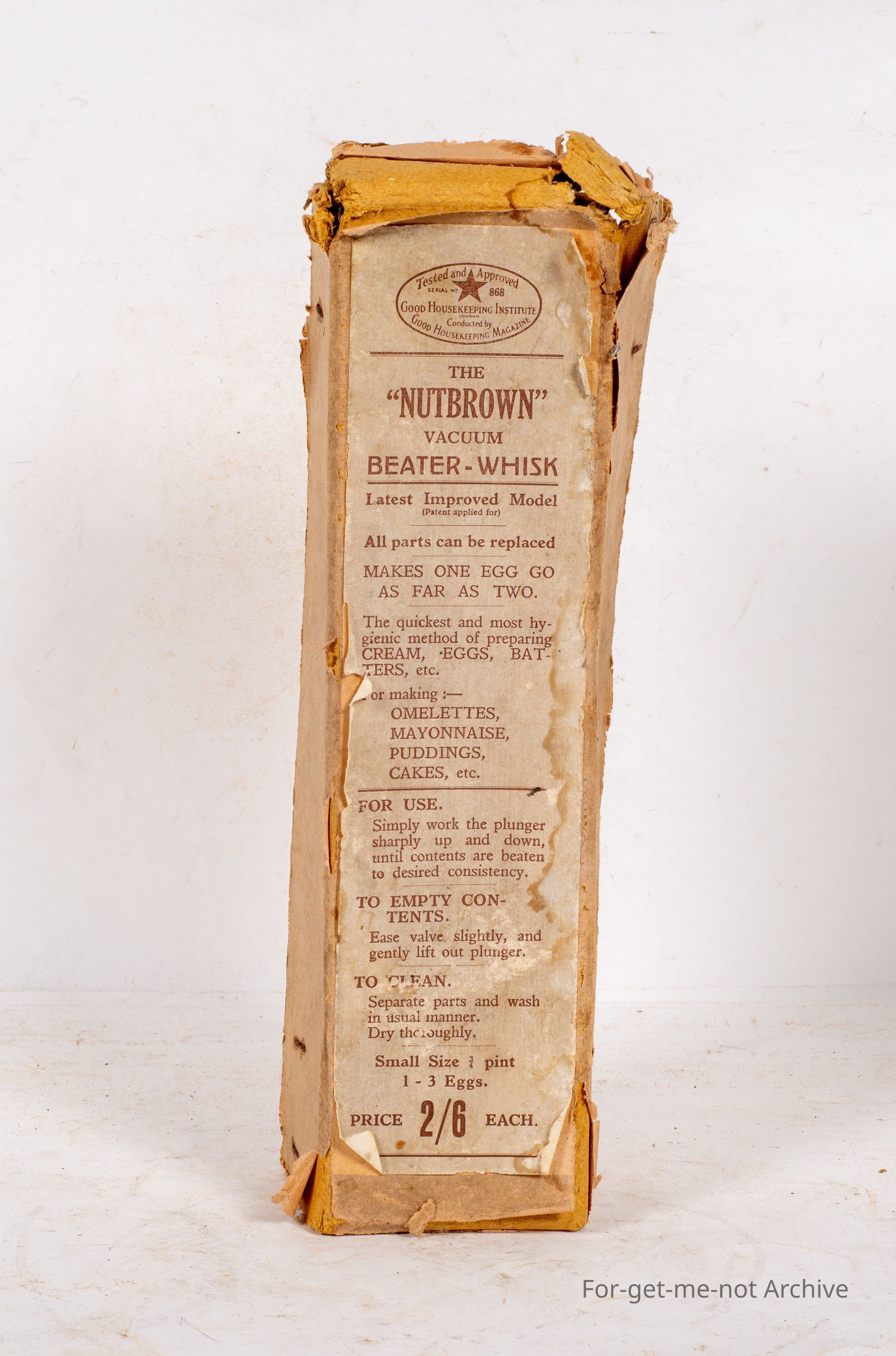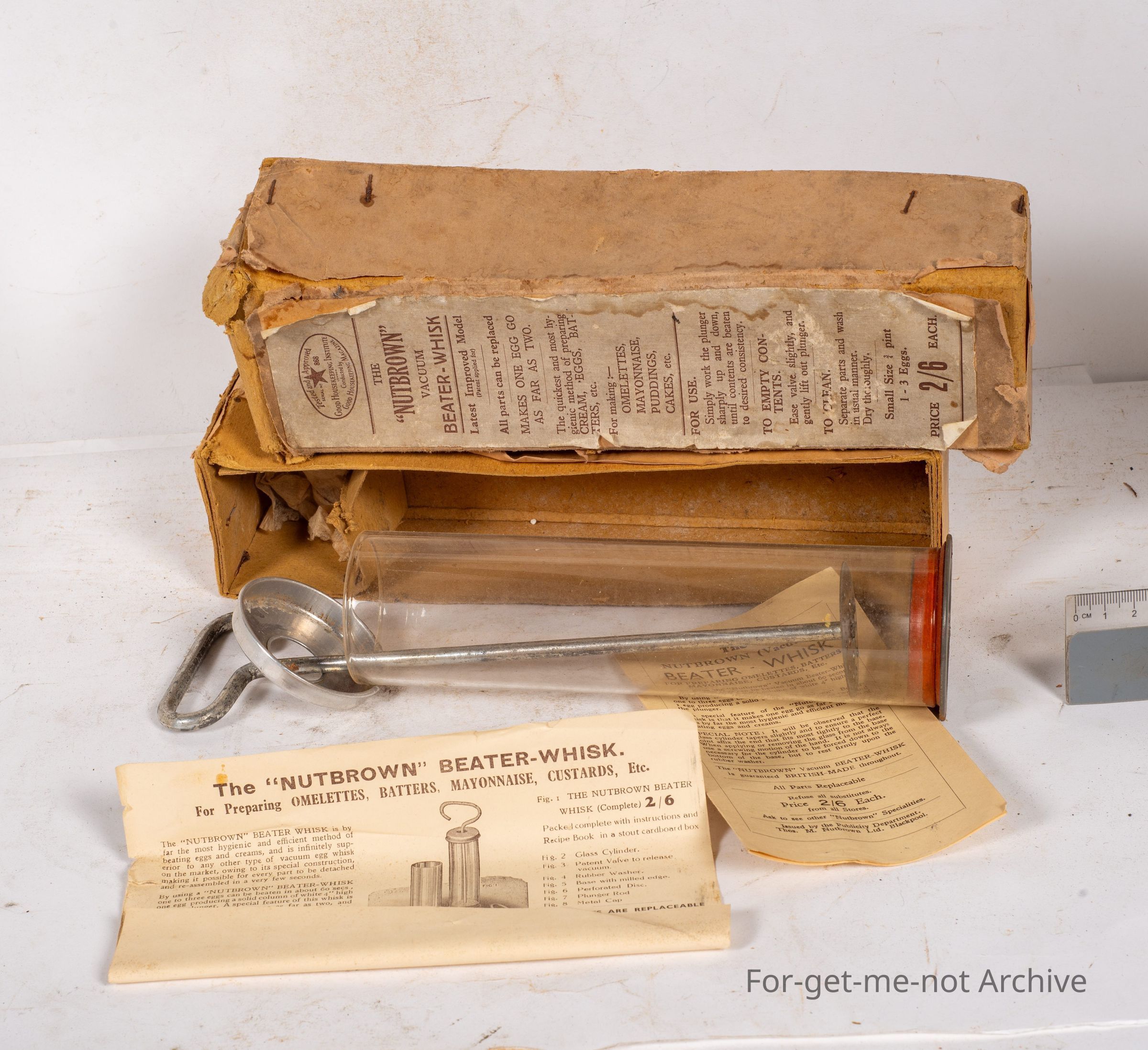 This is the packaging box for the Nutbrown Vacuum Beta Whisk. Makes one egg go as far as 2 for making omelettes, mayonnaise, puddings, etc. Price, 2 and 6 each. The nut brown whisk is in an unused condition in the box with the instruction booklets with it.Collection
