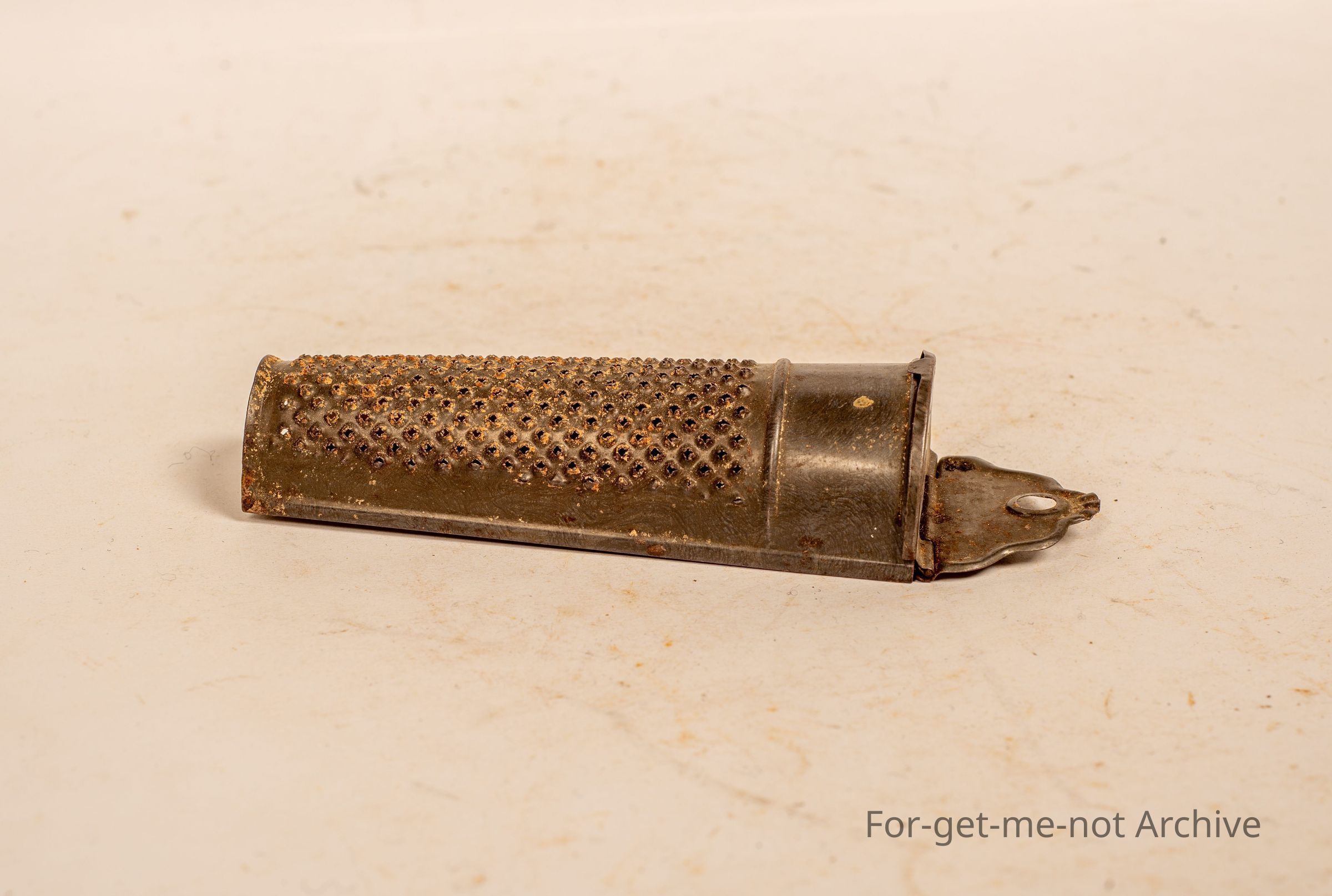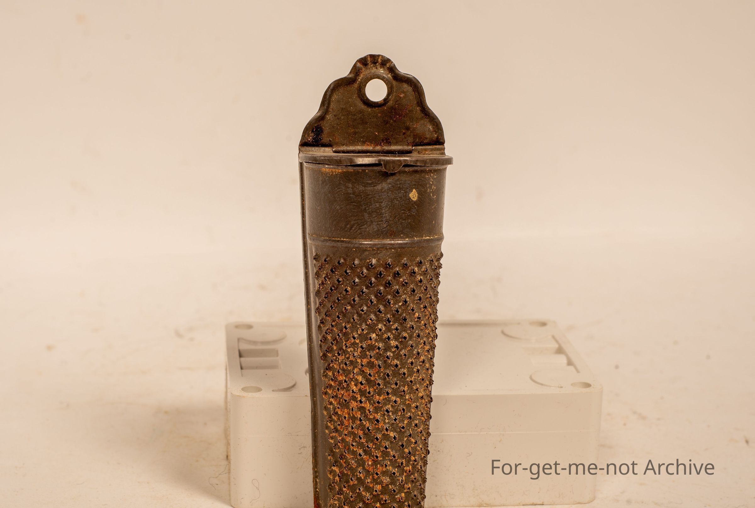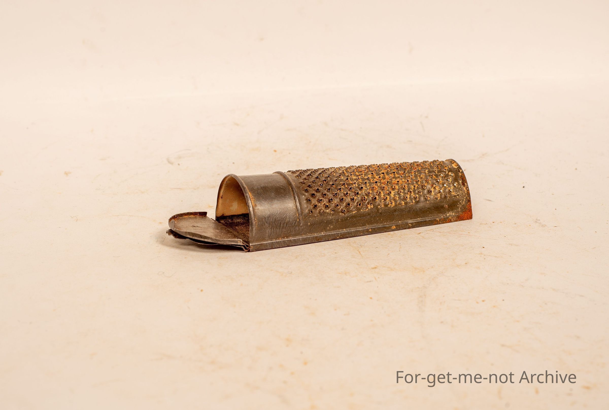 Another nutmeg grater. Little storage piece at the top. The grater catches, the nutmeg, all tin, no stamping