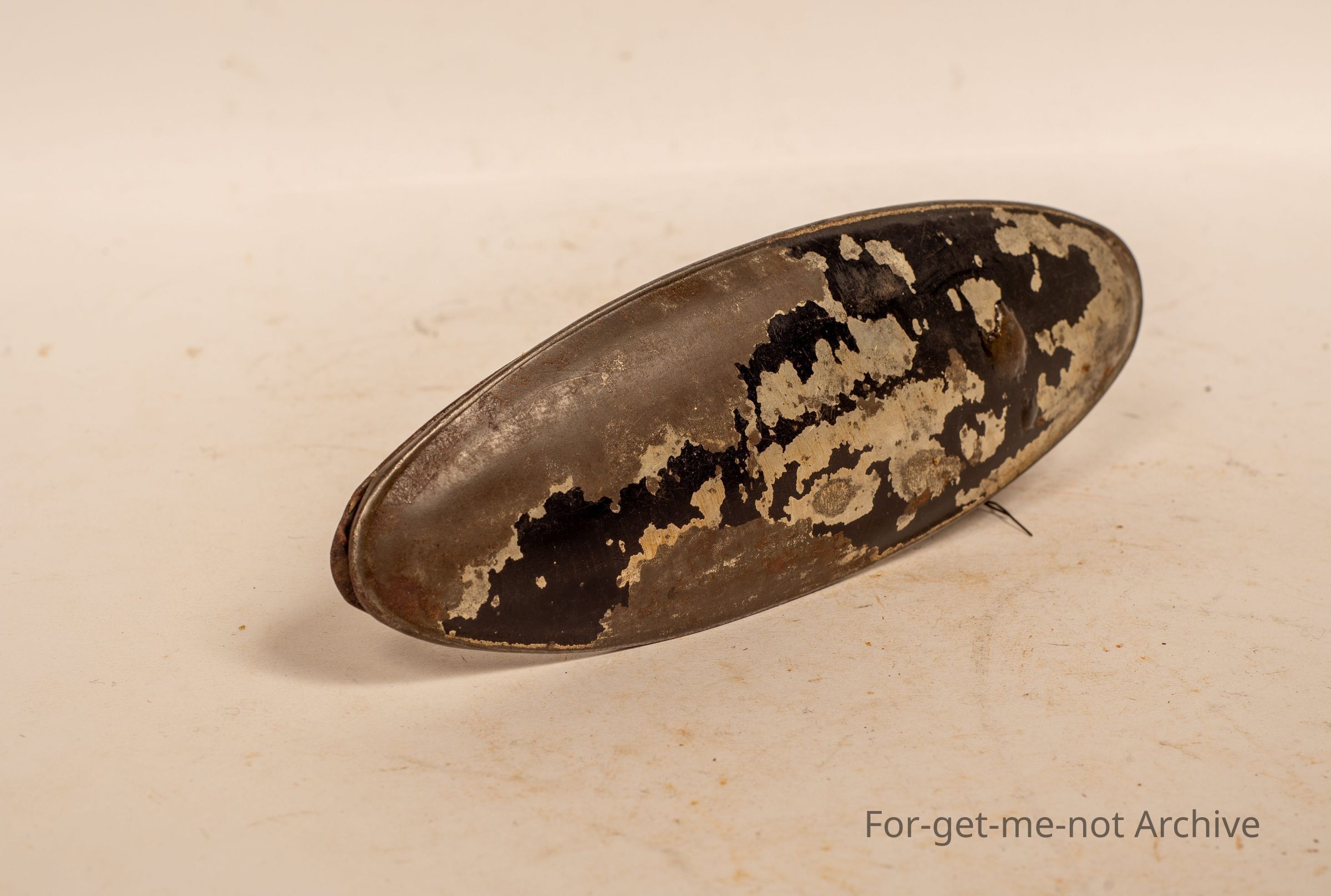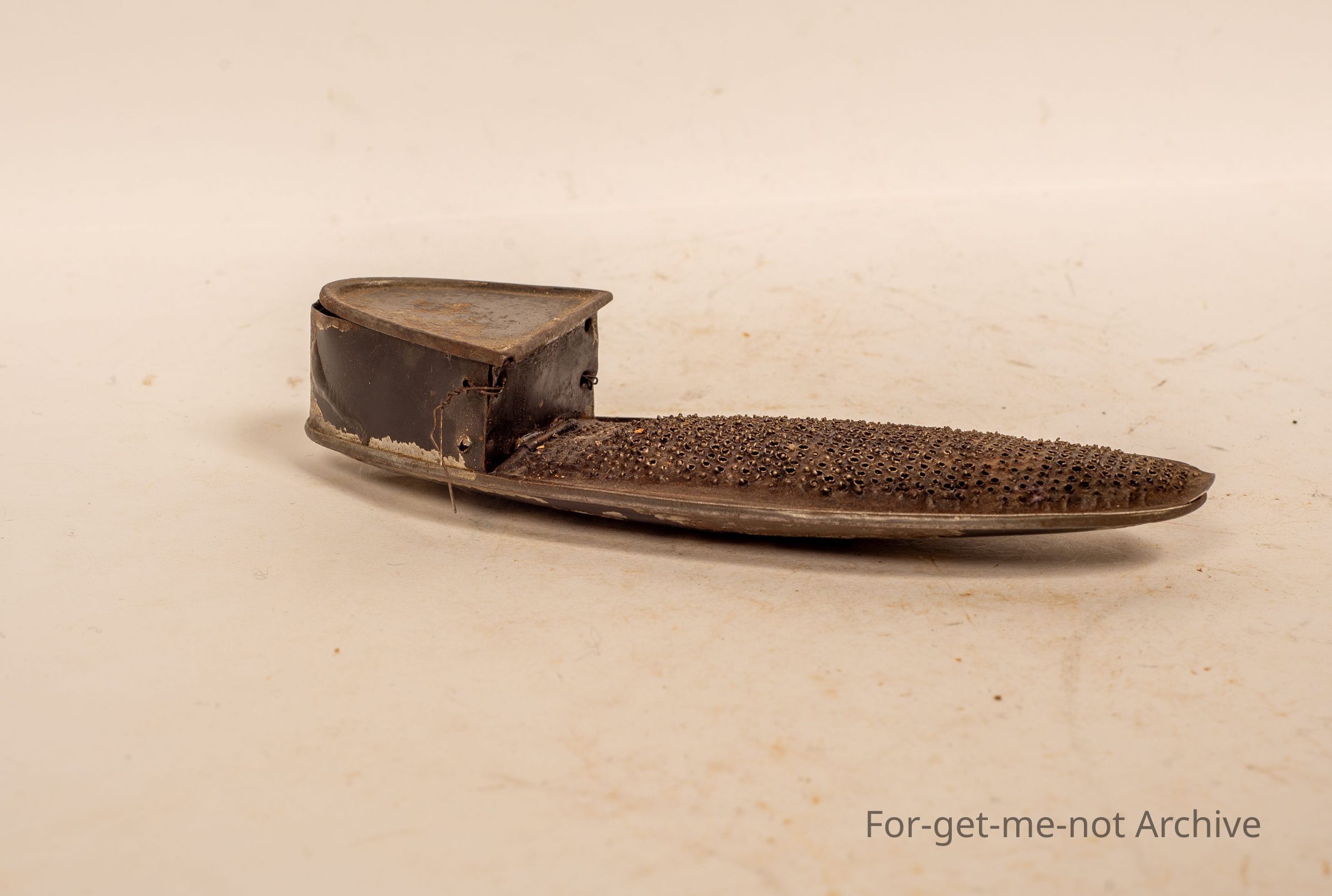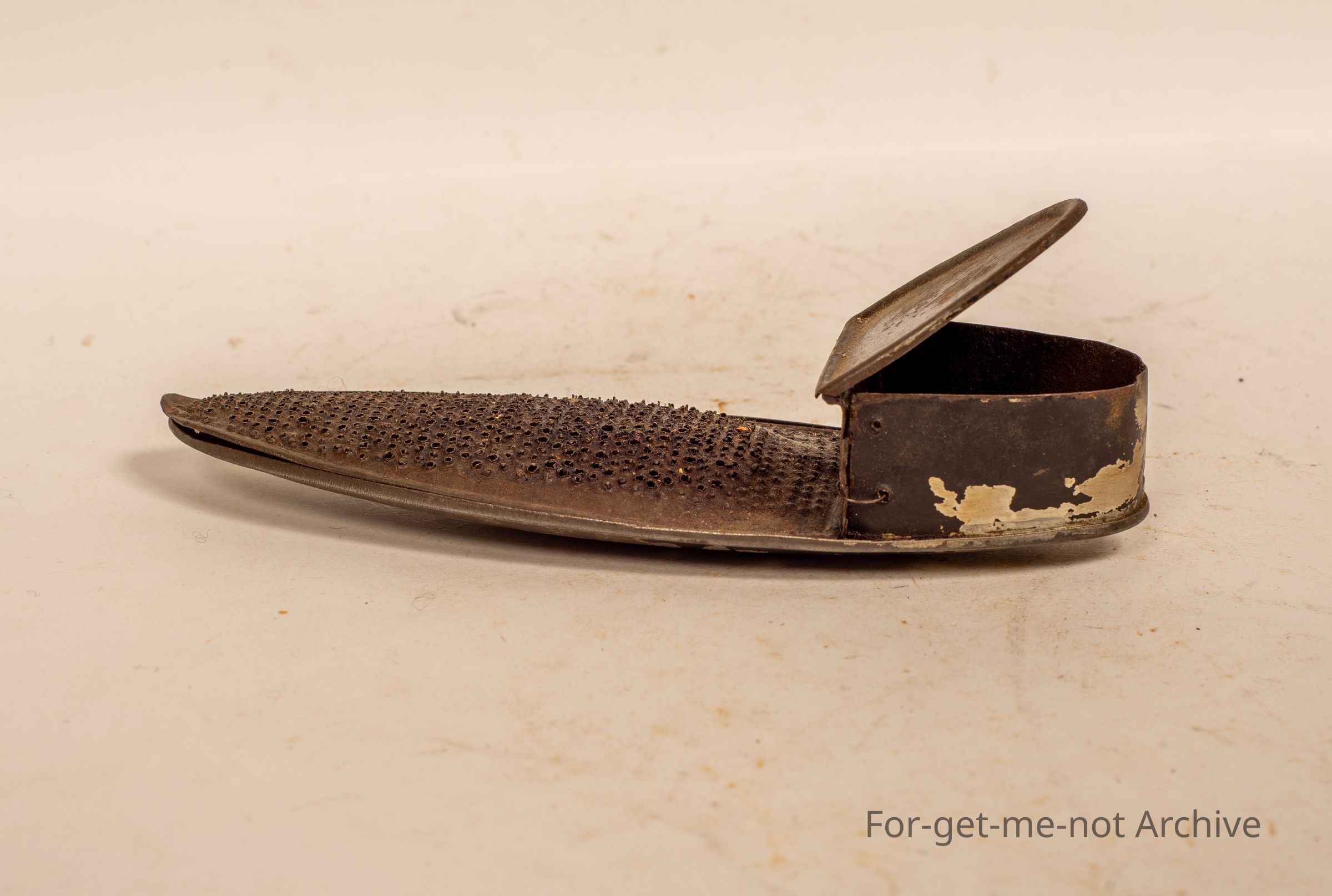 Is a tin boat shaped nutmeg grater. The sieve the boat shape under the sieve catches the ground nutmeg and the nutmeg container is in the end.