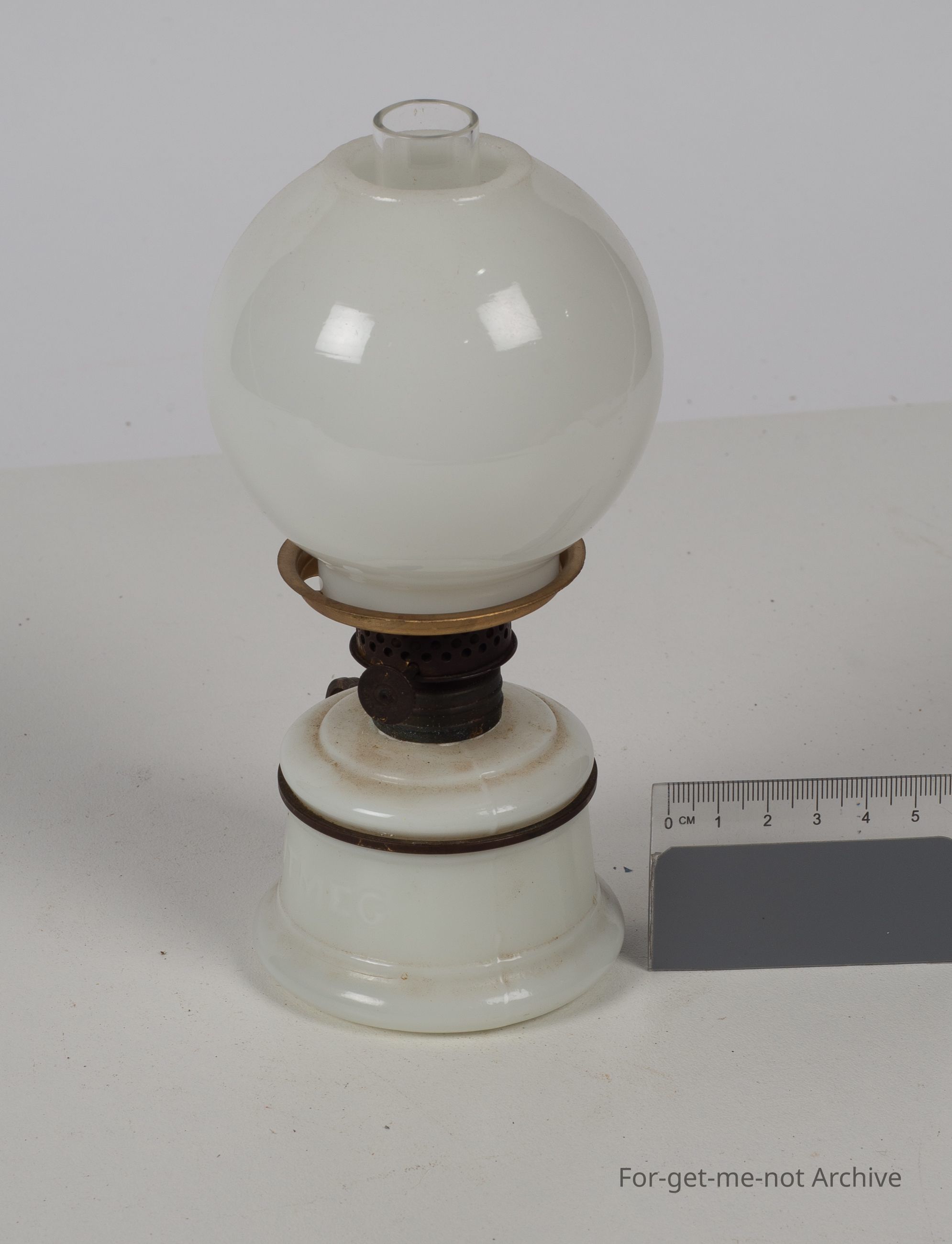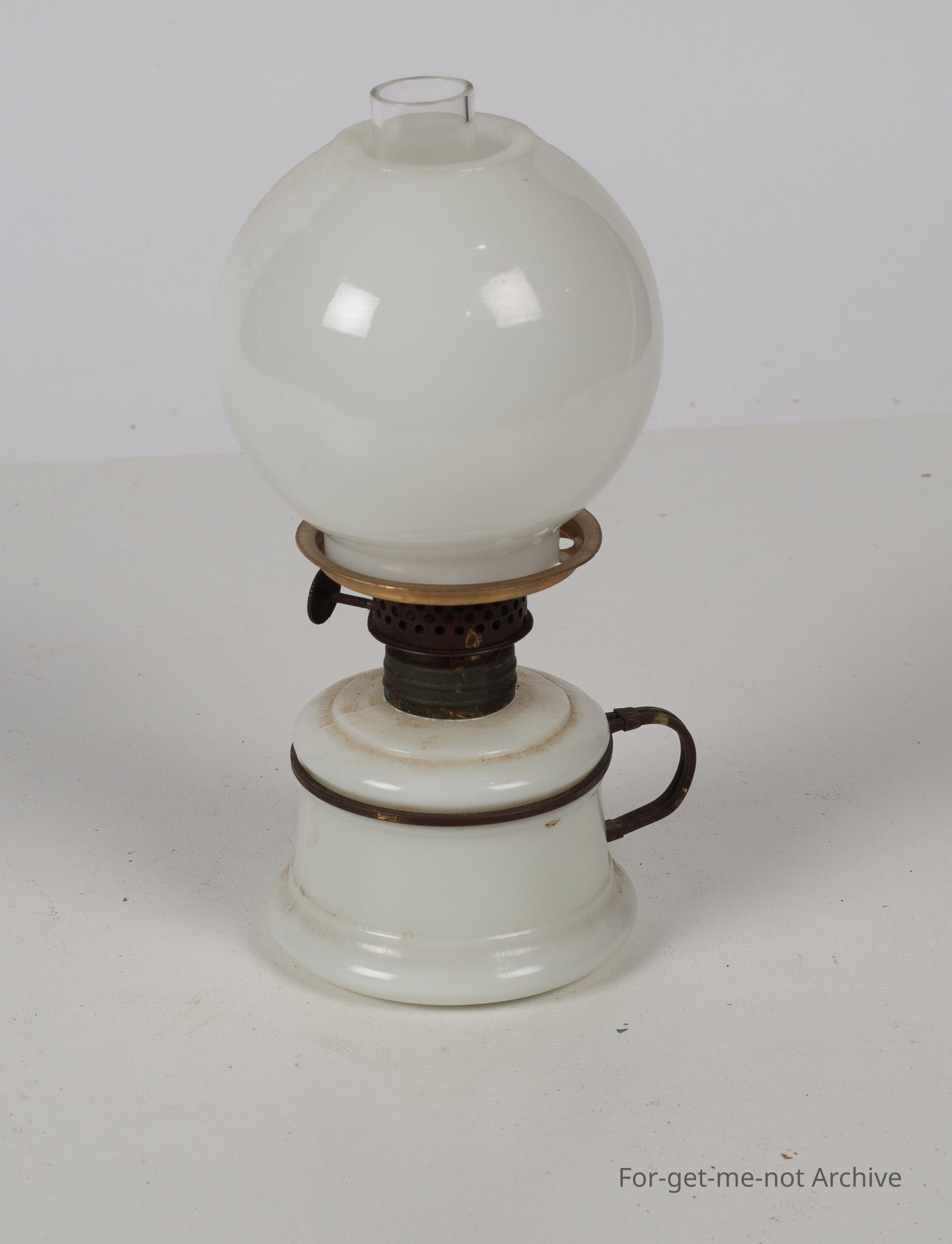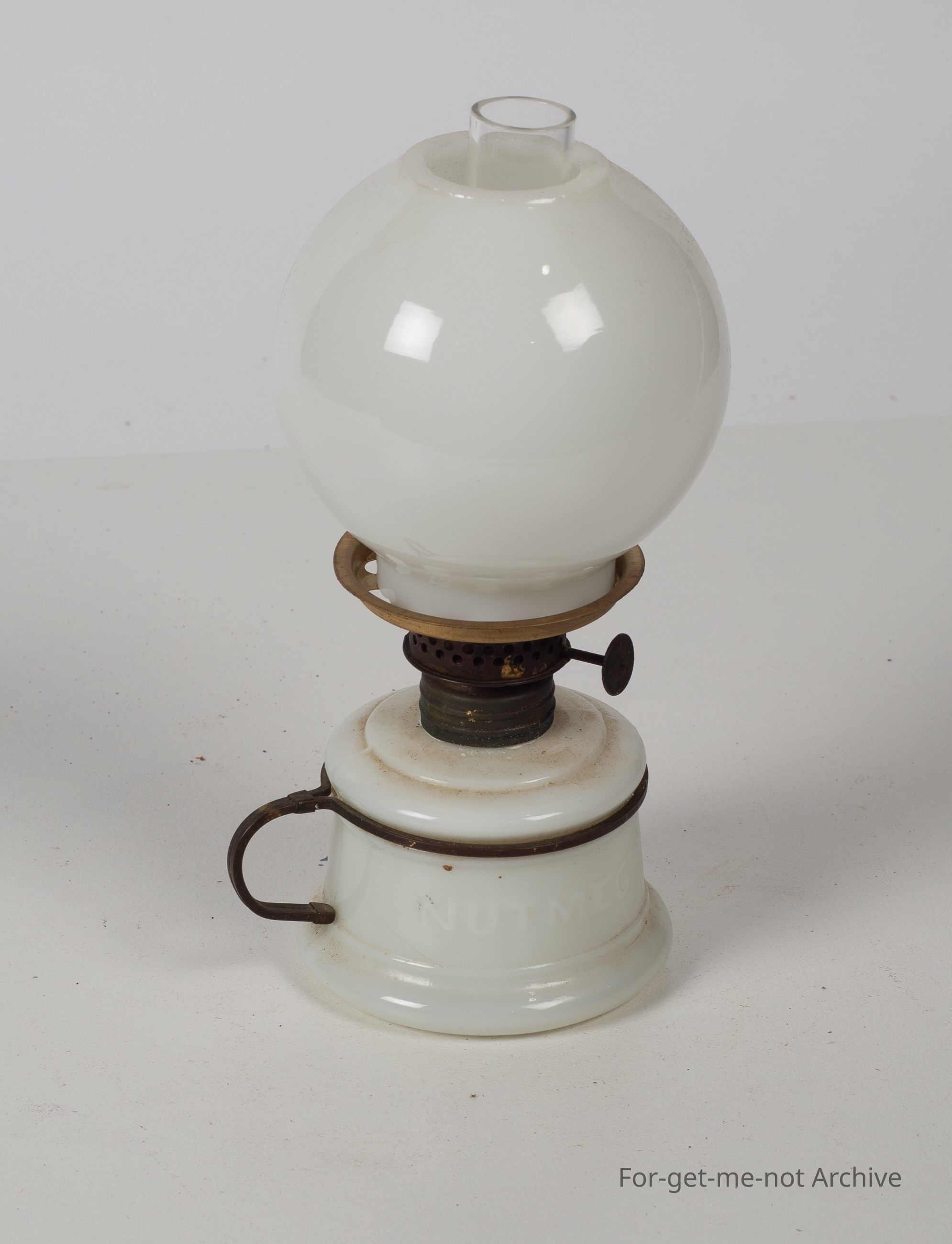 White nutmeg lamp with wire handle and white shade globular.