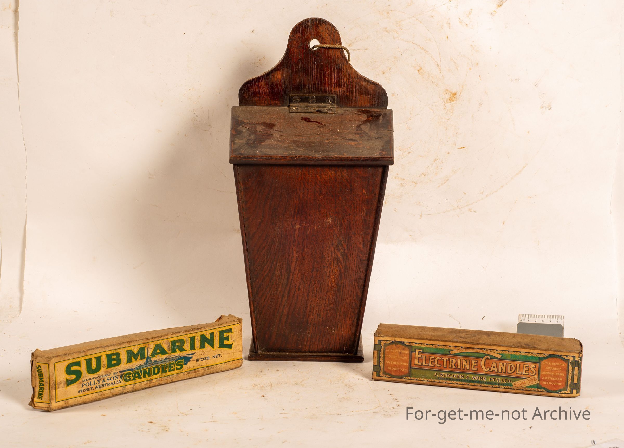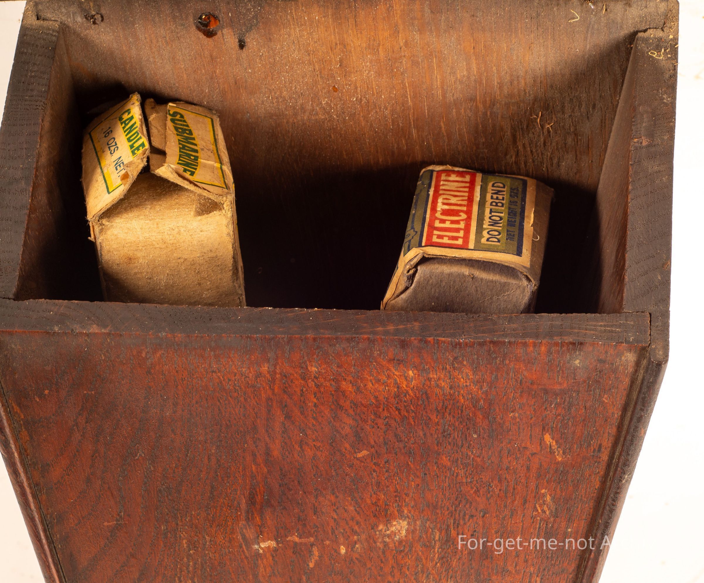 This is a beautiful tapered oak candle box. These were used or found in the more, affluent homesteads. Hard to find, this box has the hinge lid with 2 very early boxes of candles intact. These are far scarcer than the tin ones that we used in, more common use.Collection