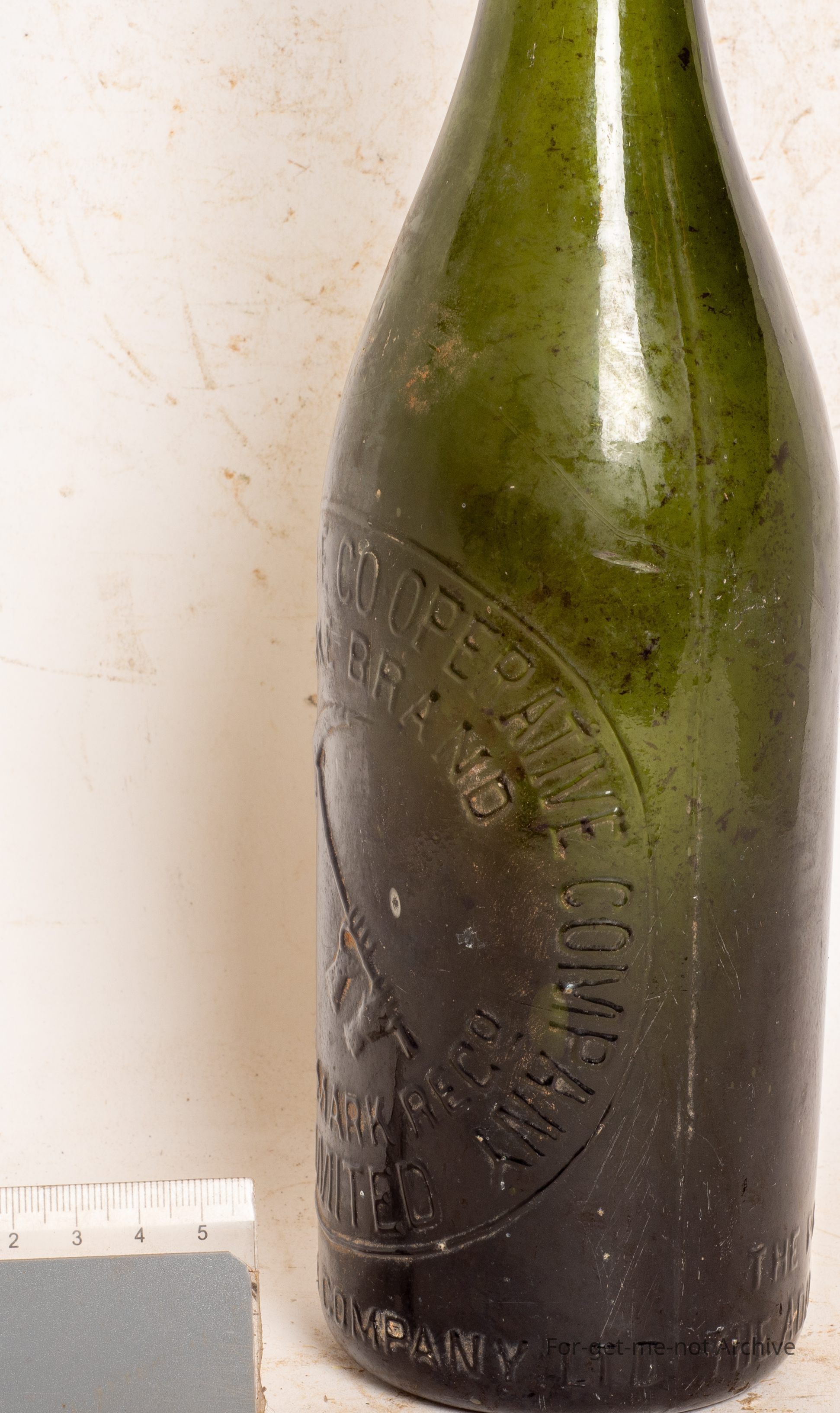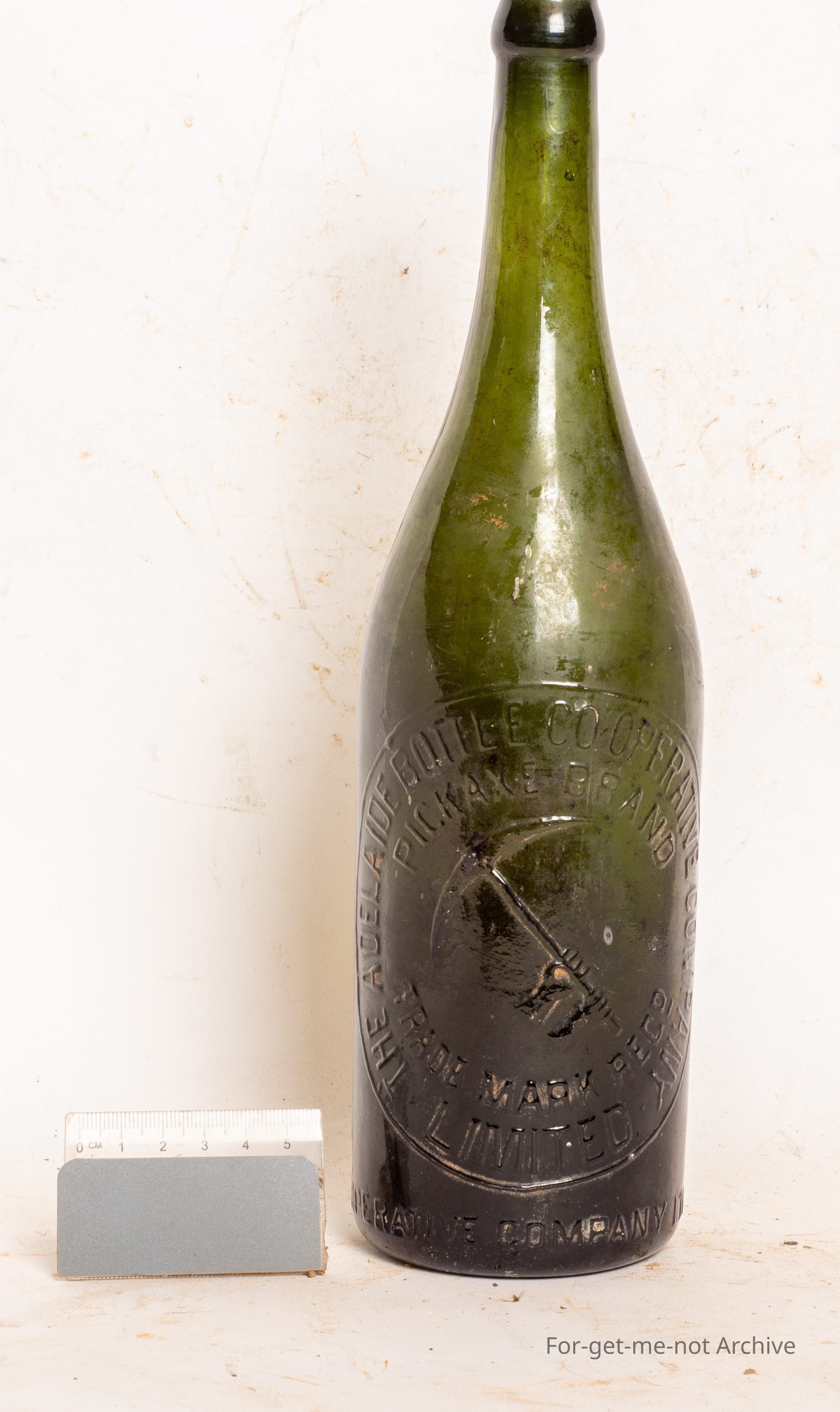 This is a beautiful deep green of the Adelaide Bottle Company Cooperative with the pick handle image. Lovely condition.