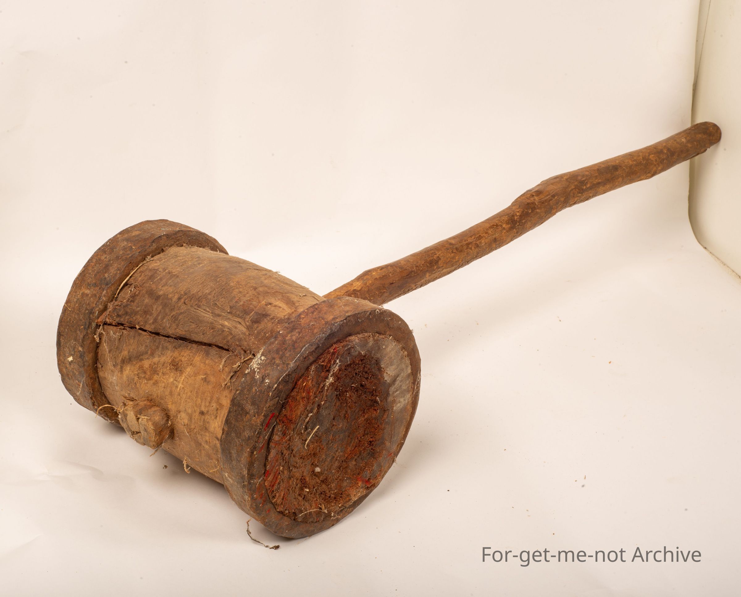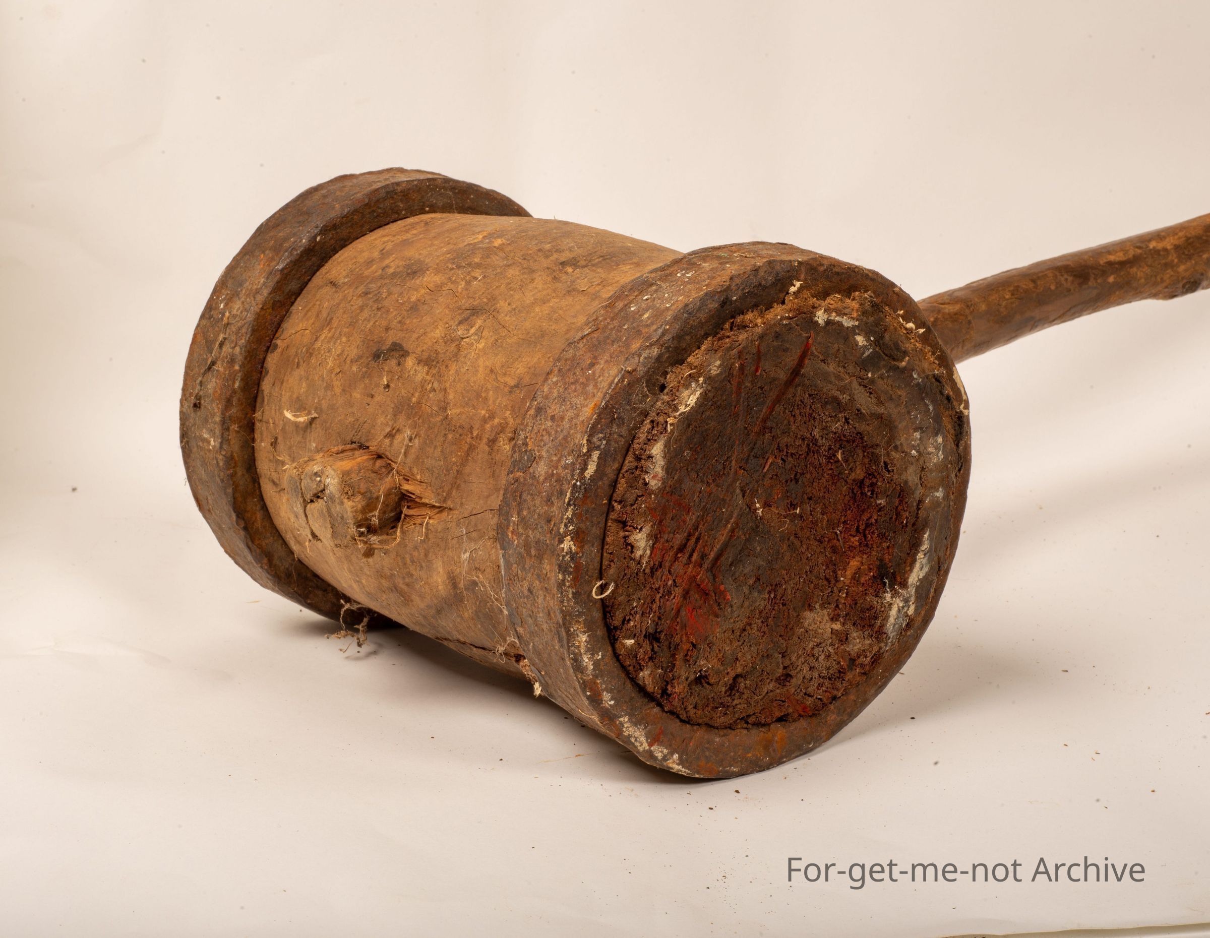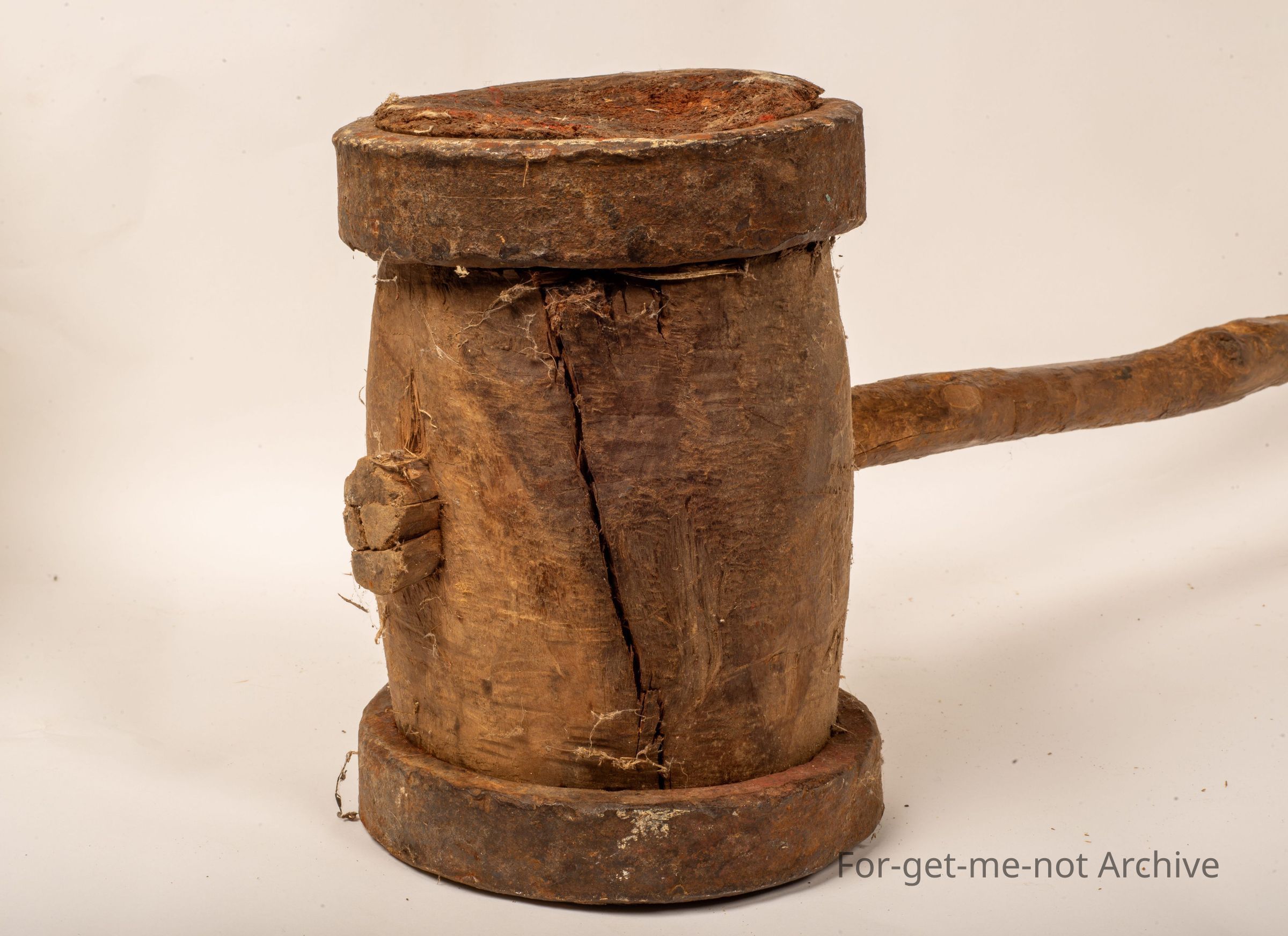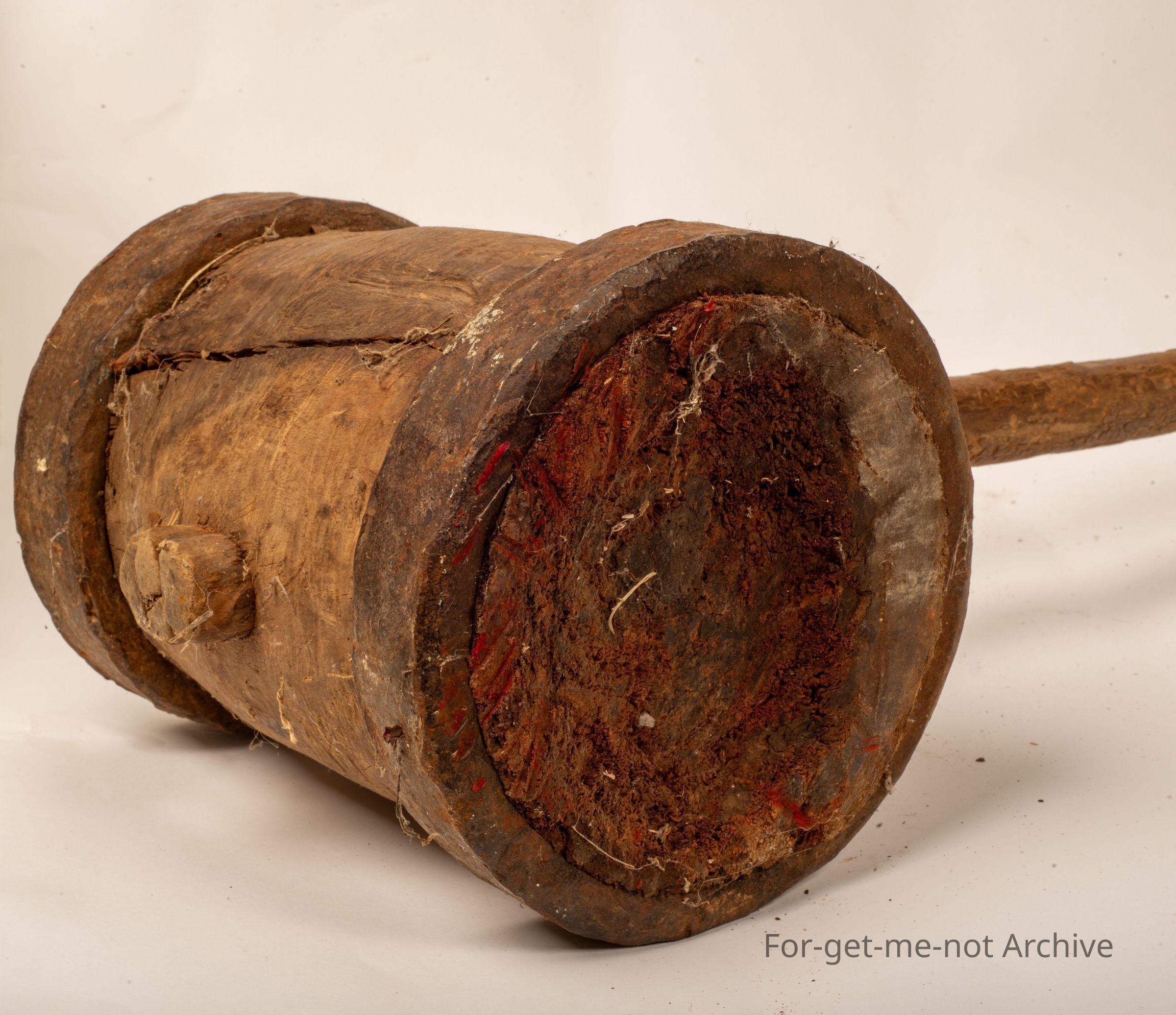 Depression era. This piece is a mould, which consists of a heavy piece of wood with iron rings on either end to keep it from splitting apart. The blacksmith made rings with a wooden handle that looks like a bush, pole, absolutely wonderful piece.Collection