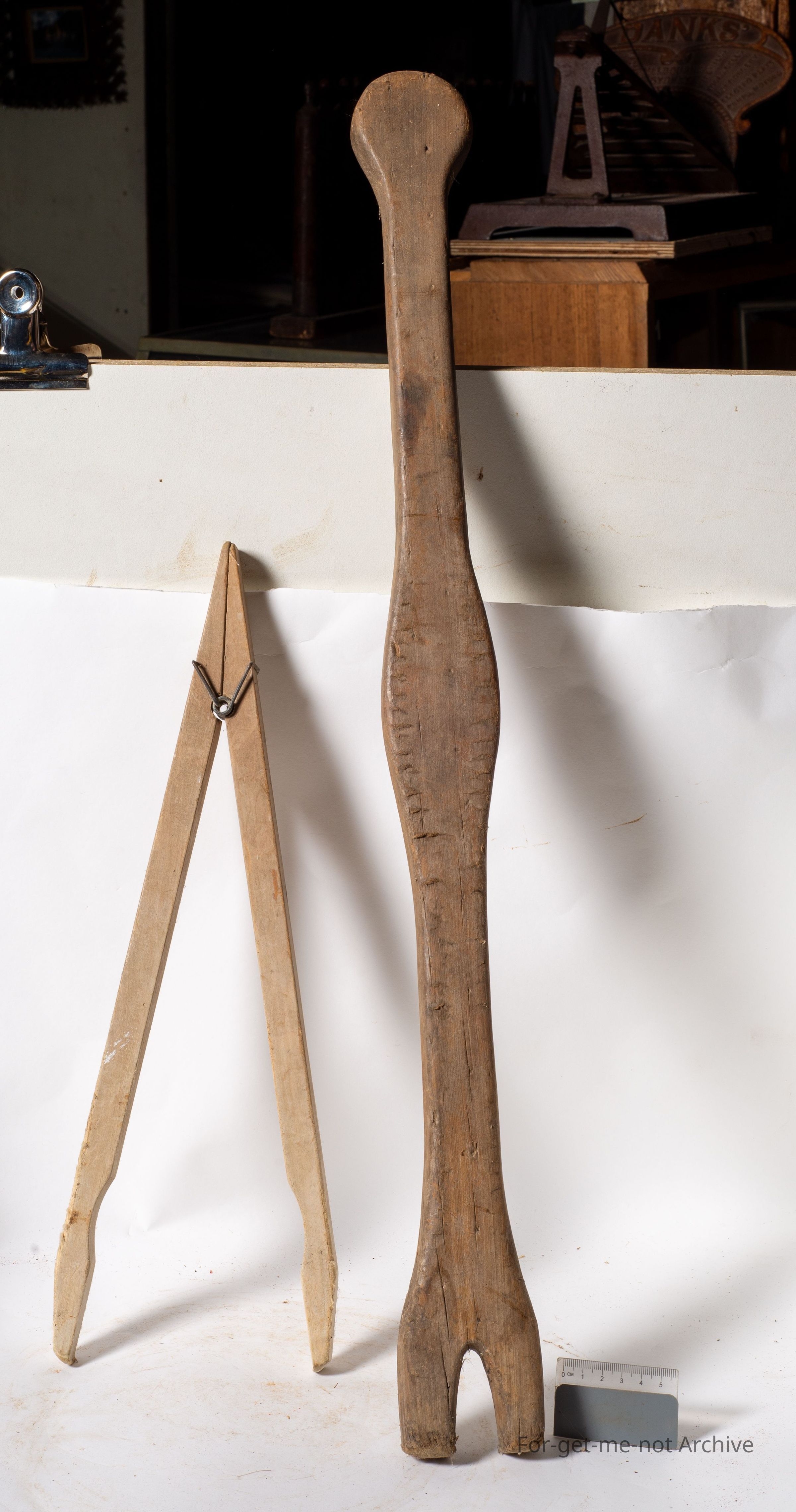 These are laundry related. One is, a piece of wood for either moving clothes around in a copper or perhaps lifting them out of the copper. The other one is like a, pair of pinchers, spring loaded. Once again, for perhaps lifting light material from a boiler. Plates were often boiled.Collection