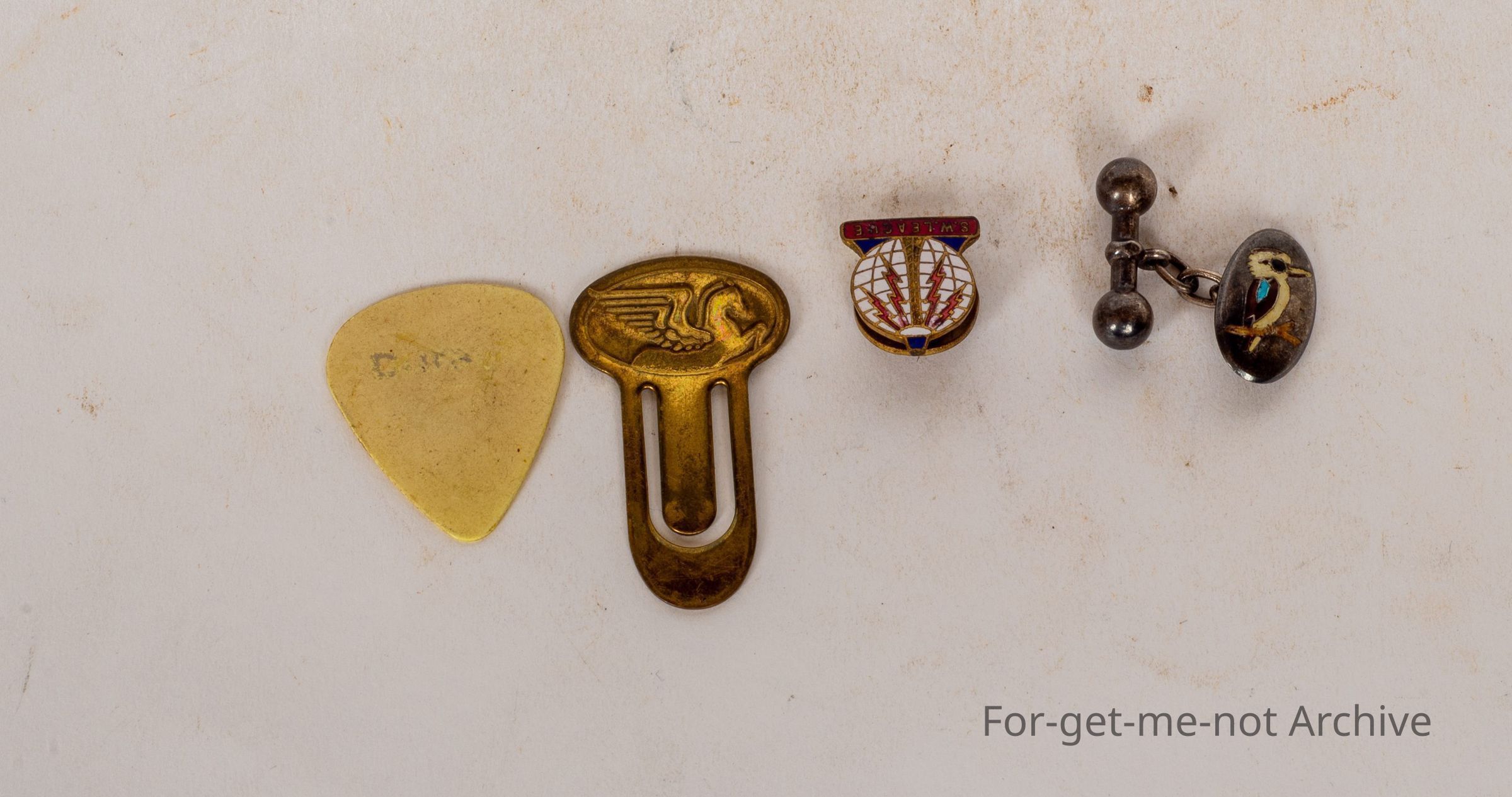 This is a group of 4 obscure little pieces. 1, a plekton. 2 is a, collar stud, a cufflink at least with a mag, kookaburra on it. 3rd piece is maybe a bill holder. Not sure. 4th piece, a little enamel badge for SW League, which was a kids radio club.Collection