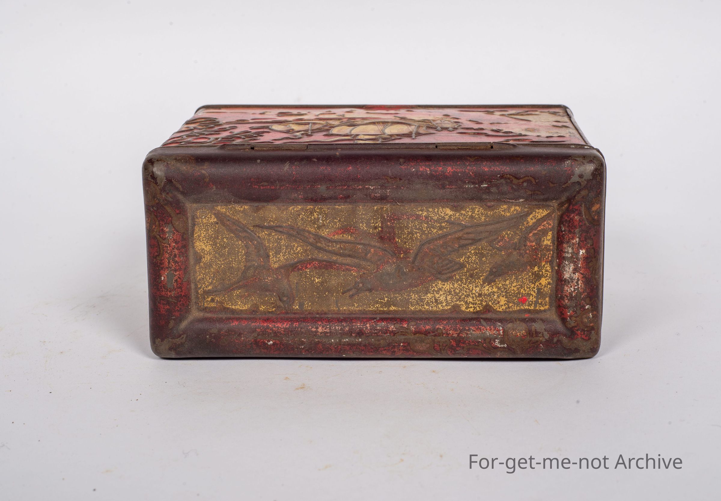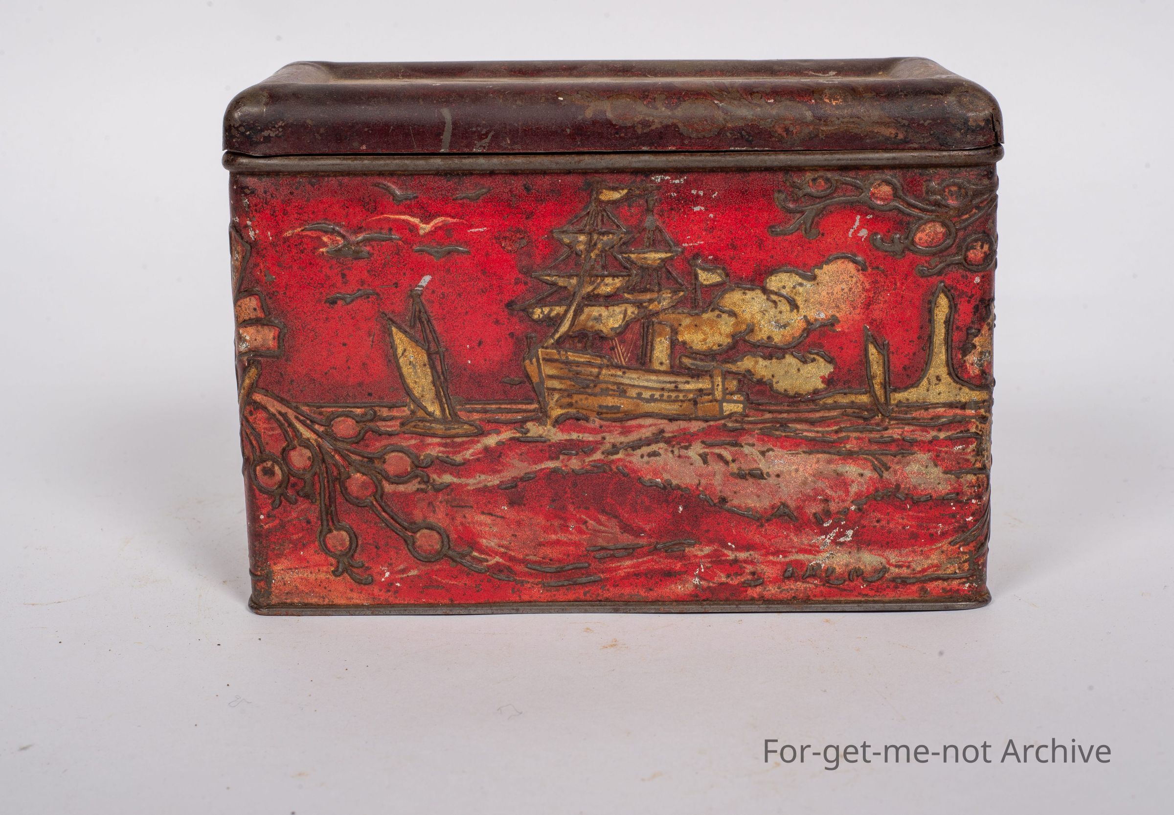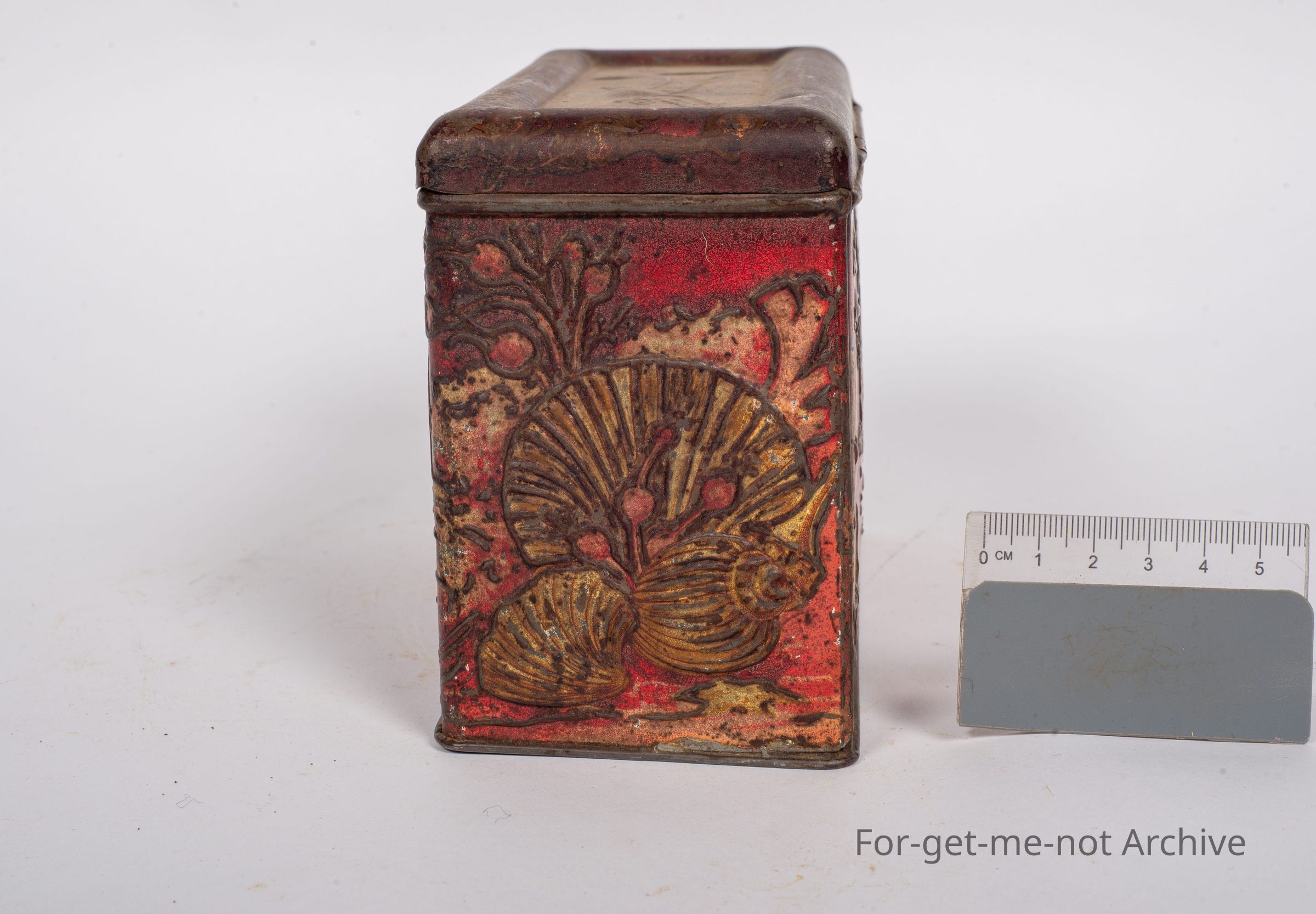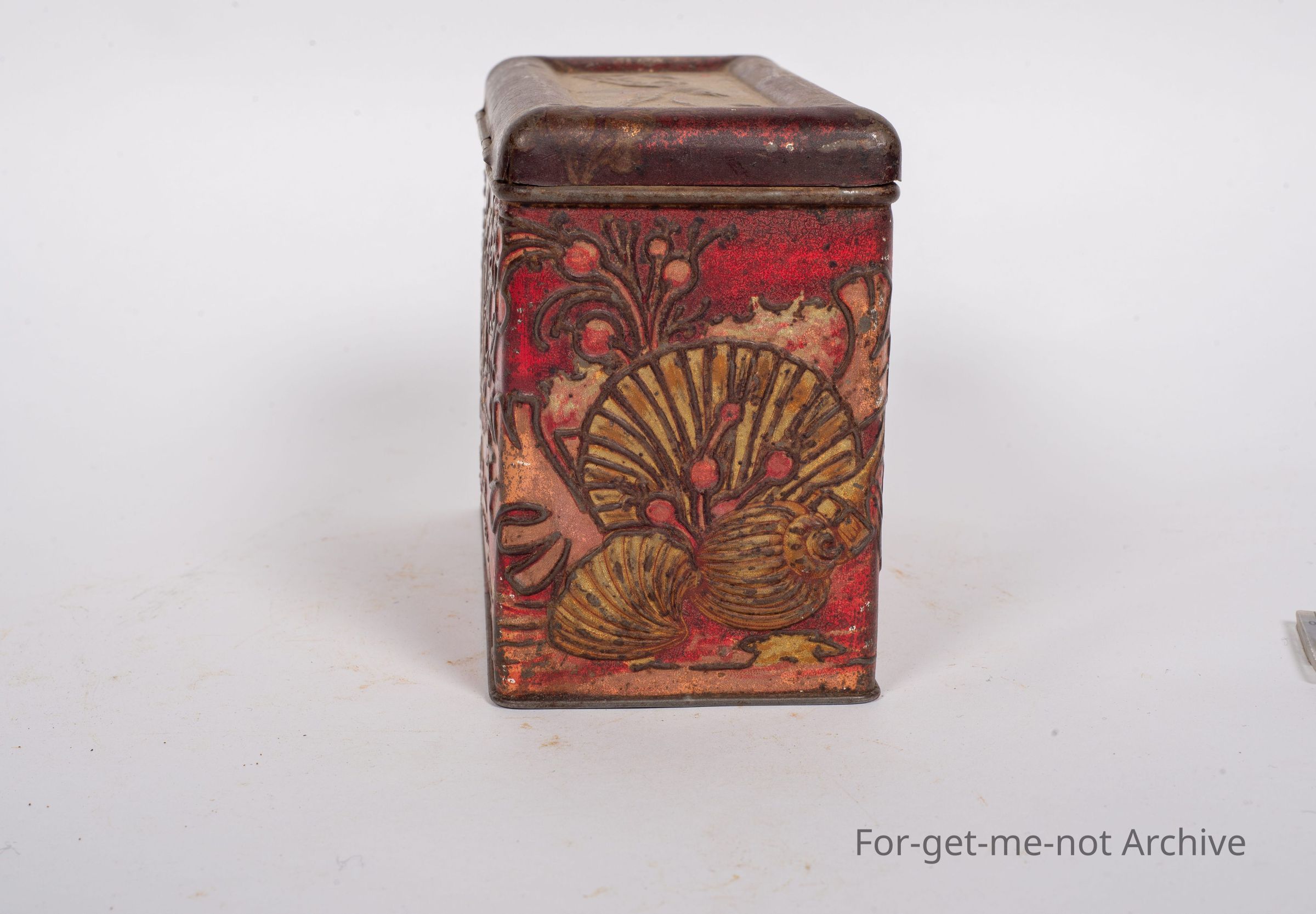Another obscure tin, beautifully embossed with scene of, sailing ship shells, seagulls on the lid. No indication of what it's been, but possibly a tea tin,