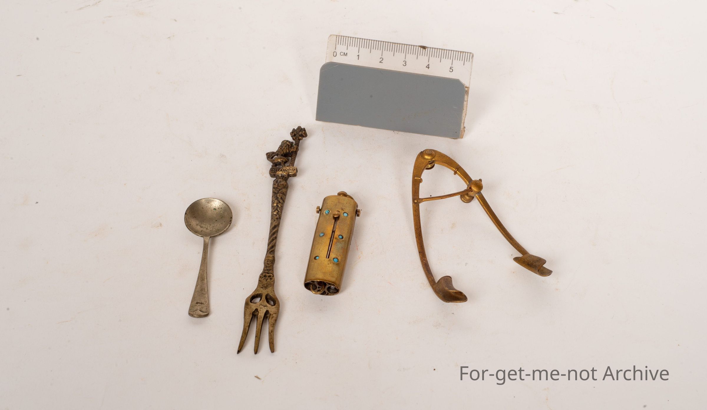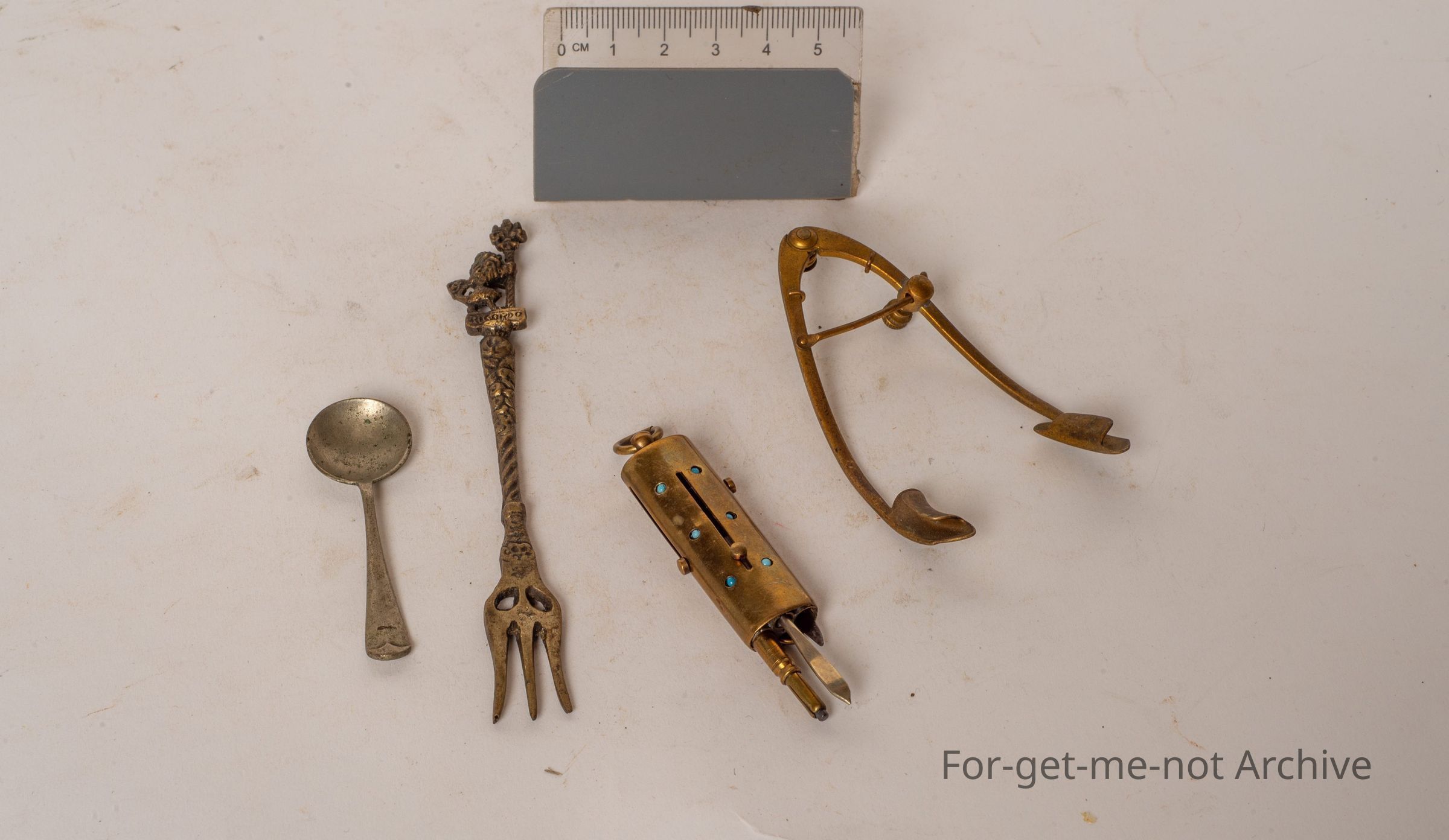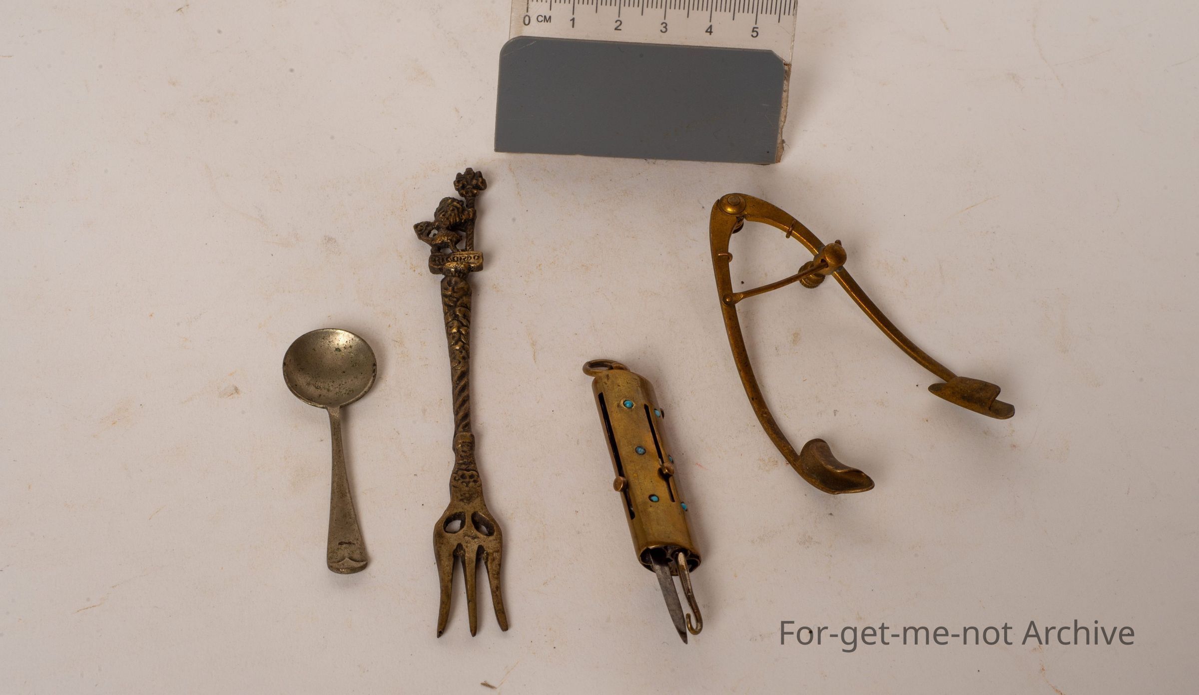 1. A spoon. 2nd item's a souvenir fork. 3rd item is a device to hold your eyelids open probably used, by optometrists. 4th item is a multi purpose tool used perhaps in a lady's handbag for maintaining their fingernails. There's a pencil, a boot hook and a nail file.Collection