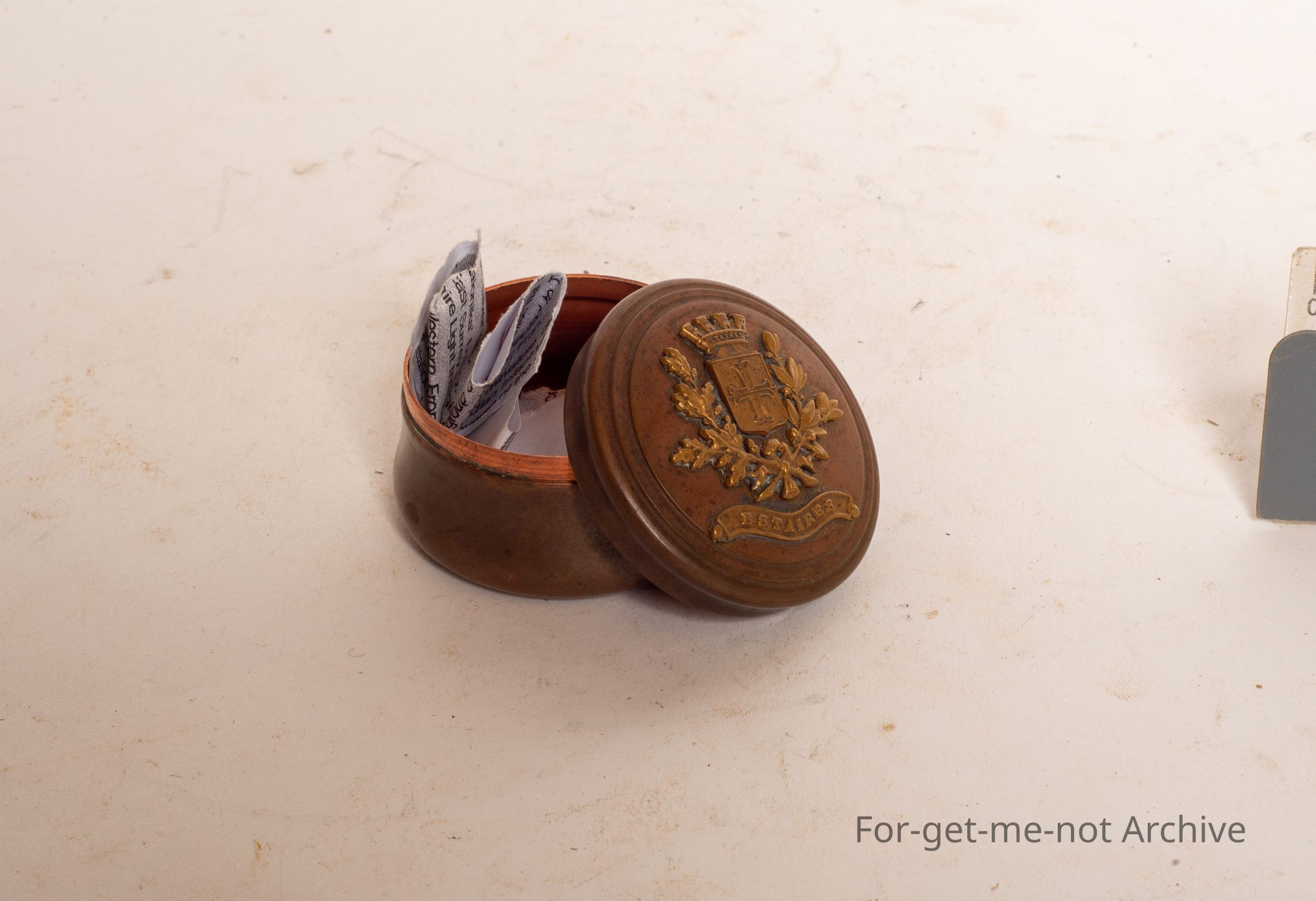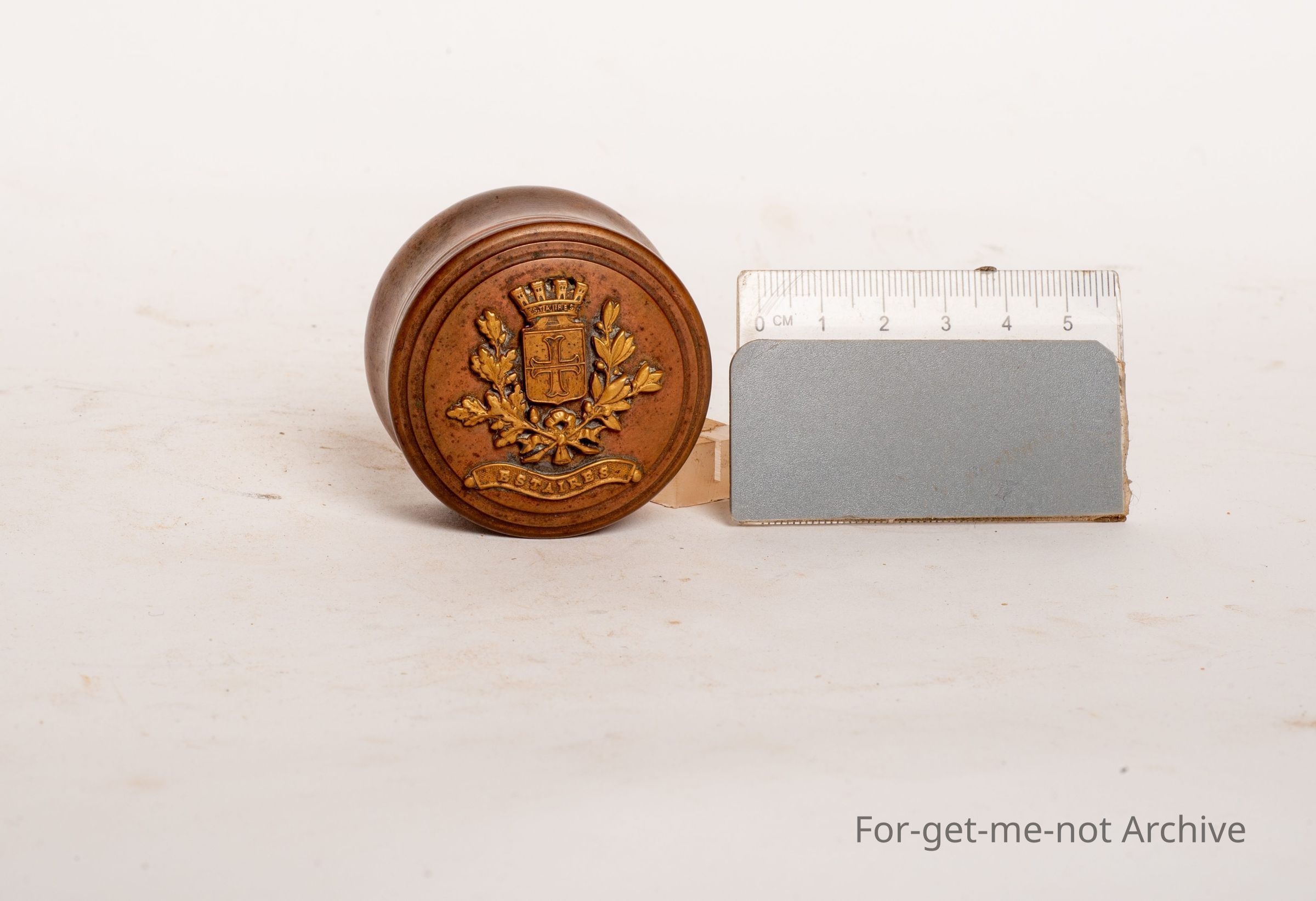 This has been described as an officer's snuff box. Little coat of arms on the top. Beautifully made.