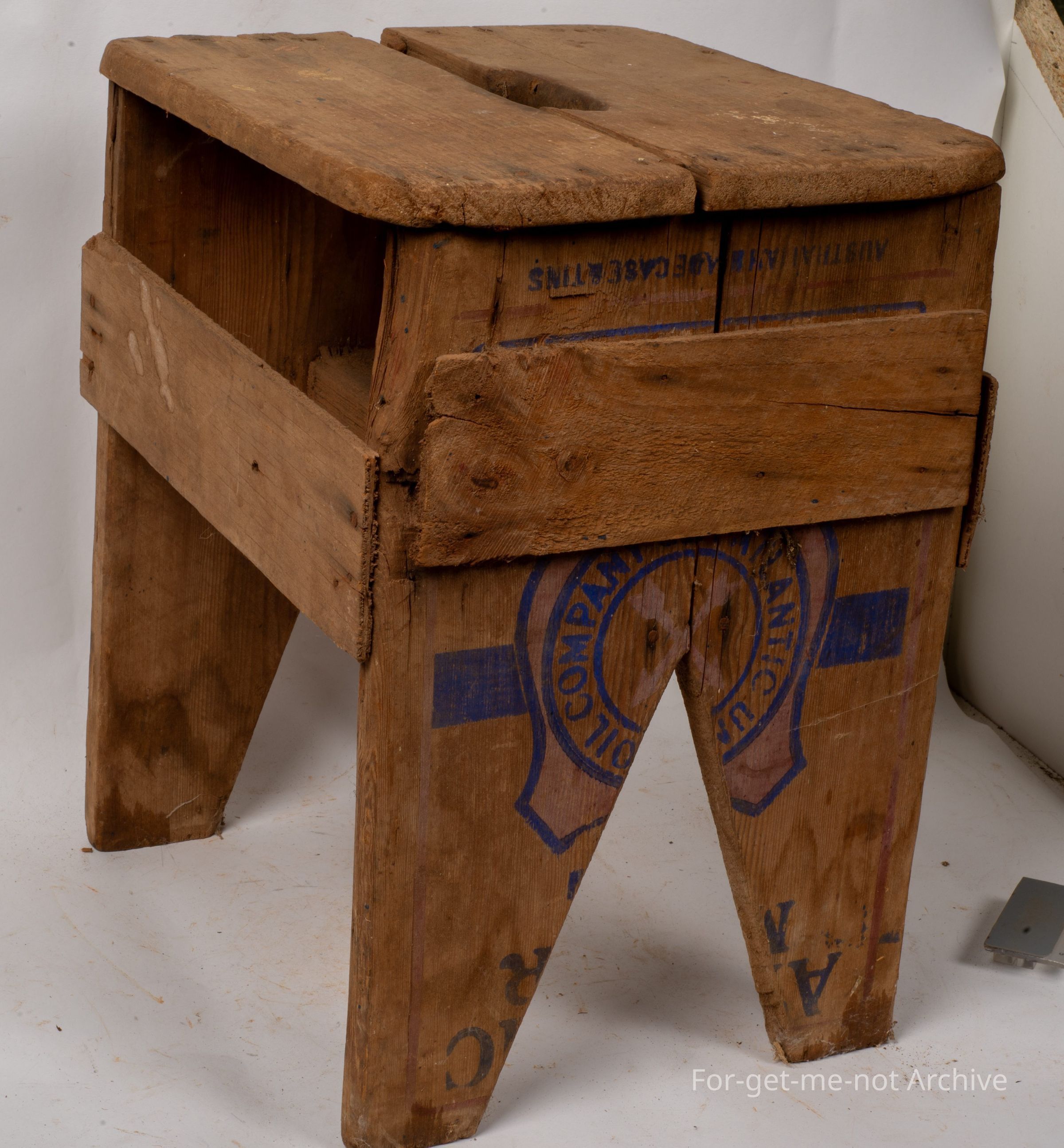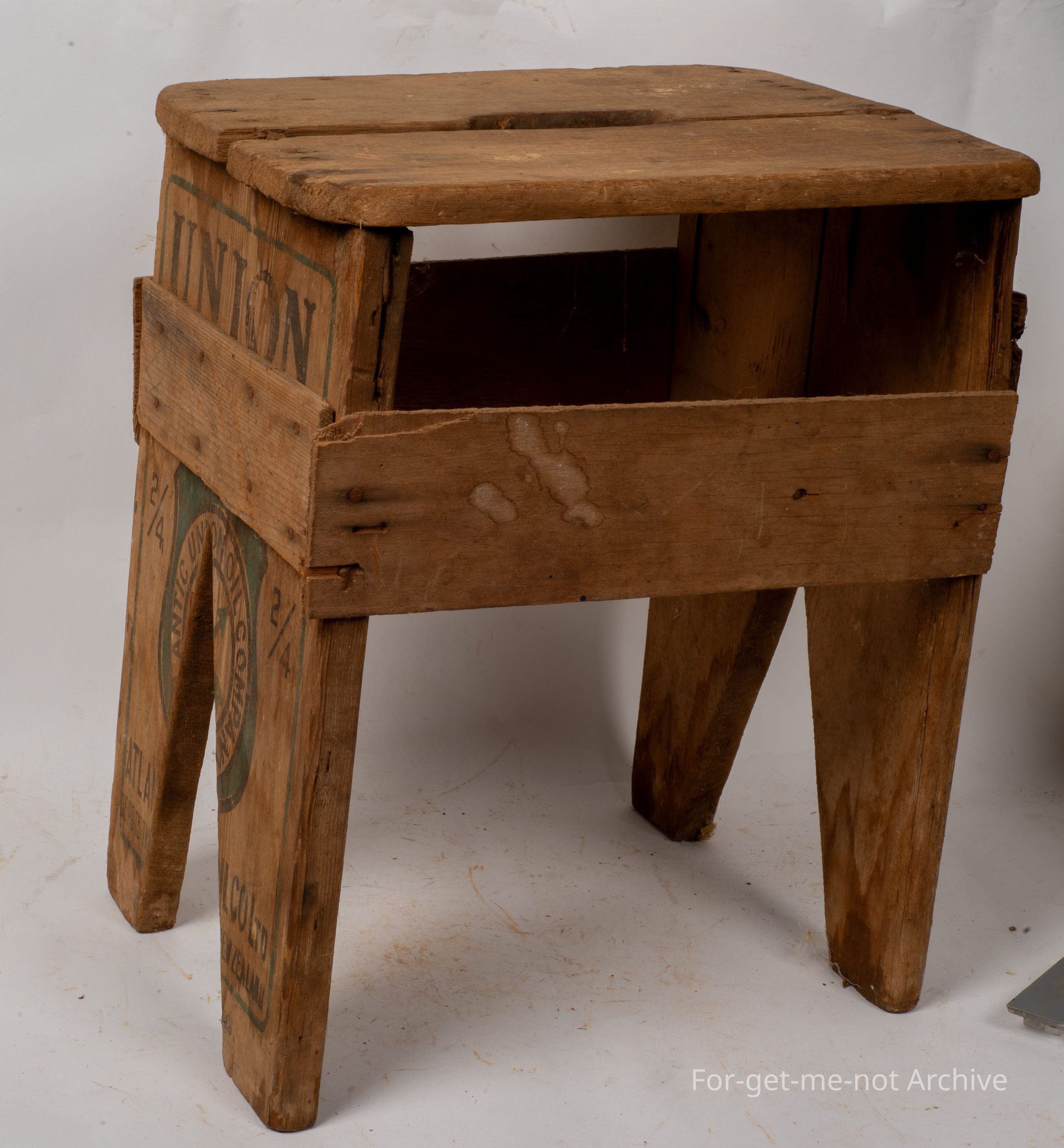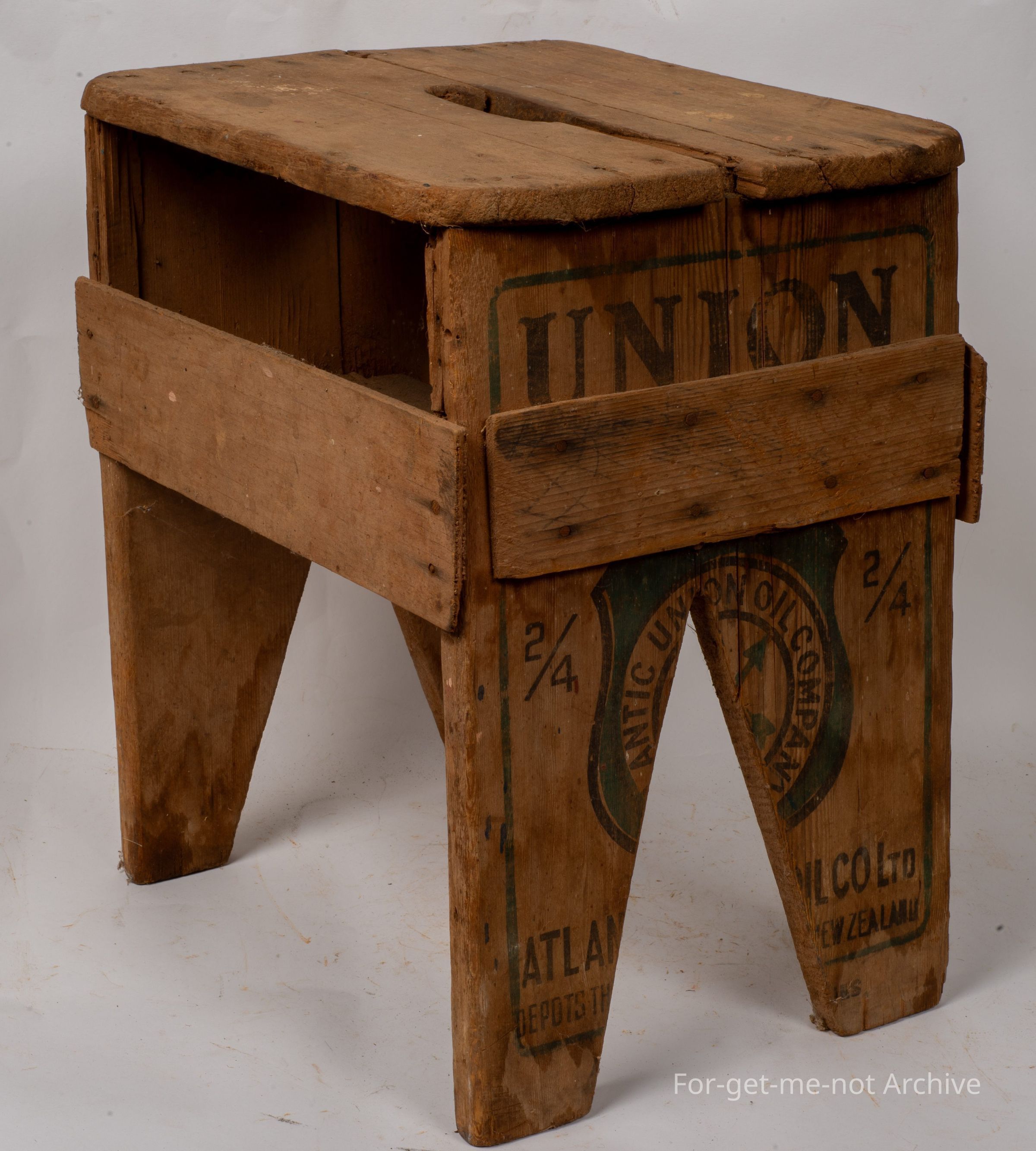 A lovely Depression era stool. This has been made from an Atlantic Union Oil Company box. Australian case and tings turned into a stool. The other end is Union Atlantic Union Oil Company, so it's a different end for both ends. Beautiful little piece.Collection