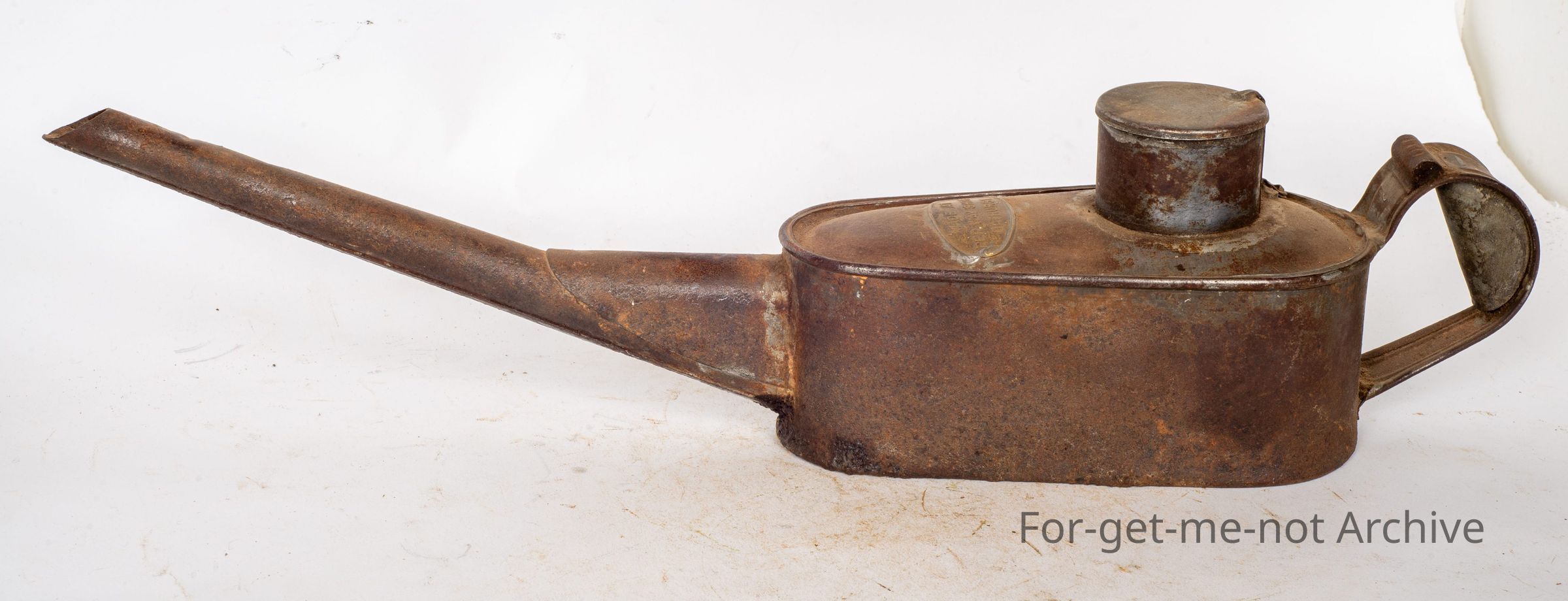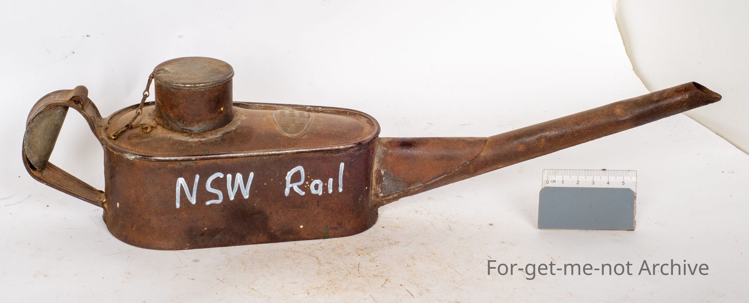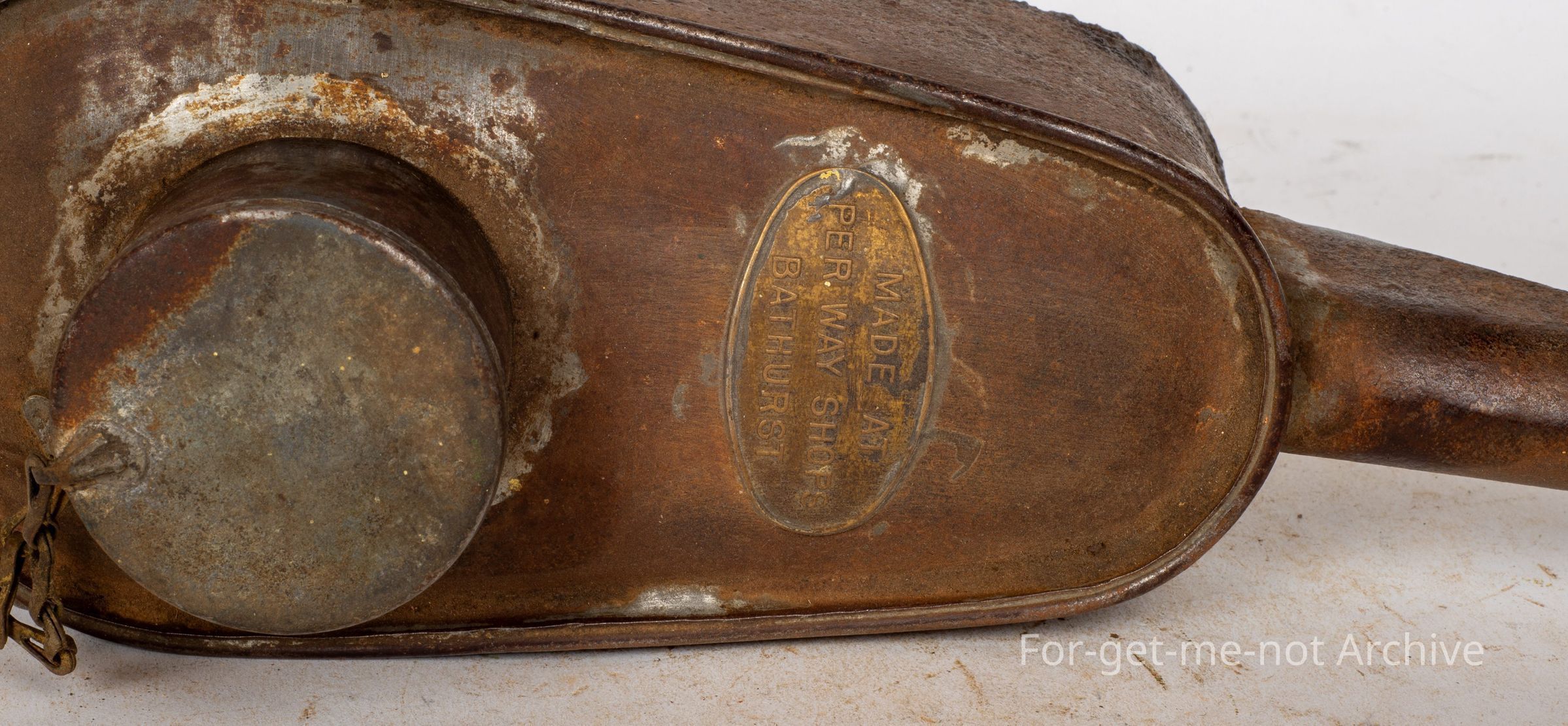 This is the large tin oil can manufactured in the railway workshops at, Bathurst in New South Wales.