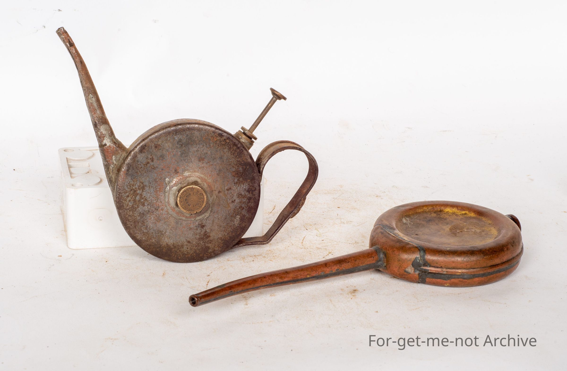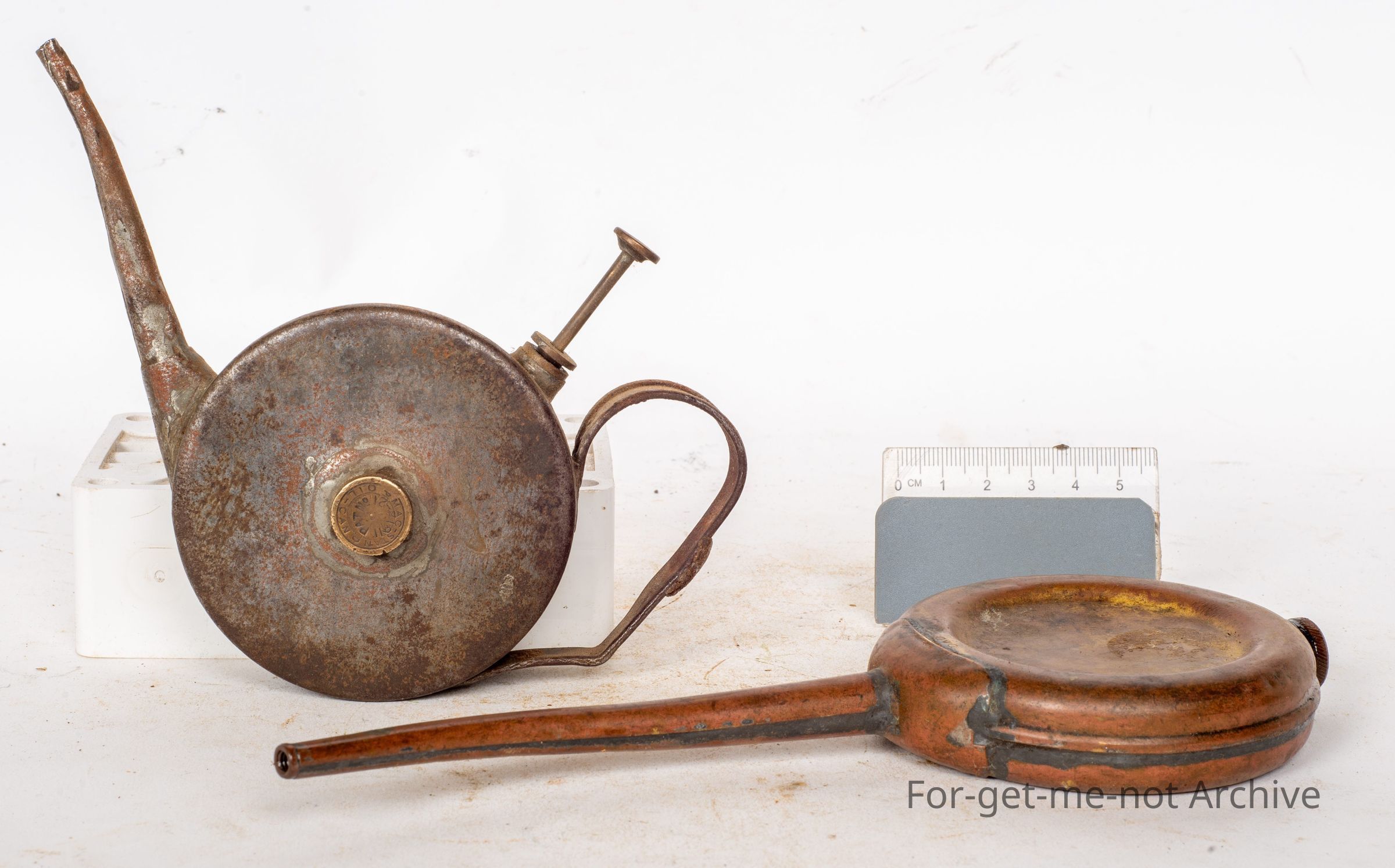 1 is a full brass case, circular, long, vertical spout, stamped, Department of Defence. The second one is quite a nice little circular one again