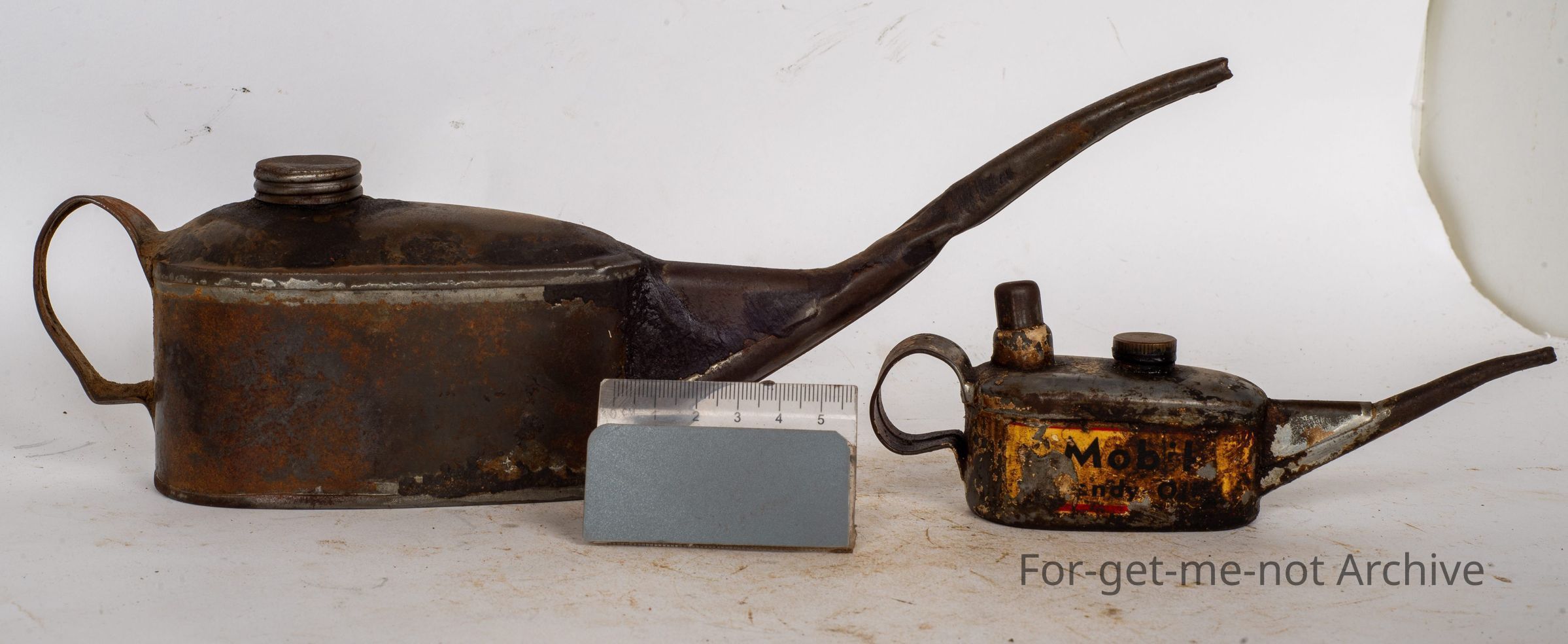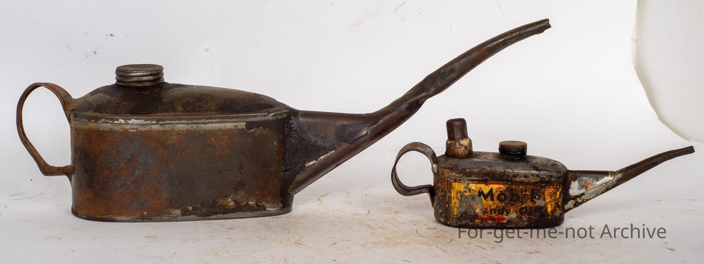 This is a basic tin one. Nothing elaborate or exciting about it. The second one is a smaller one. Nice little pumper, original brass cap, advertising mobile oil.