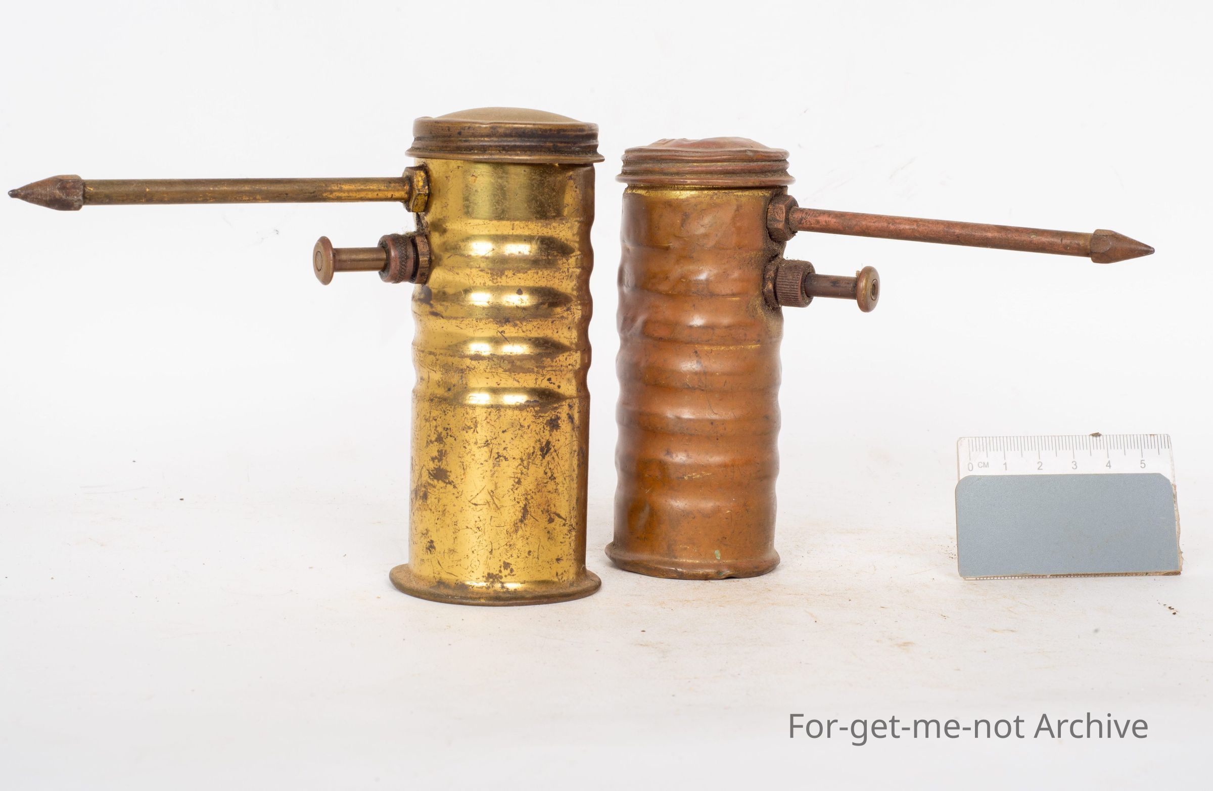 Pair of brass bodied cylindrical oil cans, has a spout that goes out at 90 degrees, hand pumper under the spout. These are both the same, different ages, quite hard ones to find. One of them has embossed EA eagle on the top.Collection