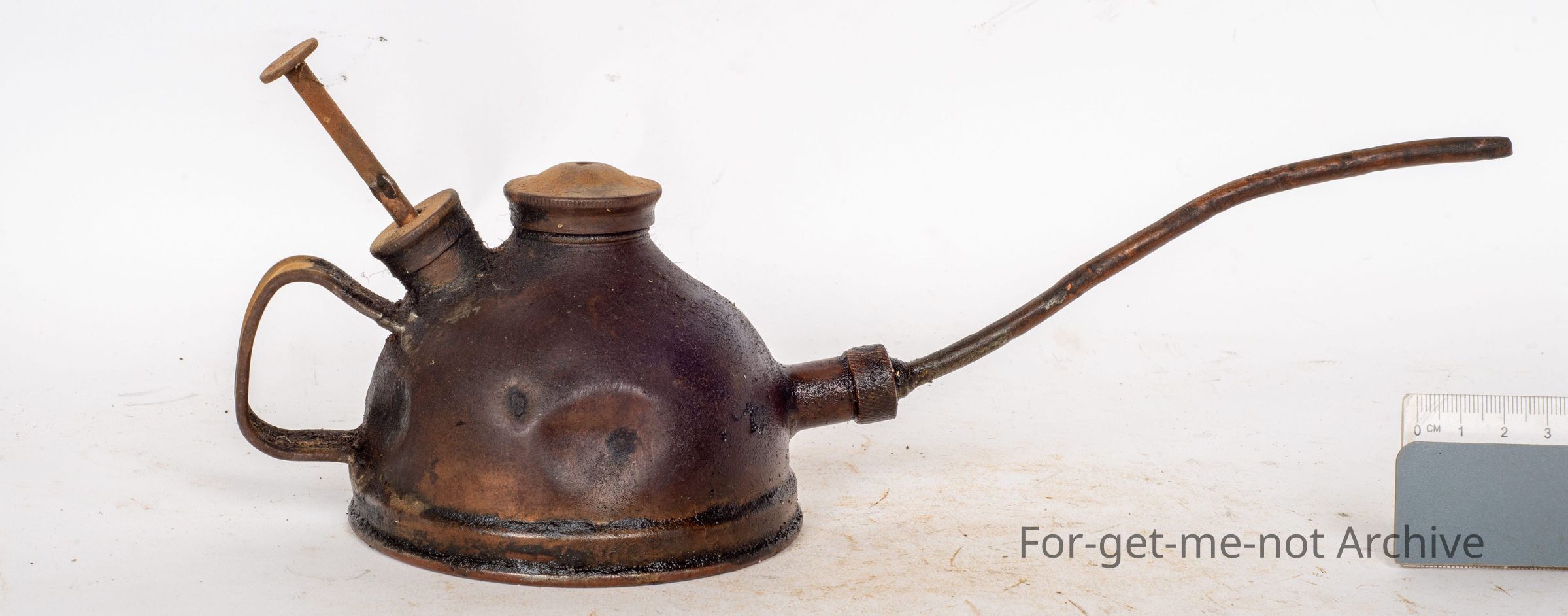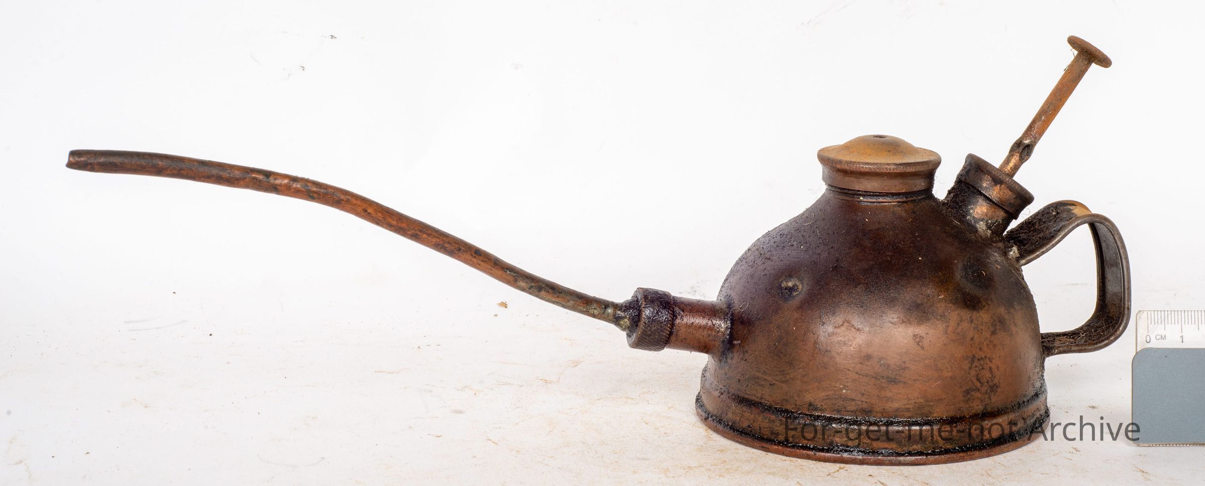 This is a rather attractive one, domed, tank, has its lid, a very slender copper spout. The oiler, the, pump works cleaned up, quite attractive.