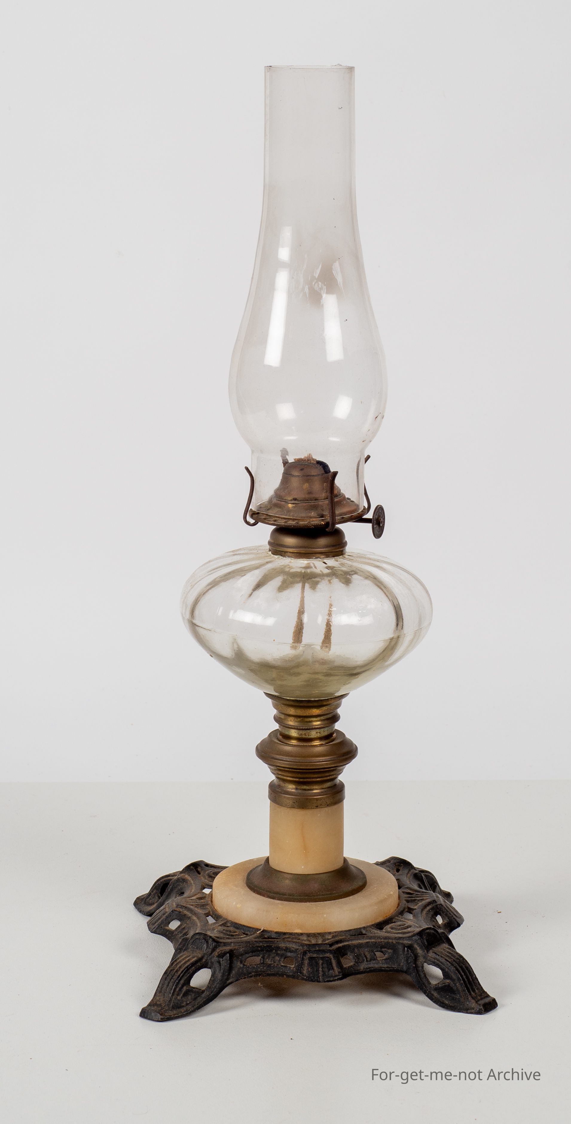 Decorative cast iron base with stone centre. Moulded glass, decorative font. Possibly European.