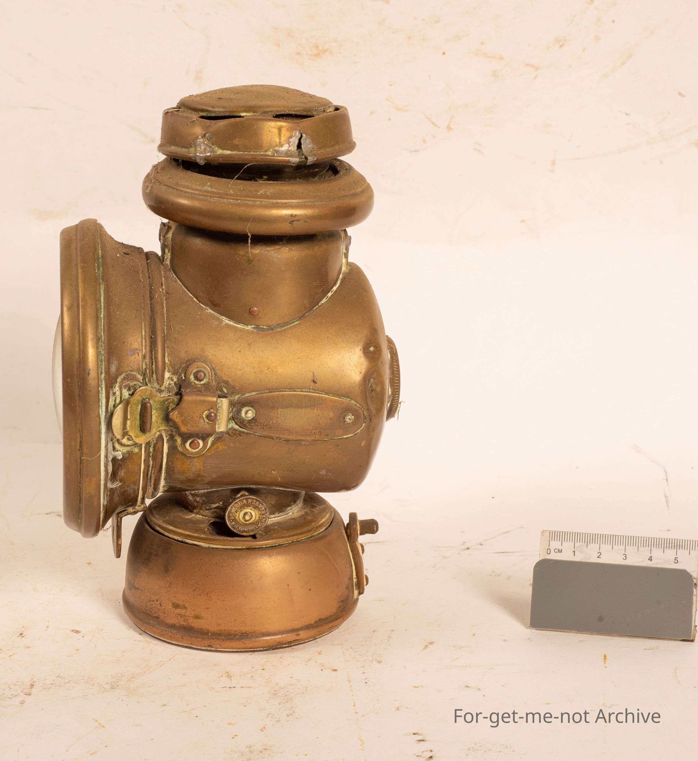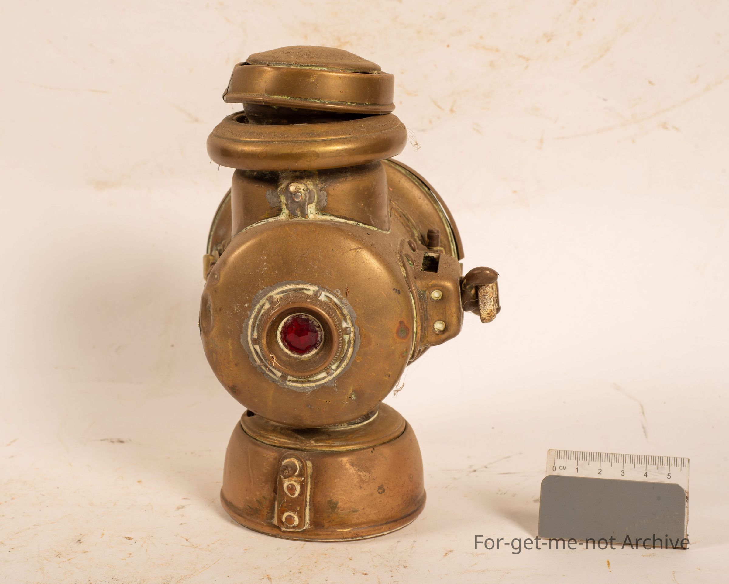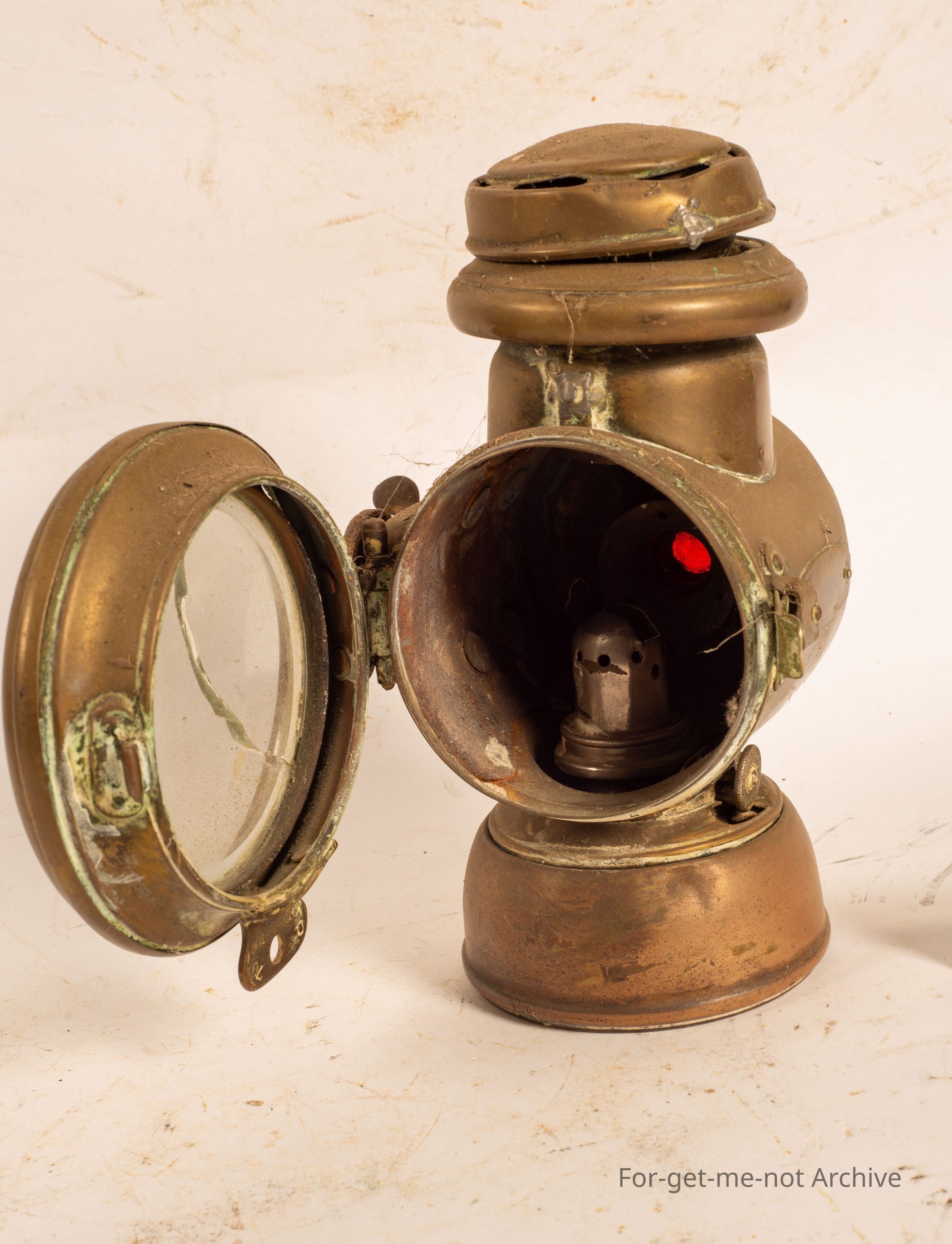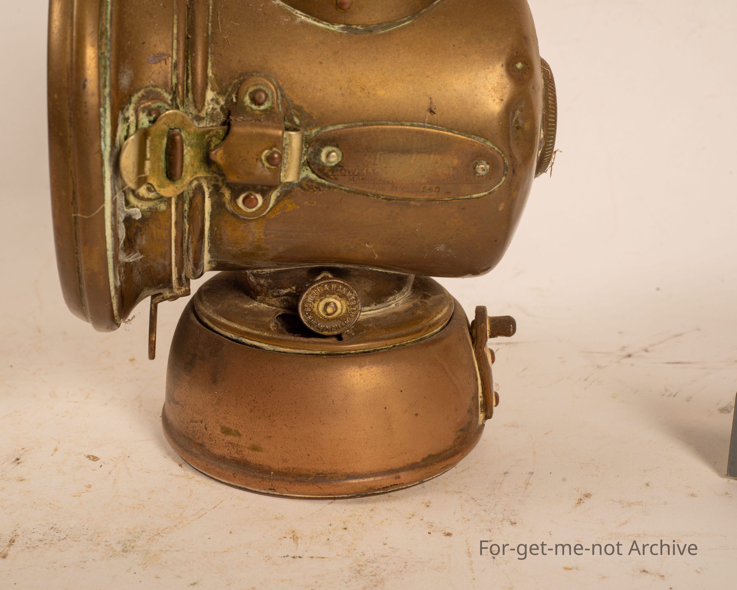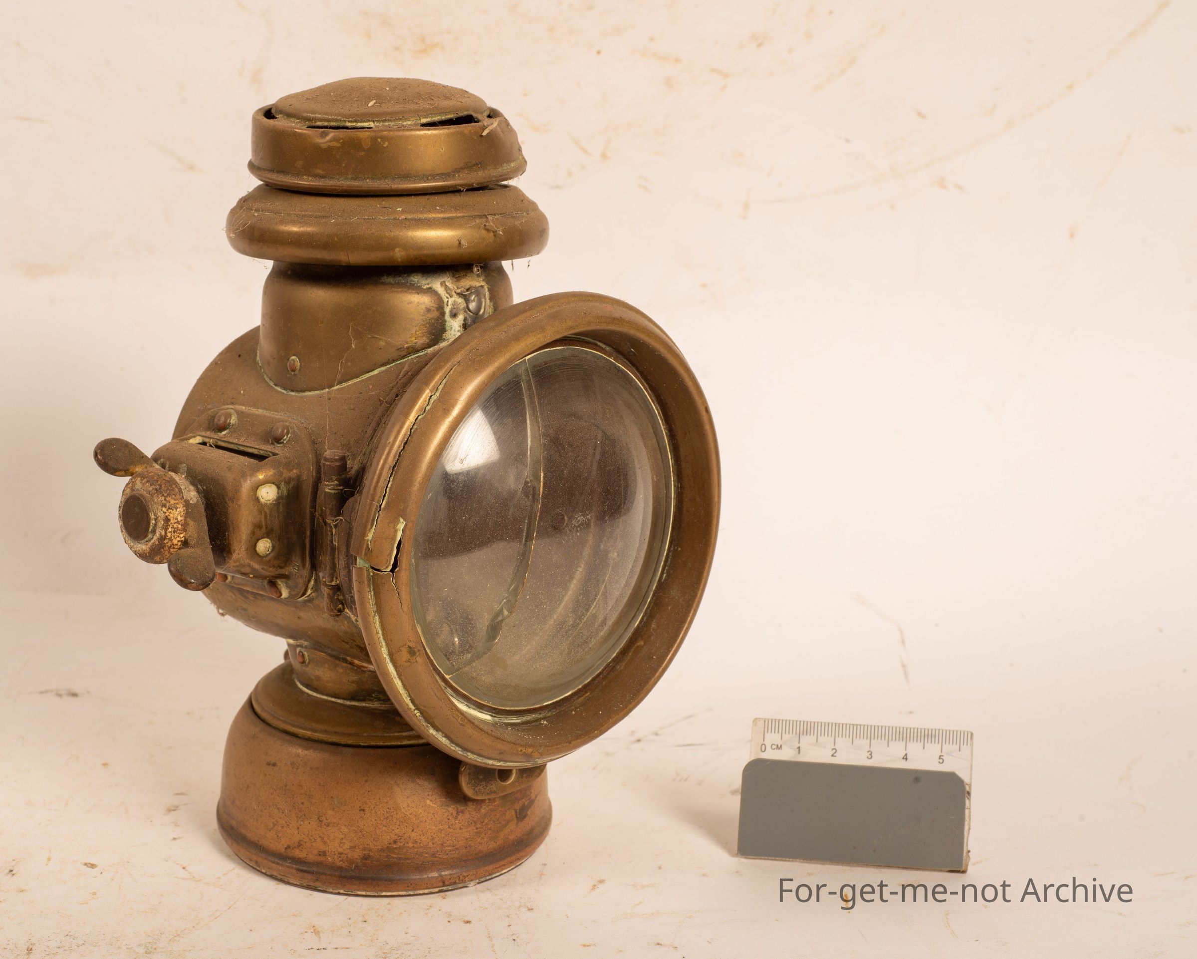 This is a full glass lamp used on early motor vehicles, has a fuel tank, plenty of clamps to attach it to the car, maker. Not obvious. Probably not well enough made to be a top quality one.Collection