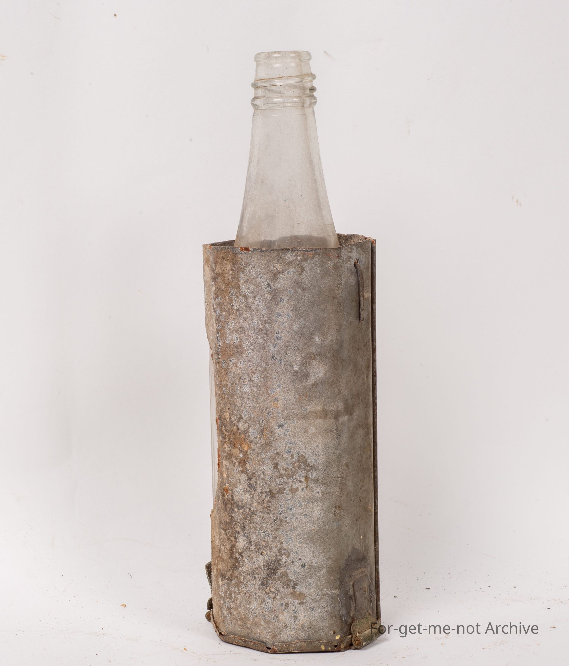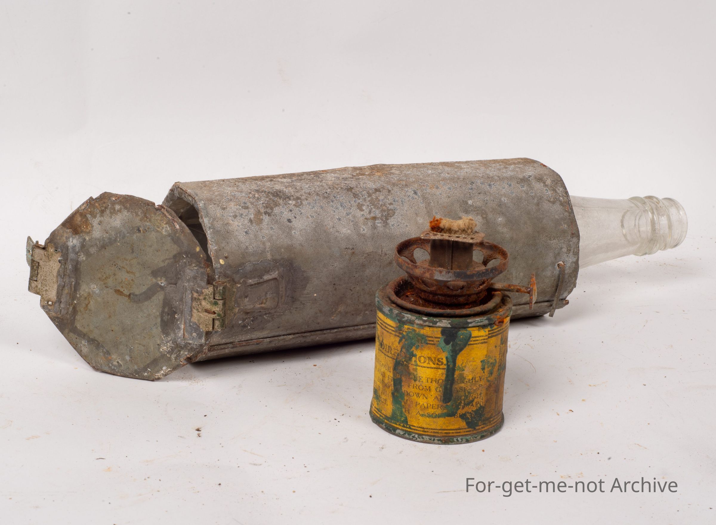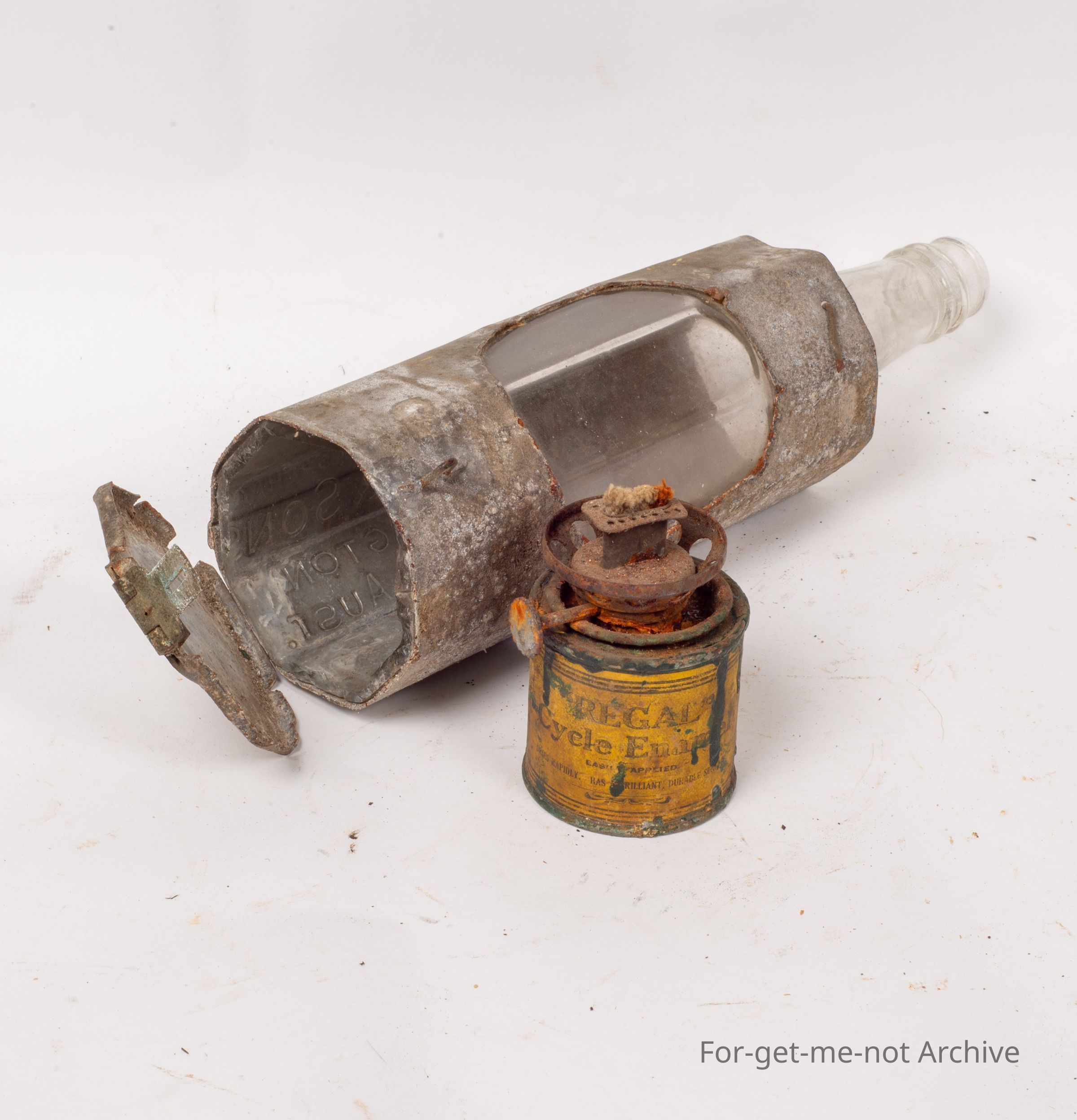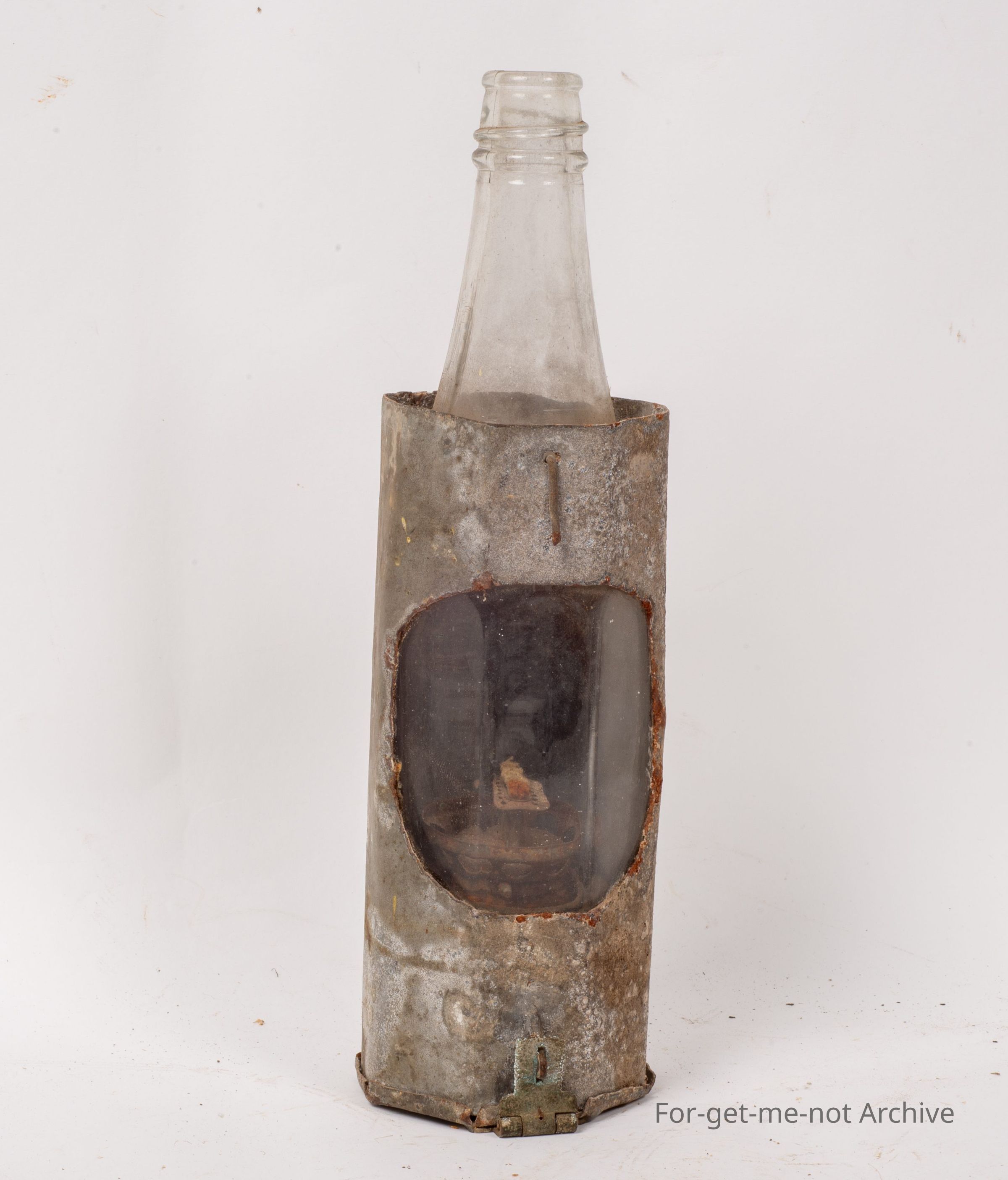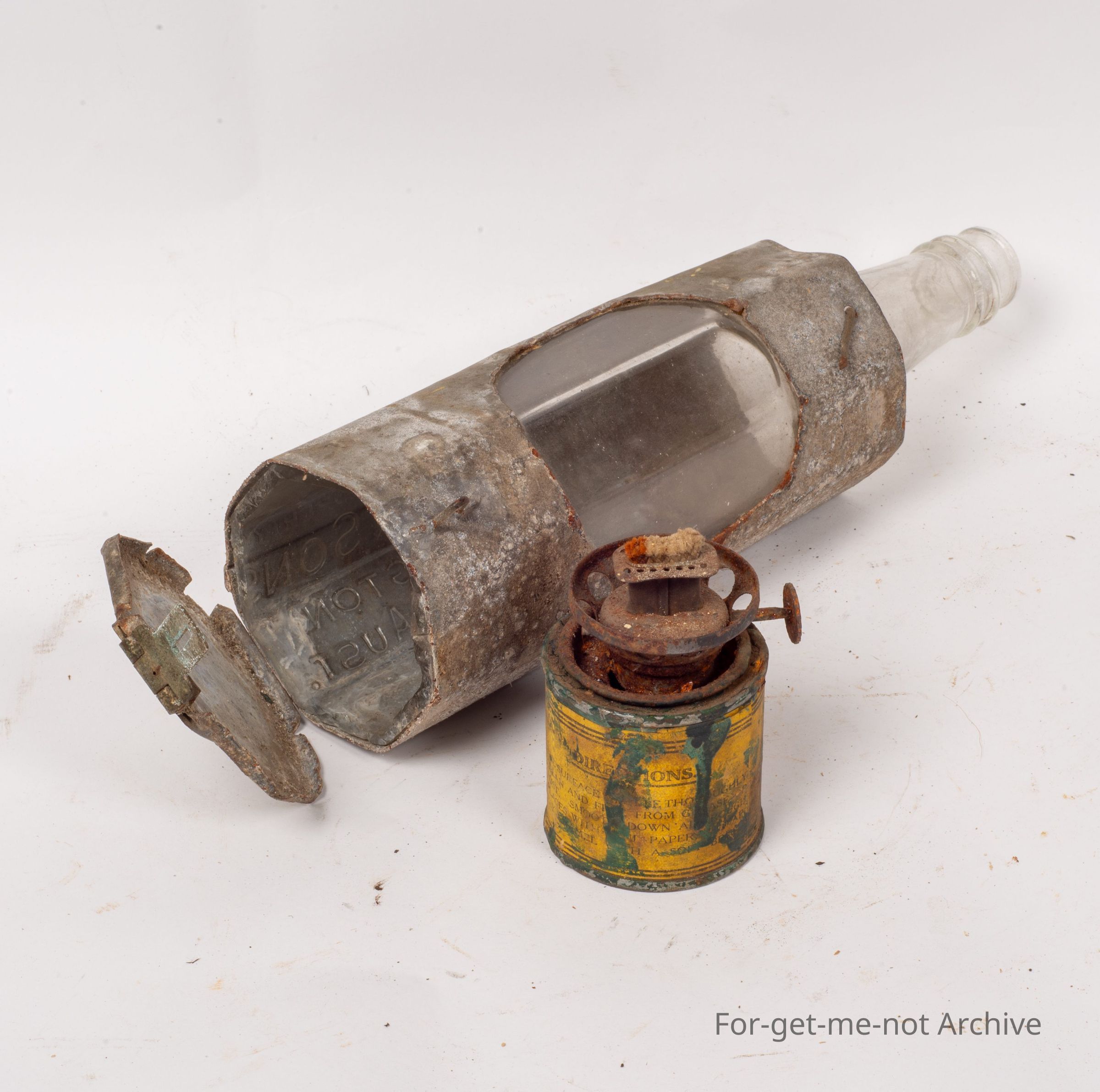 This is another wonderful Depression improvisation piece. This is, an oil lamp made from possibly a tomato sauce bottle fitted into a tin sleeve with an opening for the light. The burner is made from adding a burner top to a small paint tin. It has a lid on the bottom with a hinge to get the burner out to refill. A wonderful piece from, times gone by.Collection