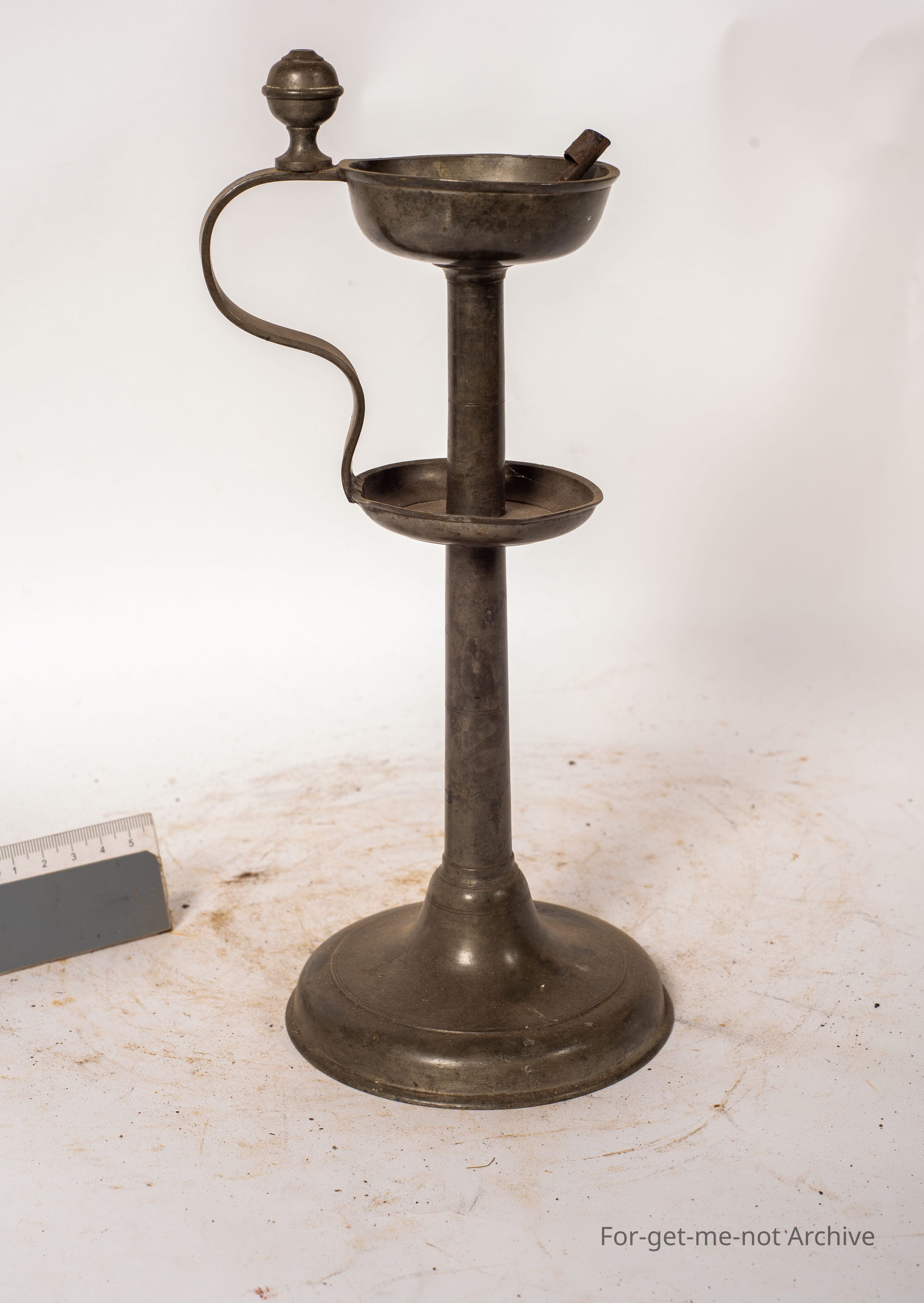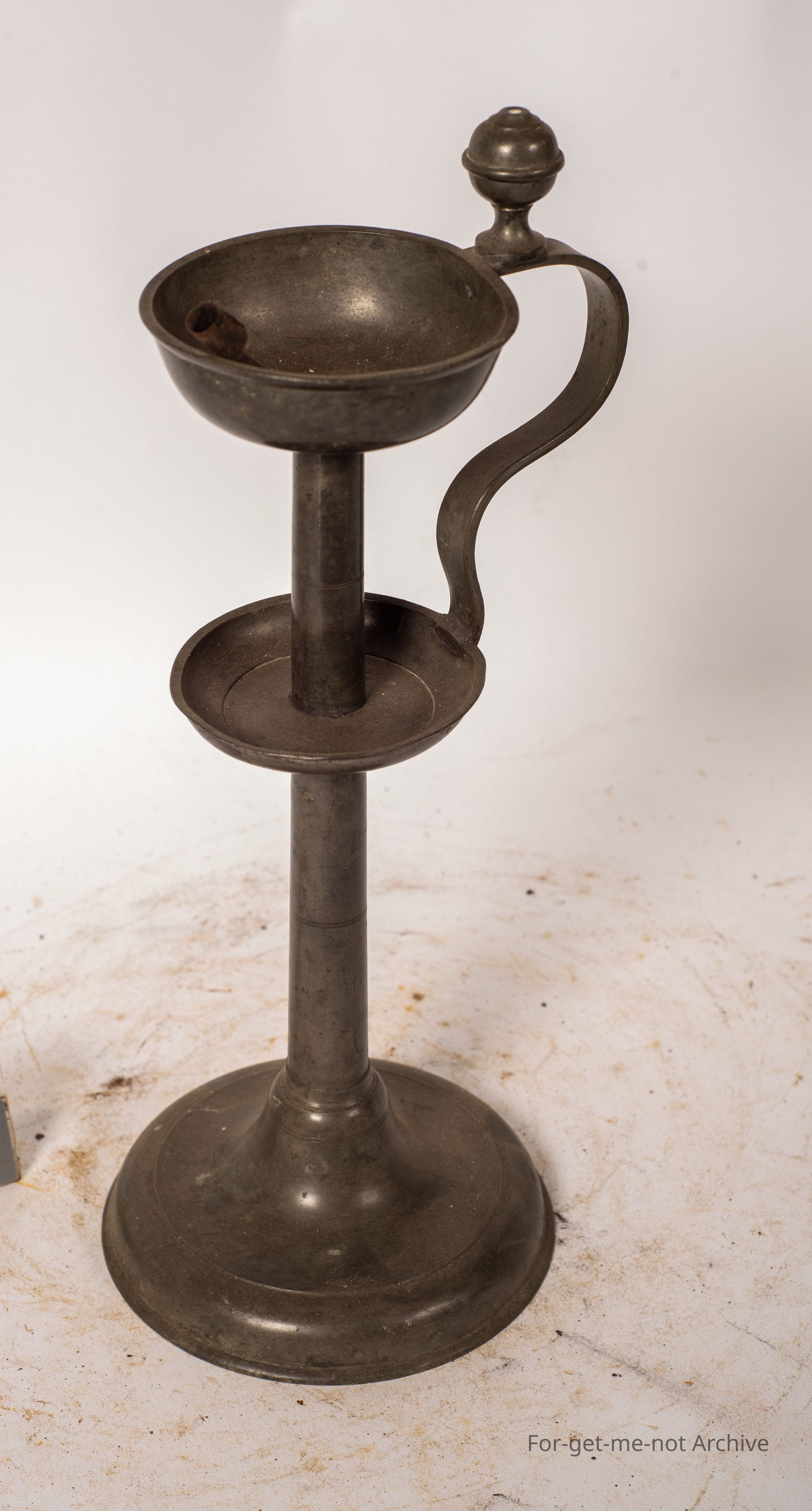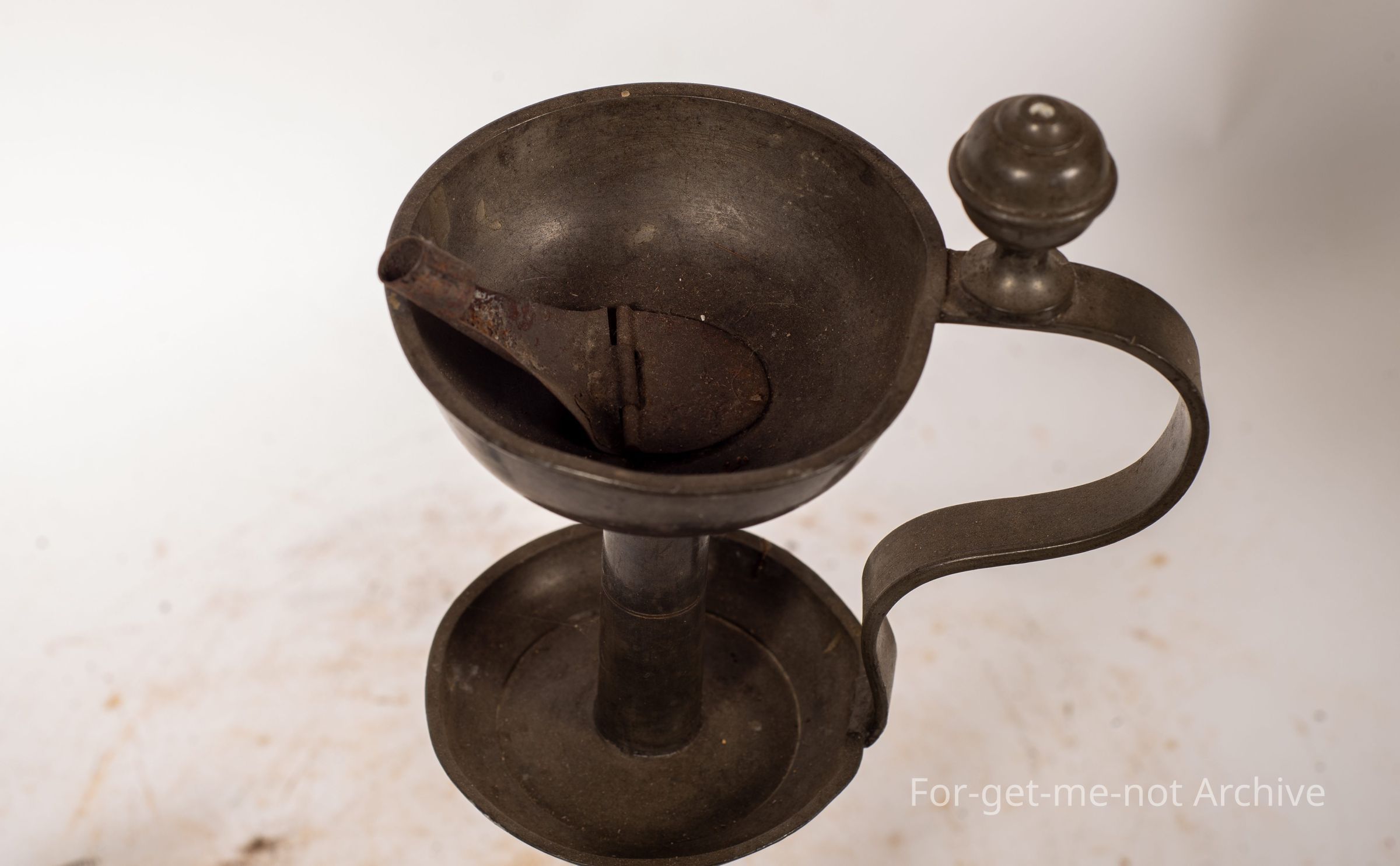 This is a very interesting, extremely early lamp, dating back to the origins of whale oil. It has the tin wick flute, which is usually always missing. Stands on a tall standard, decent base, little handle on the side. These are few and far between, very collectible.Collection