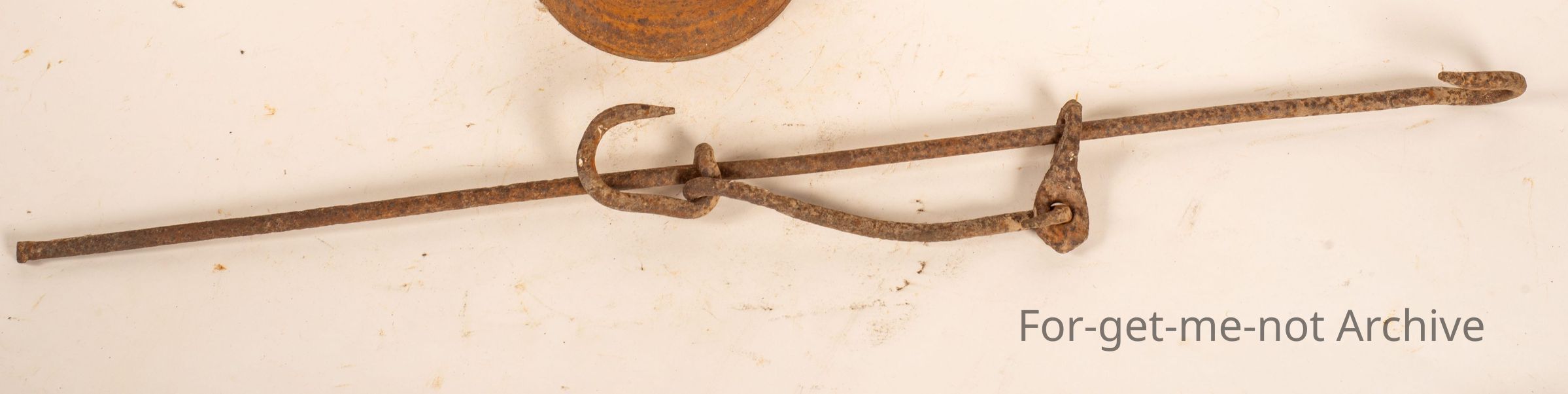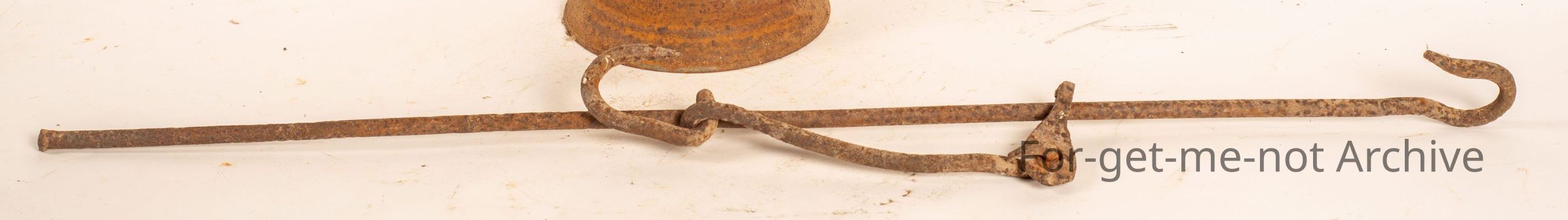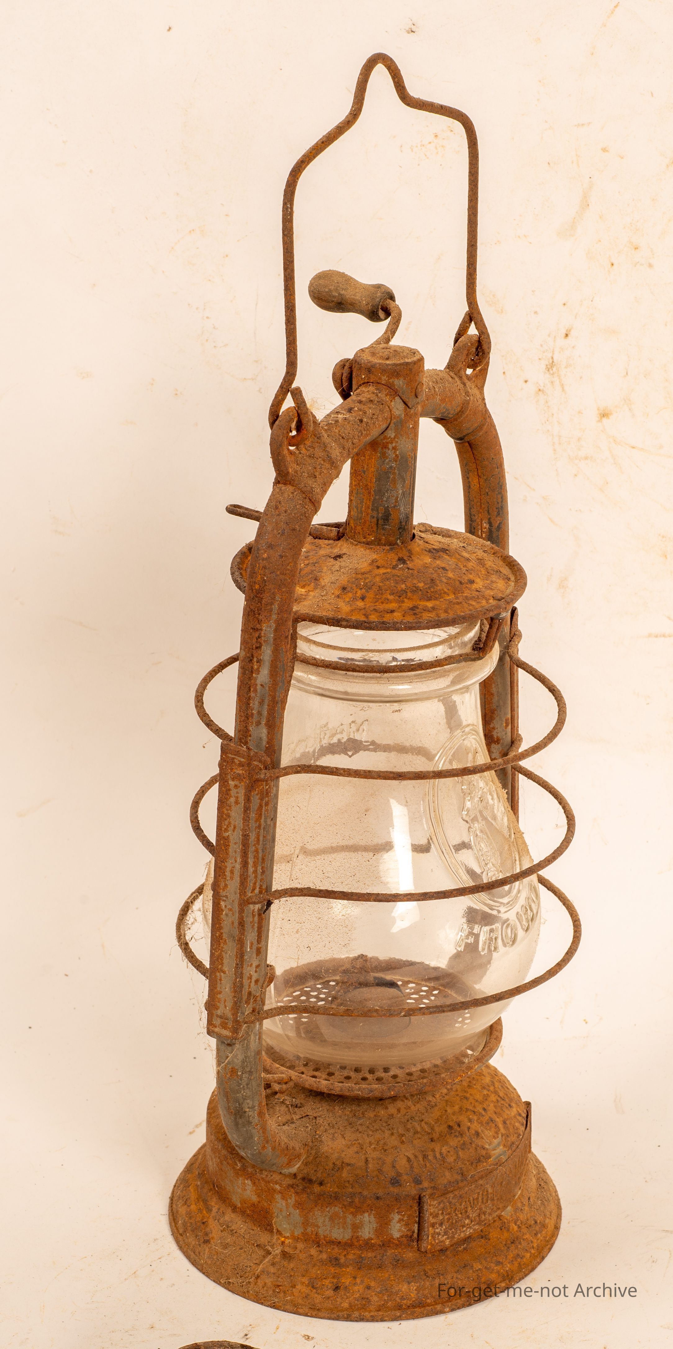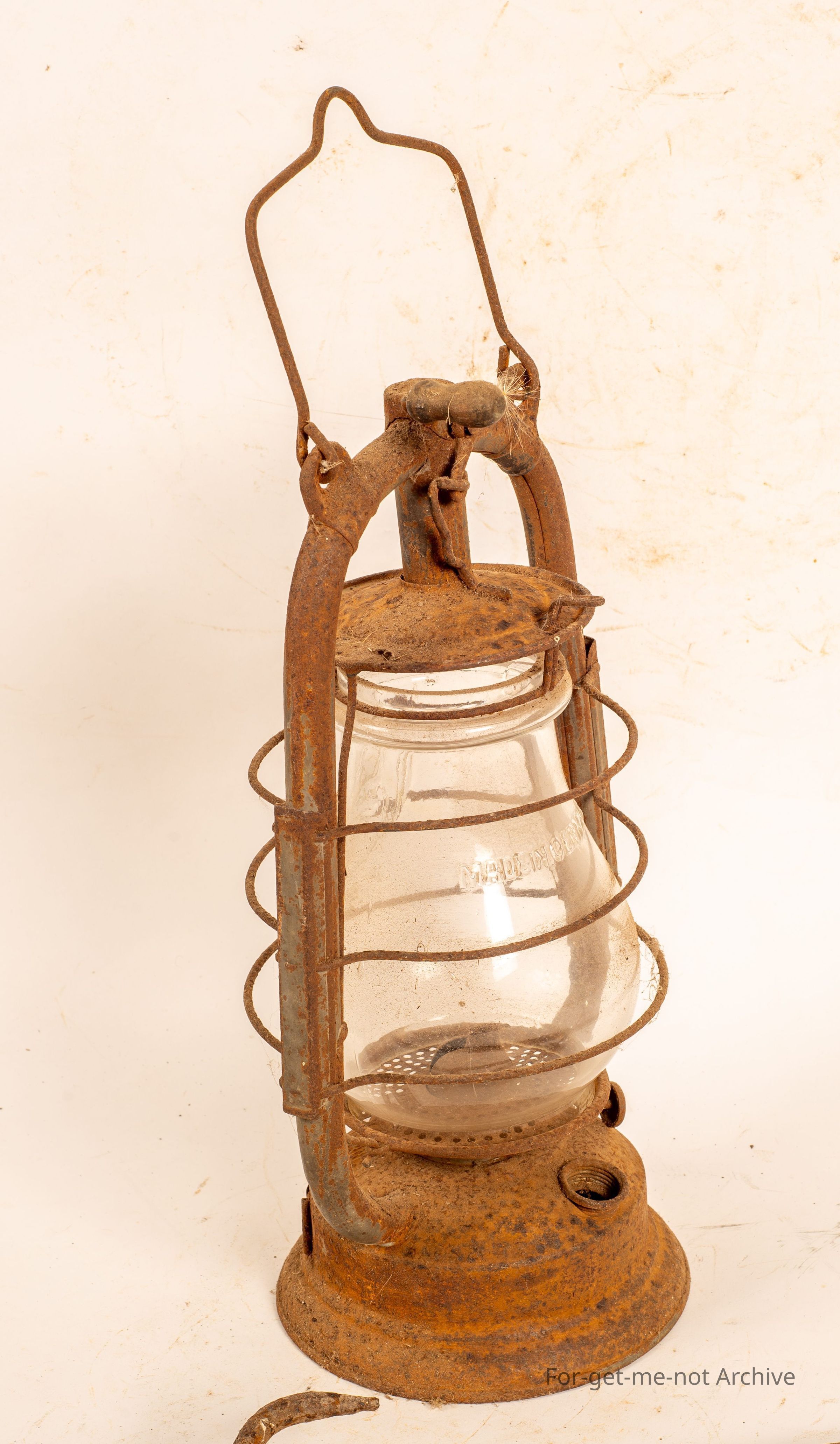 This is rather a different guard for the glass on this lamp. A little handle to lift the, guard up and down for lighting. A very nice shade, with the image of a dog with the lamp in its mouth, titled Frodo, made in Germany. With the lamp is a trammel. The trammel could have been used quite easily to be hung, from a tree or something with the lamp attached.Collection
