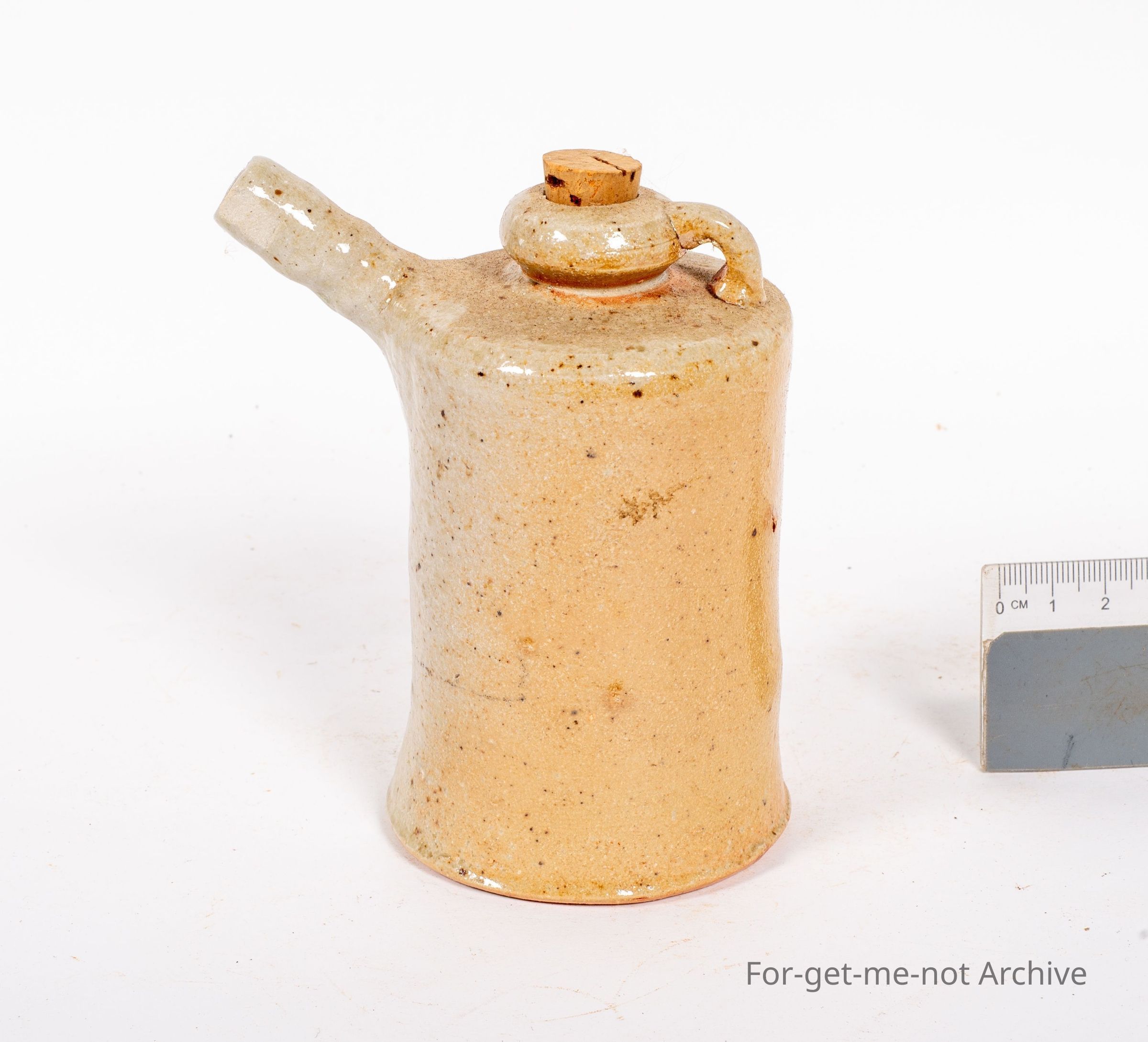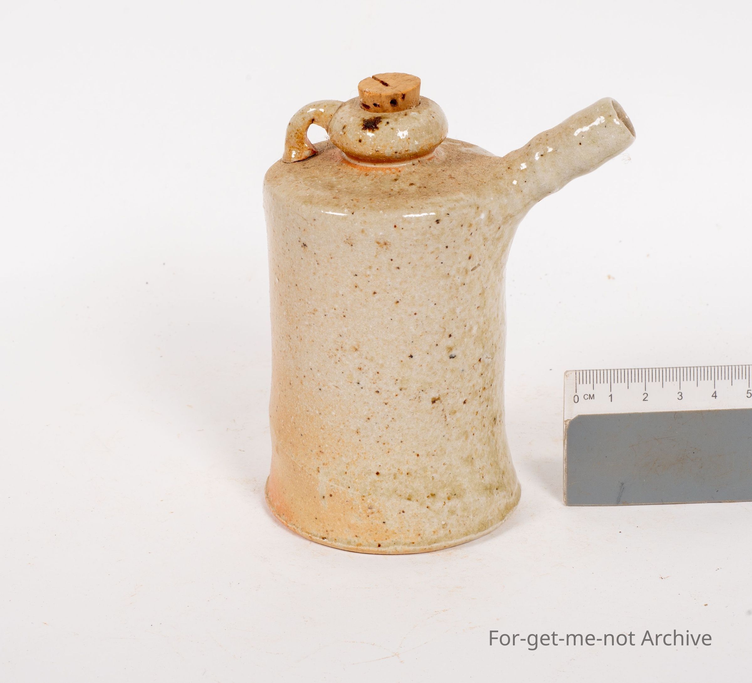 Oil lamp. This is a small earthenware, vessel with a pull up on the front. This has been salt glazed and wood fired. It is a copy of the earthenware lamps that were used to keep the oil in in, the lights on sailing ships. Don't know where this one's made. It has a little chip in the spout, but, a pretty uncommon piece.Collection