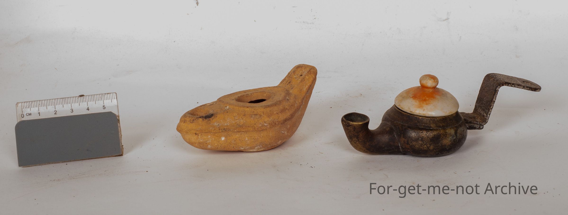 These are 2 very early, heavy, oil light lamps, one of ceramic, Middle Eastern design. The other one is a very early cast brass piece of, definitely Middle Eastern origin. Interesting things,Collection