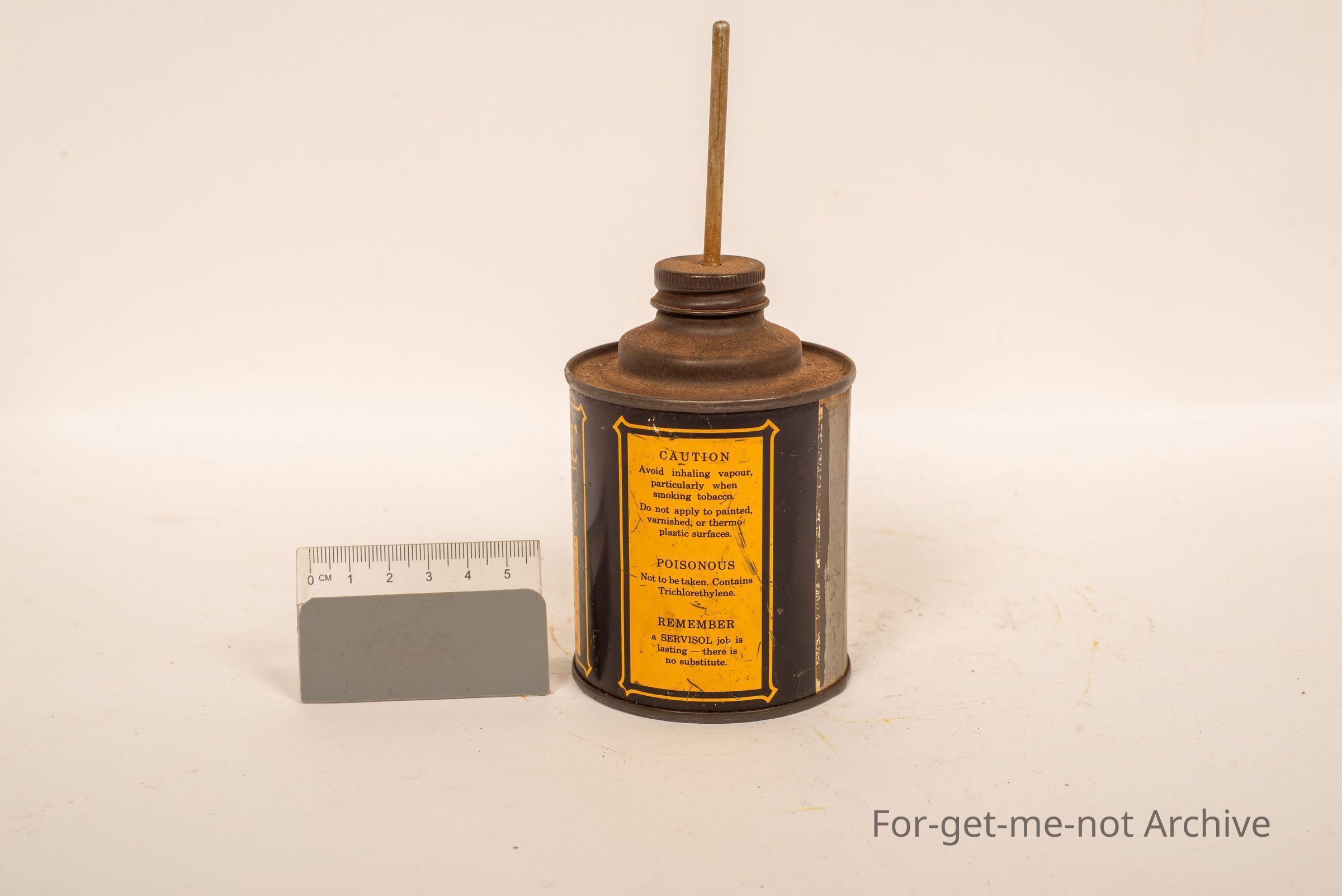 Half pint tin of Servisol, contains ethium, packed by Jacoby Mitchell, Sydney. In beautiful order used for oiling electrical mechanicals