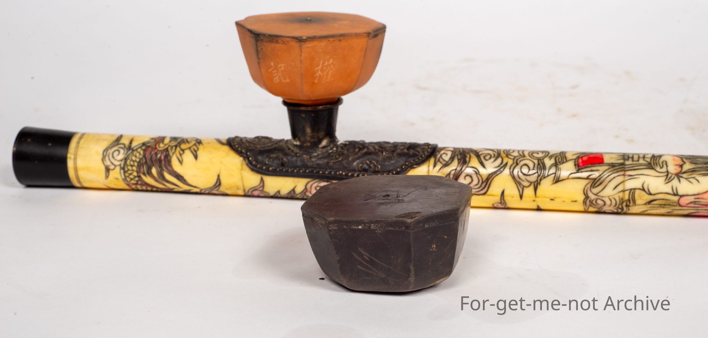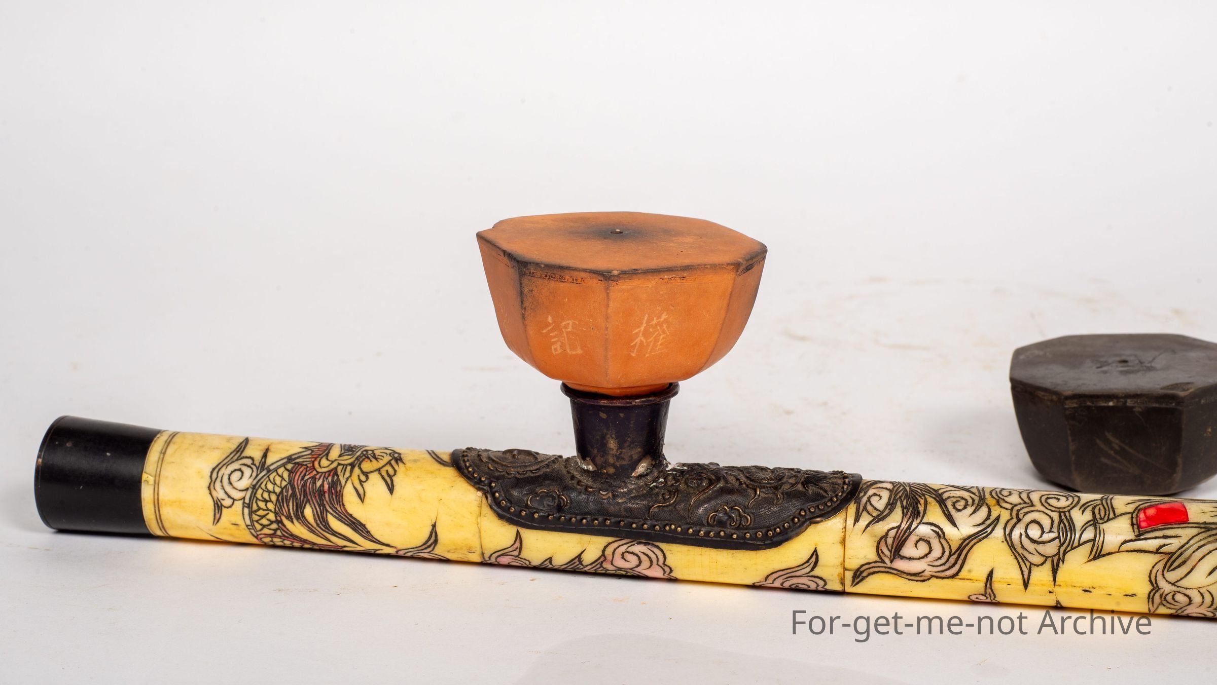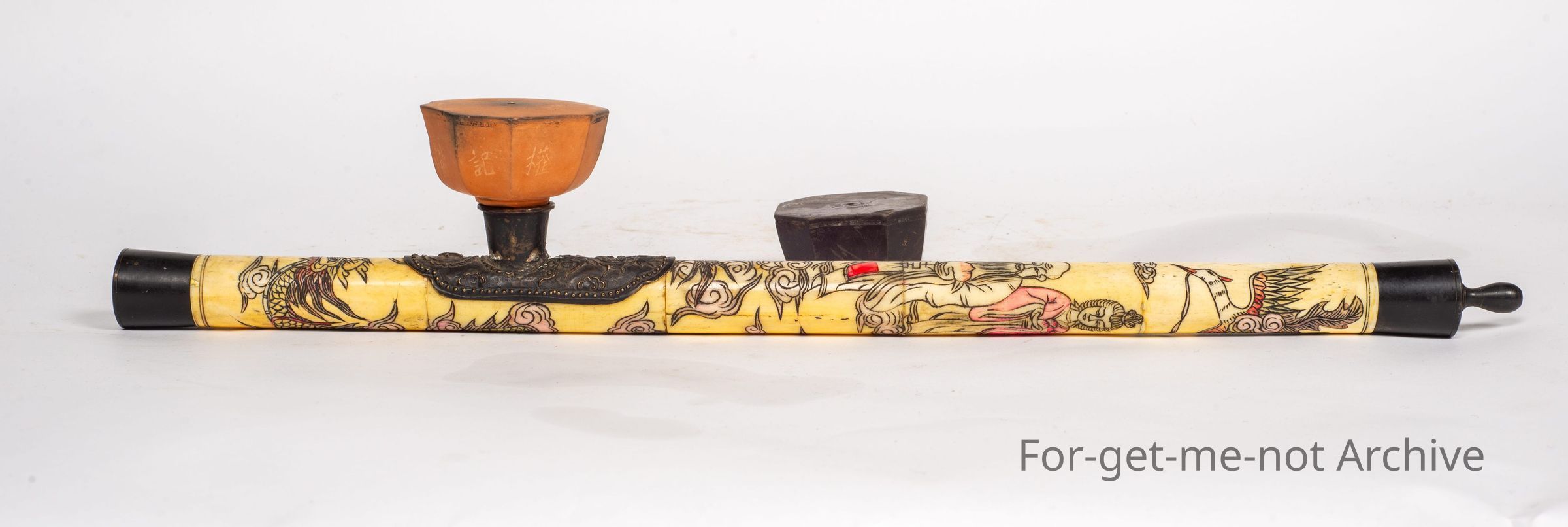 Is a Chinese opium pipe, quite decorative. It is a bit unusual to see the ceramic bowl at the top, but this one has one. There is also a spare darker bowl with it. This is a very decorated piece, not ancient, but still relevant to Chinese history.Collection