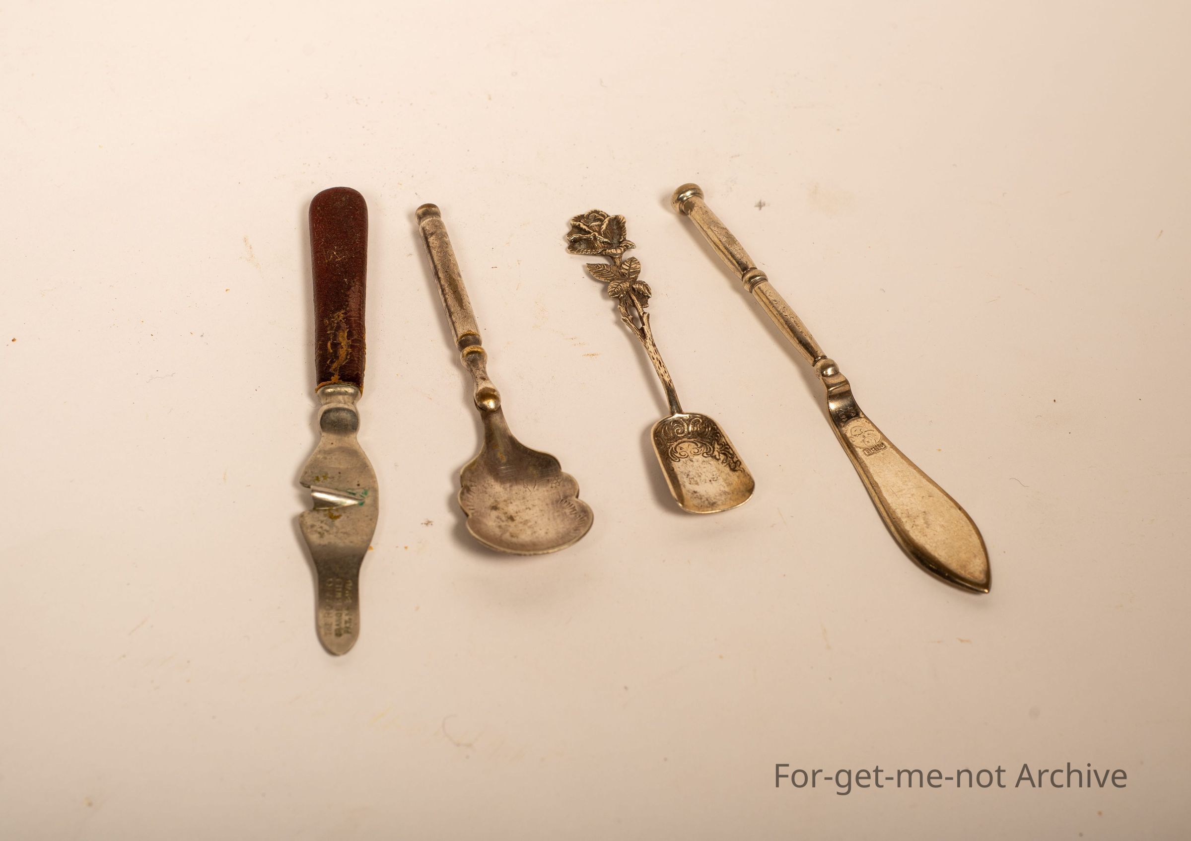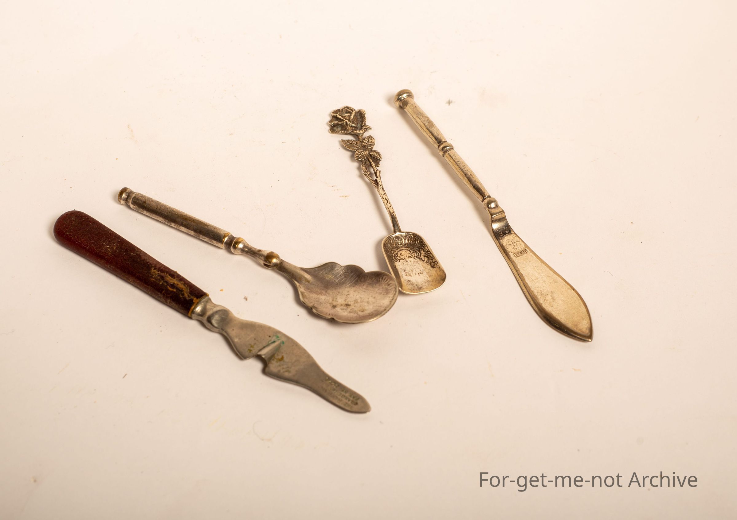 Four small kitchen pieces. I have an orange peeler, a sugar spoon, a very decorative small sugar spoon, and a butter knife. All in beautiful order.