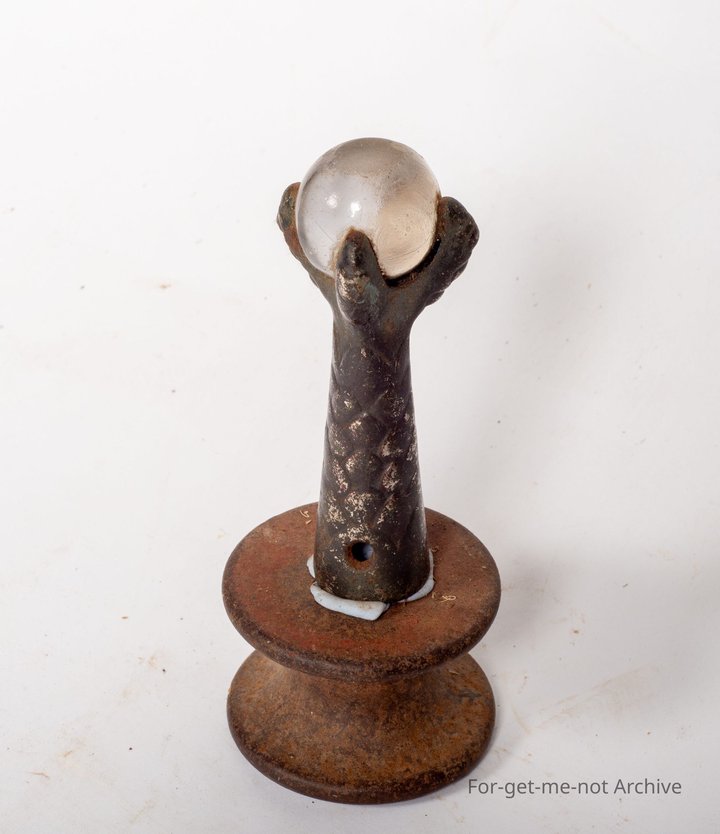 This is a little ornamental piece put onto an iron stand. It is the, a glass footed piece that's made as a decorative piece