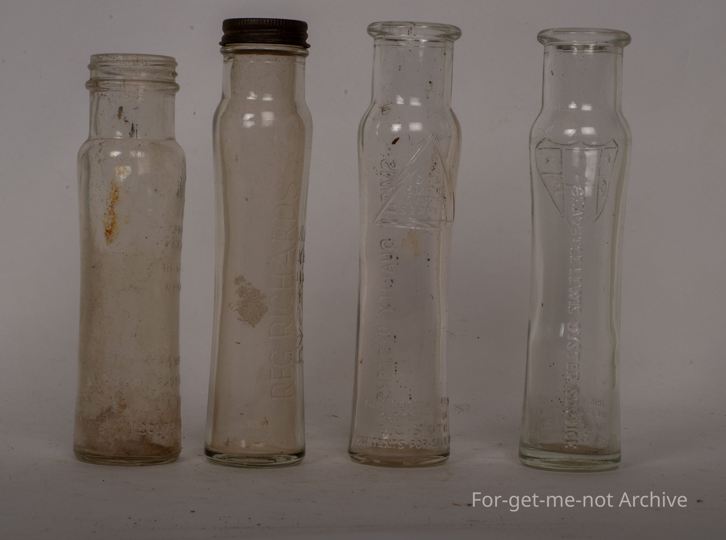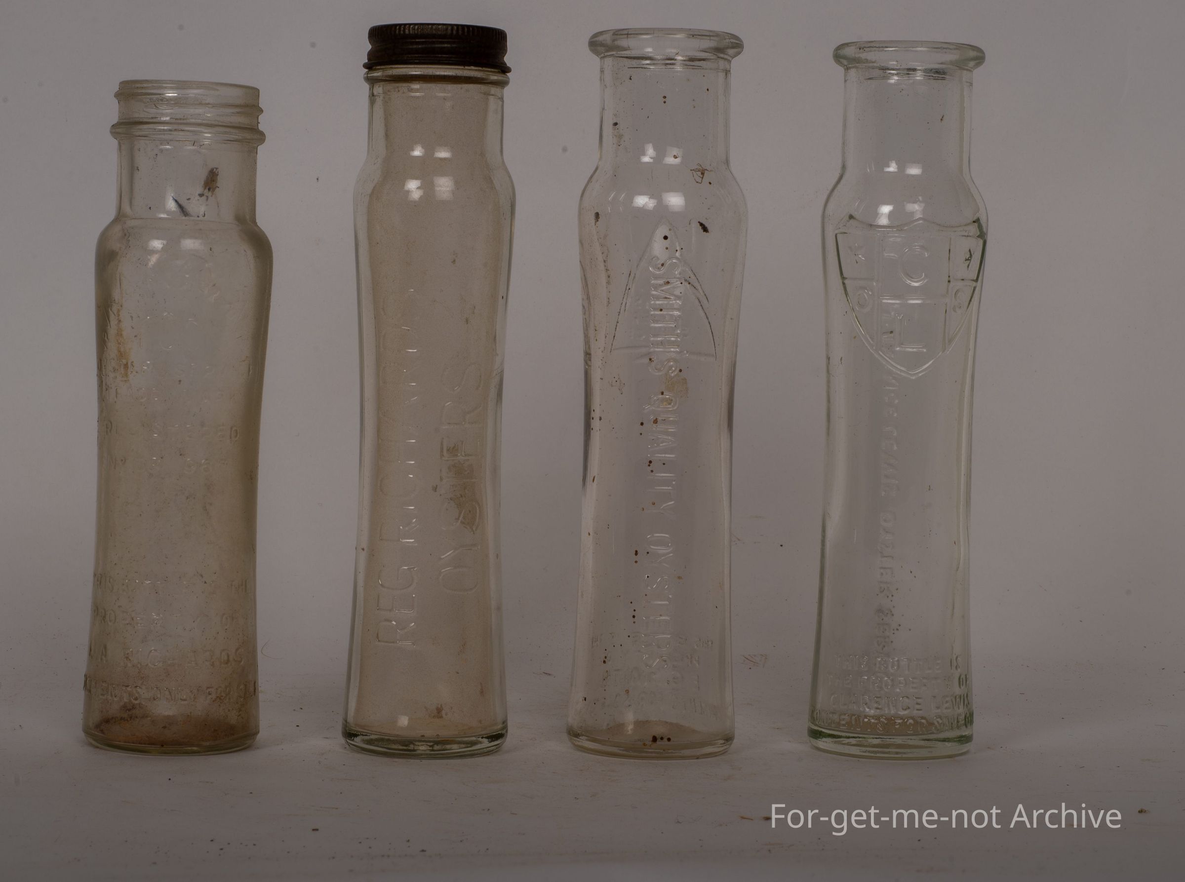 This is a group of 4 oyster bottles. The first one, Clarence Lewis Oyster Service. The second one, I'll have to refer to that one. 3rd one, Smith's, or the second one, Smith's Quality Oysters. Next one, Reg Richards Oysters. The third one is Les Richards Oysters again, but totally different bottle. All lovely, hard to find. They're no longer producing these bottlesCollection