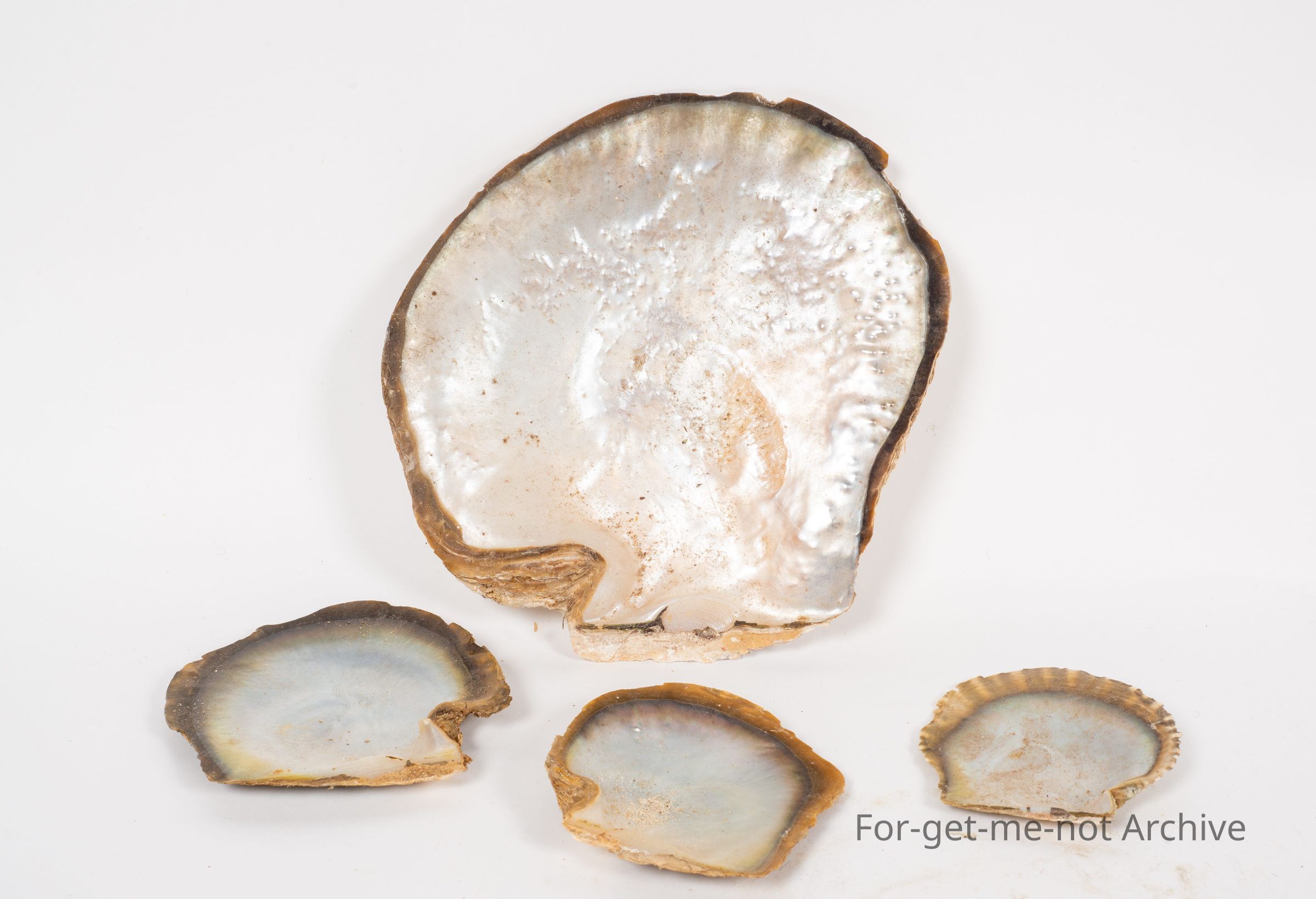 Is a group of 4 black lip oyster shells from Broome.1 large, 3 small. These were used in the button industry but no good for growing pearls.