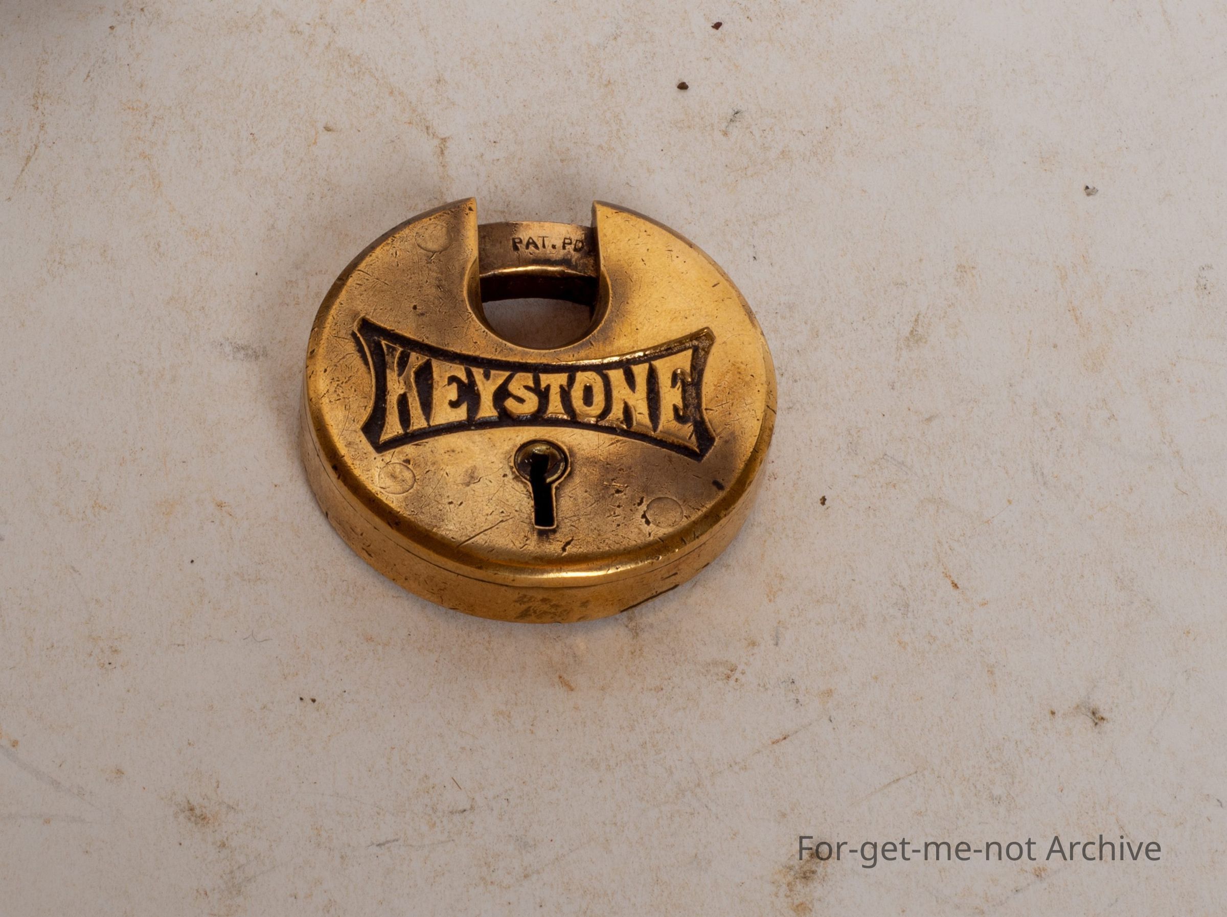 This is a beautiful, circular, brass, padlock. Text on the top is keystone. Beautiful order.