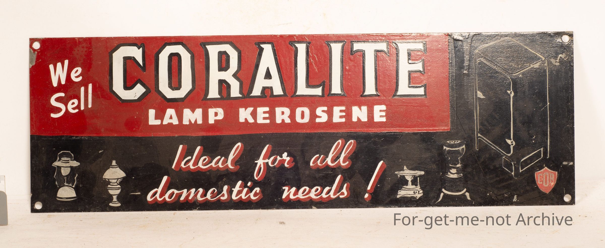 Sangeet Collection. This is a tin hand painted sign. Beautifully done. This is advertising Coralite Lamp Kerosene. Ideal for all domestic needs. Little diagram of the fridge, lamps, etcetera.Collection