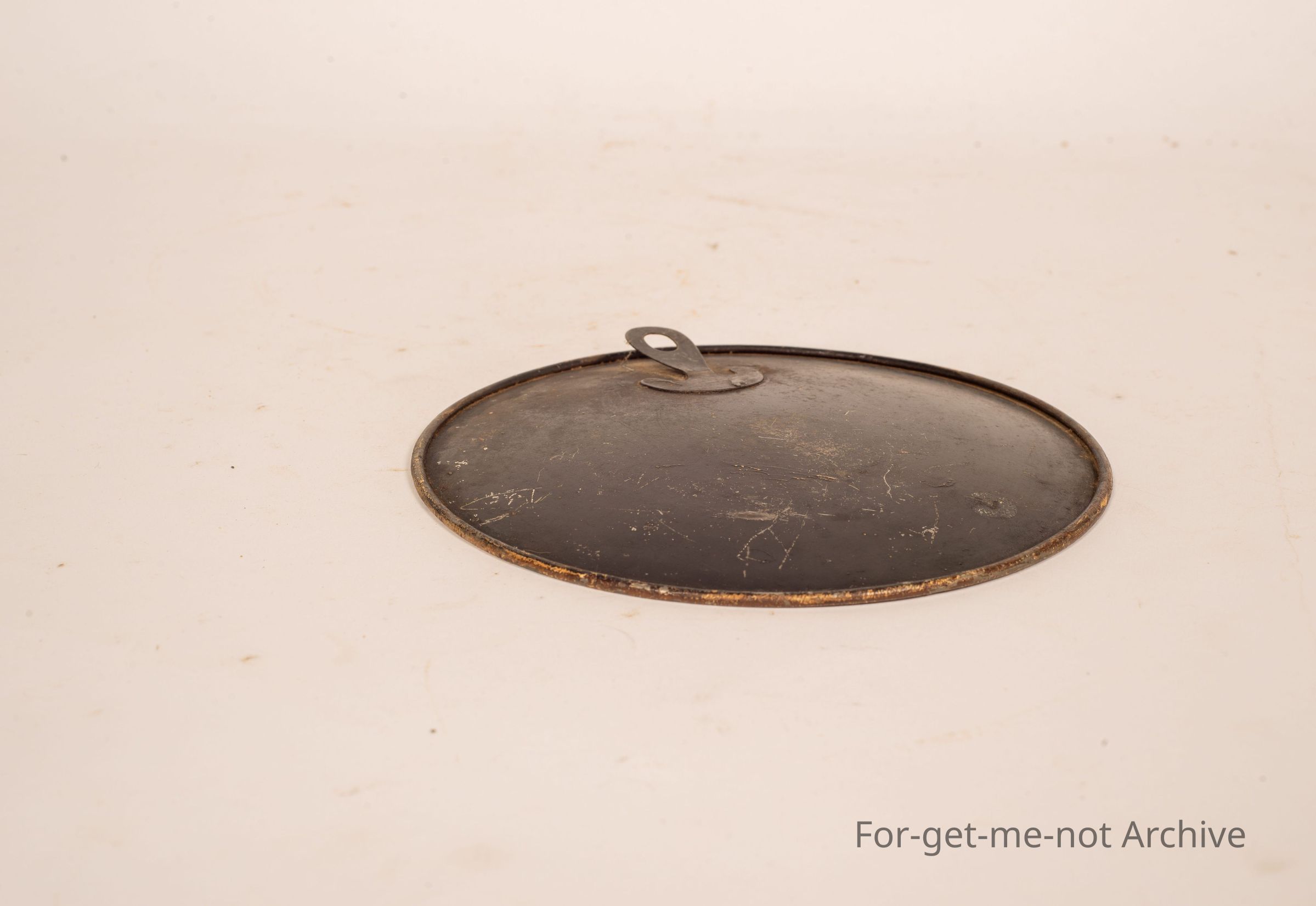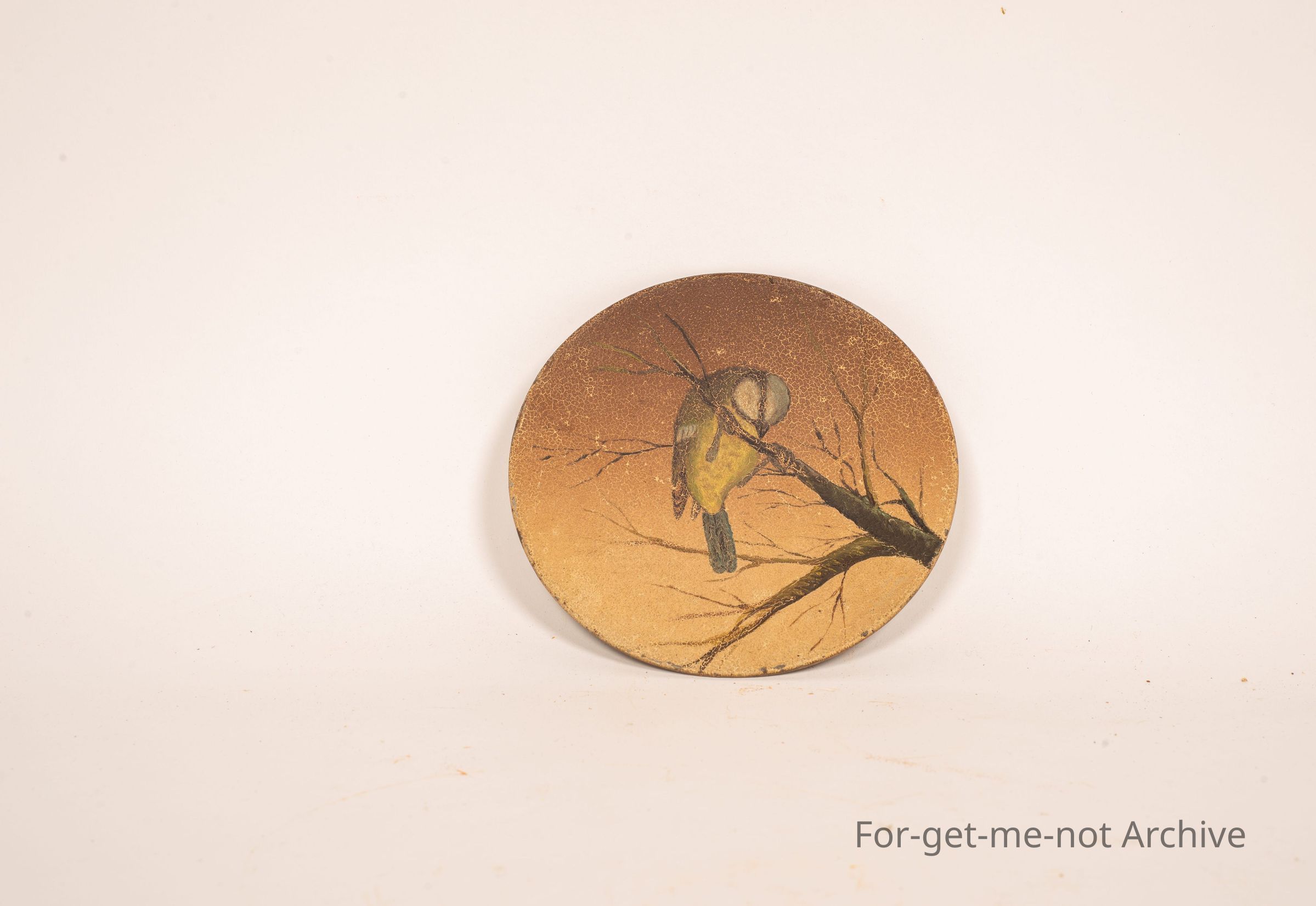 is another, tin dish, used as a painting, piece with a bird in a in the branches of a dead tree.