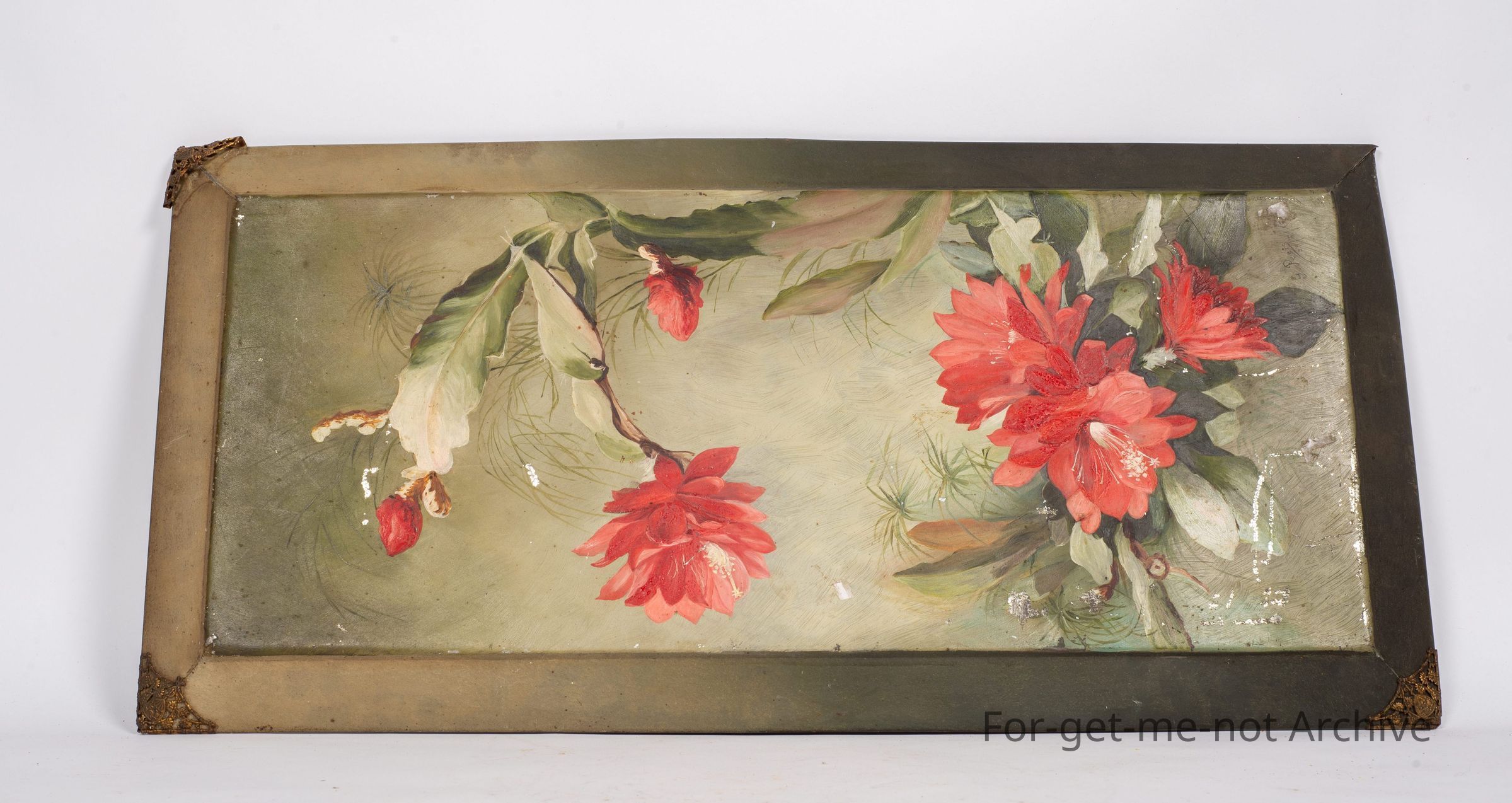 Is another tin, piece used as a medium for painting on. This one has images of flower and cactus. Quite beautifully done. Decorative brass fittings on each corner.