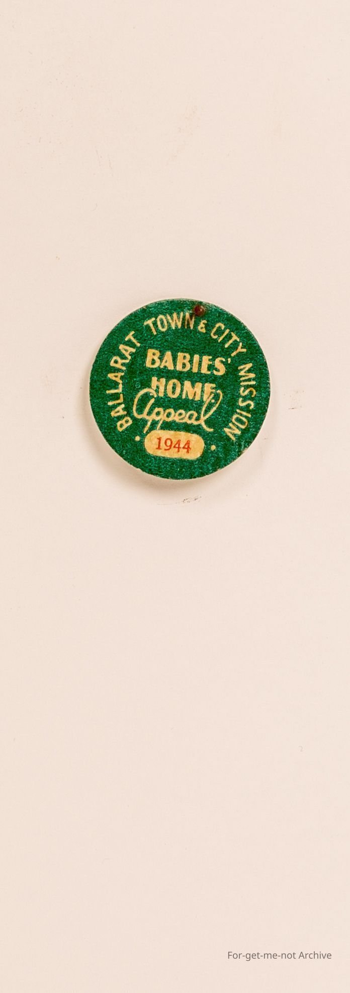 Another paper badge, this time green. Ballarat Town and City Mission, baby's home appeal, 1944.