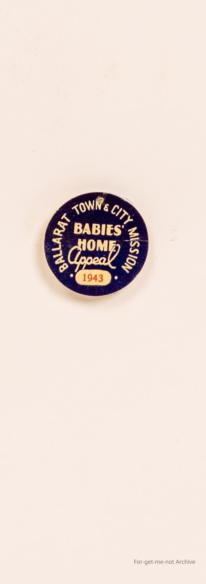 A paper badge from Ballarat Town and City Mission. Baby's Home Appeal, 1943. Colour, dark blue.