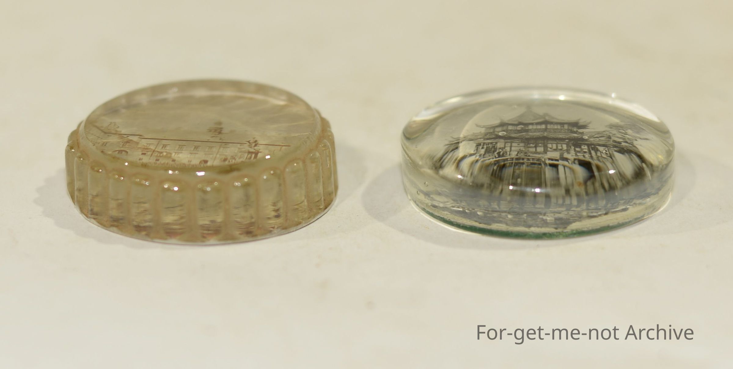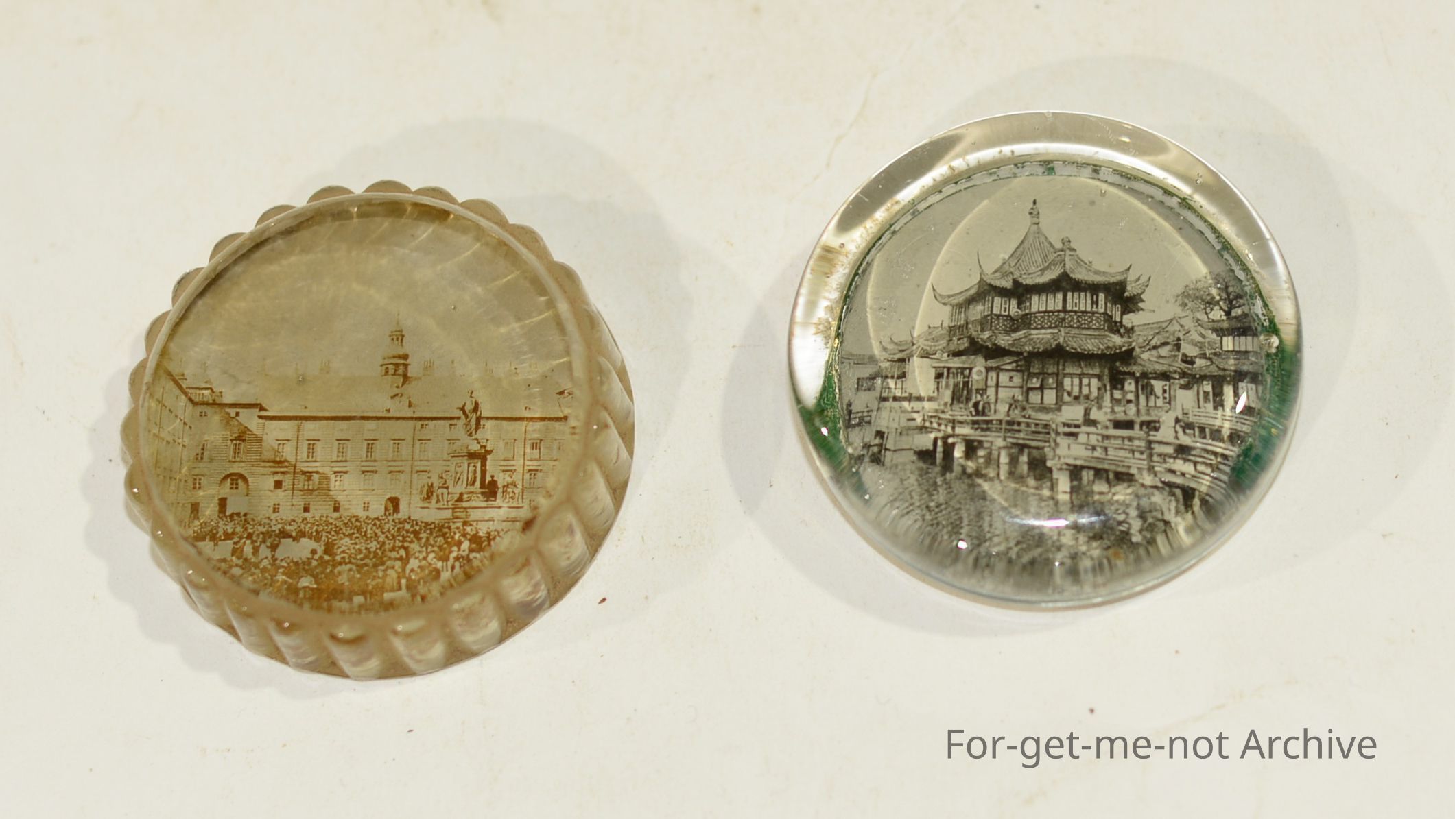 two paper weights one shows image of Japanese/Chinese style house the other European buildings