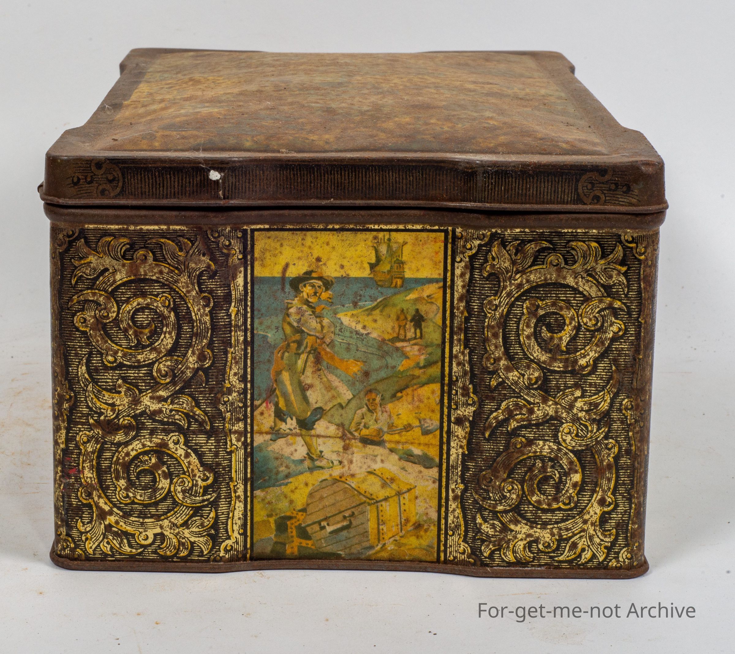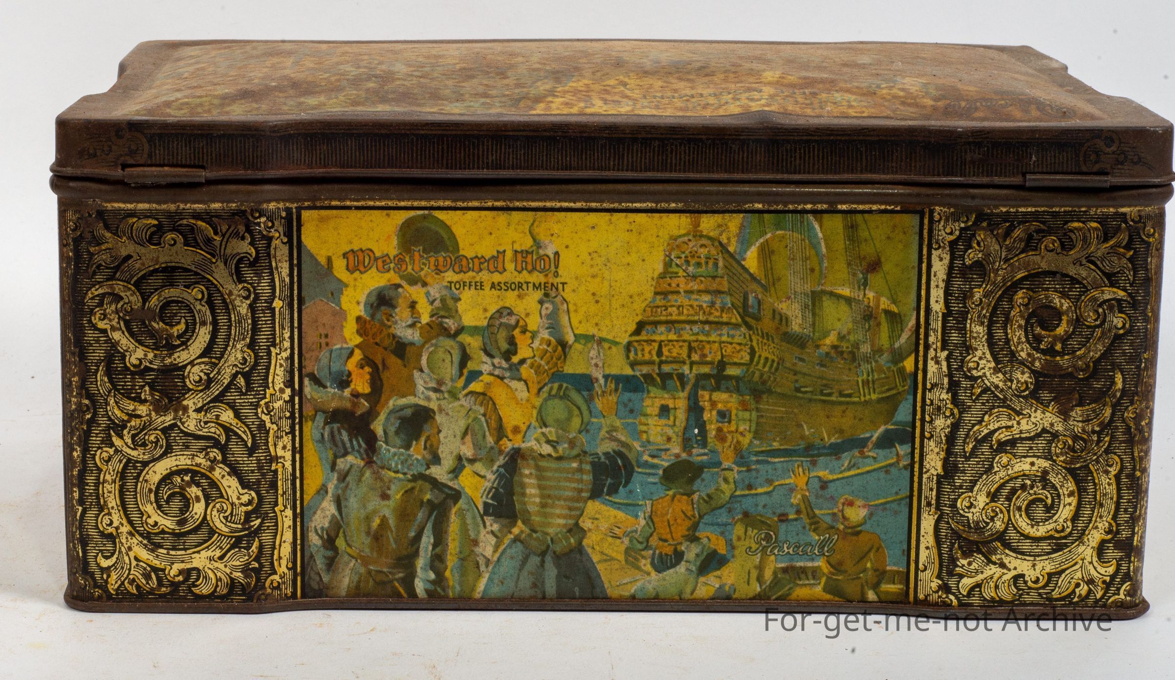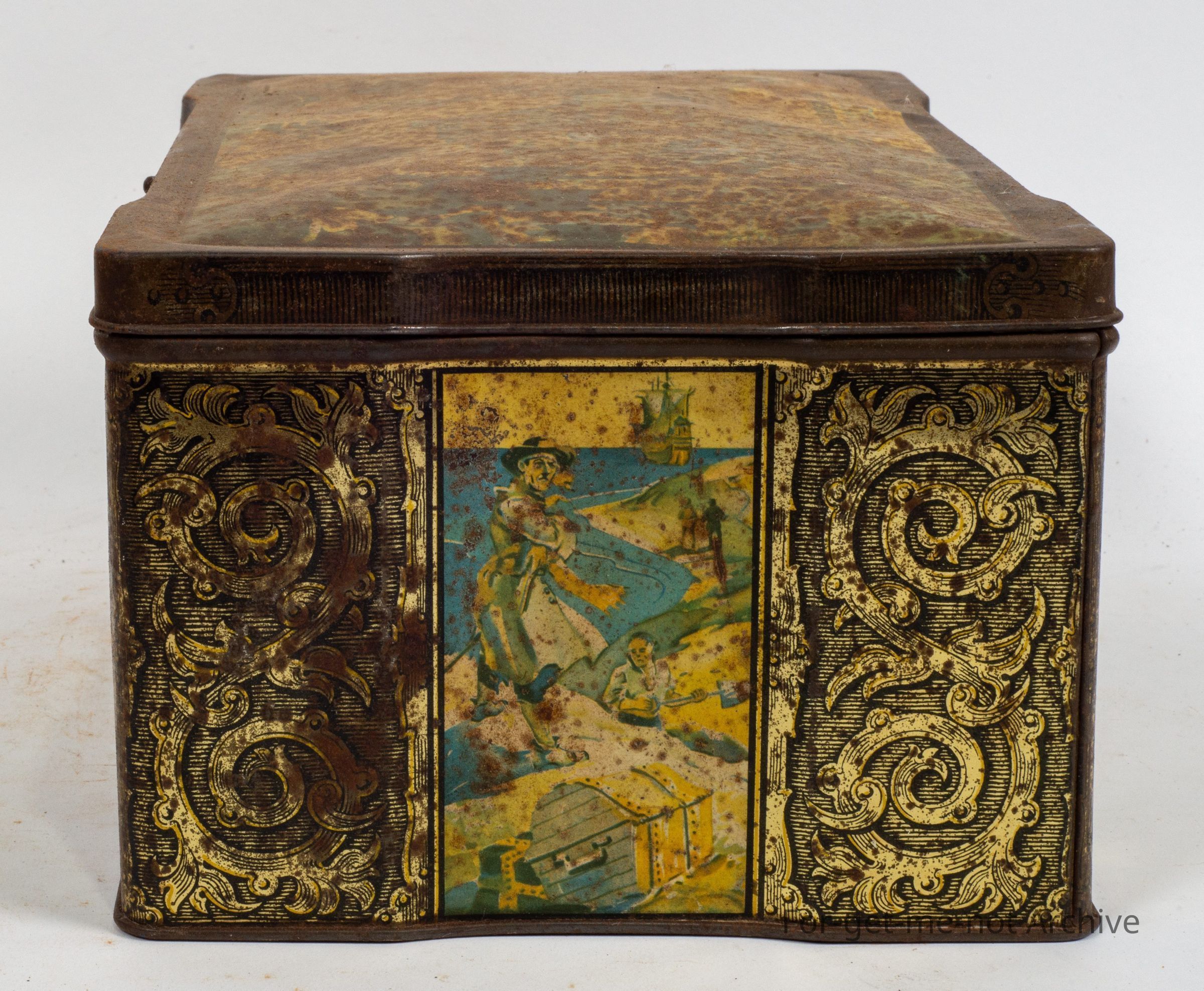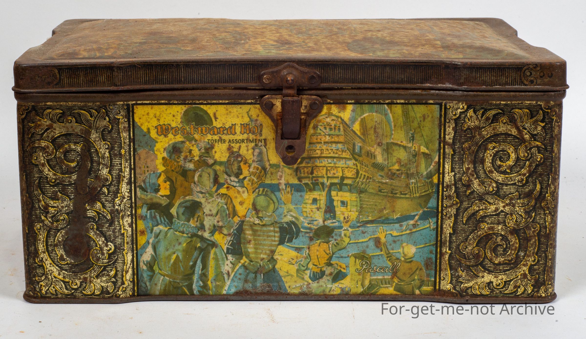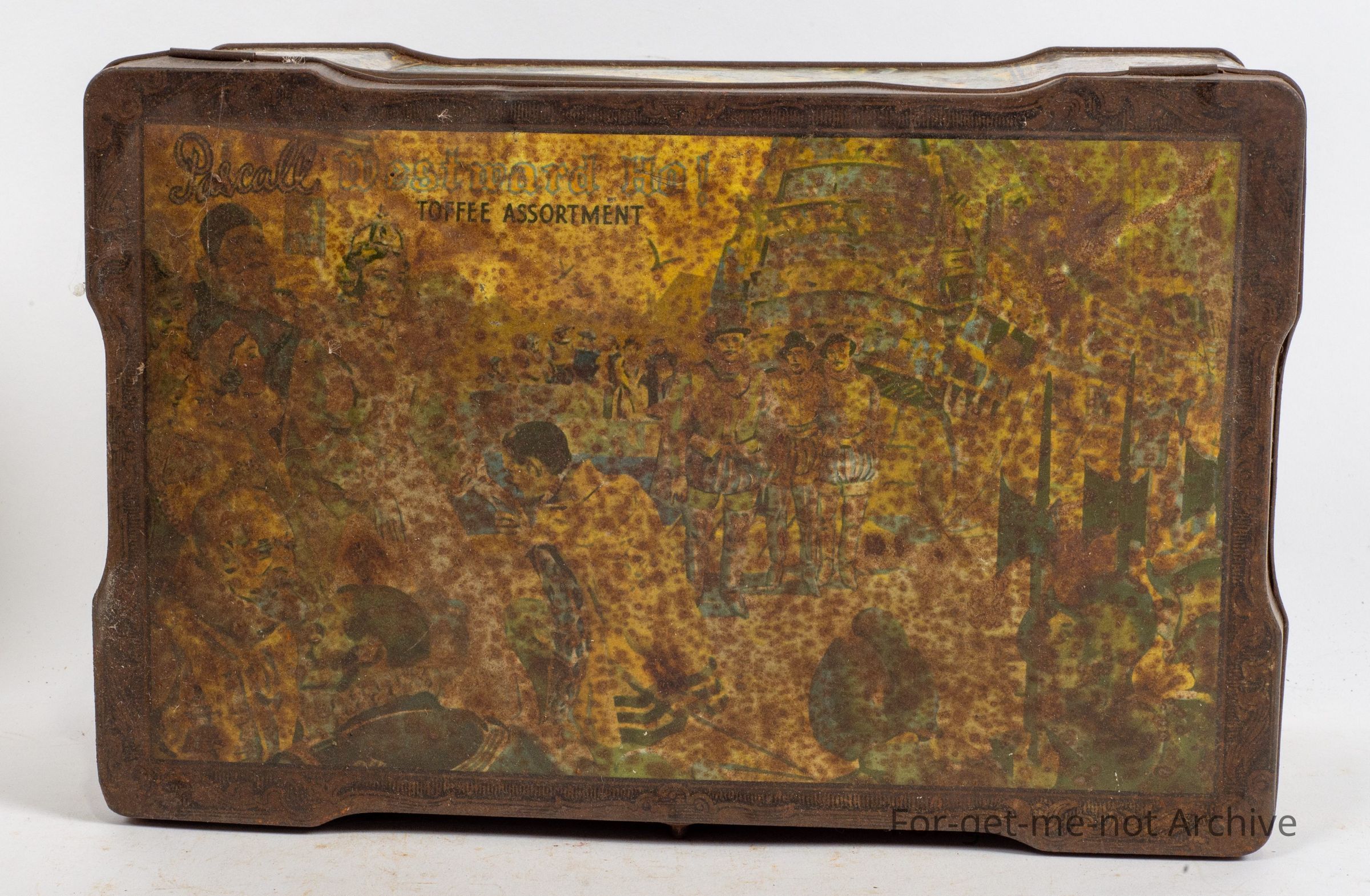 in the shape of a suittcase with a catch on the front, images all the way around, in medium condition
