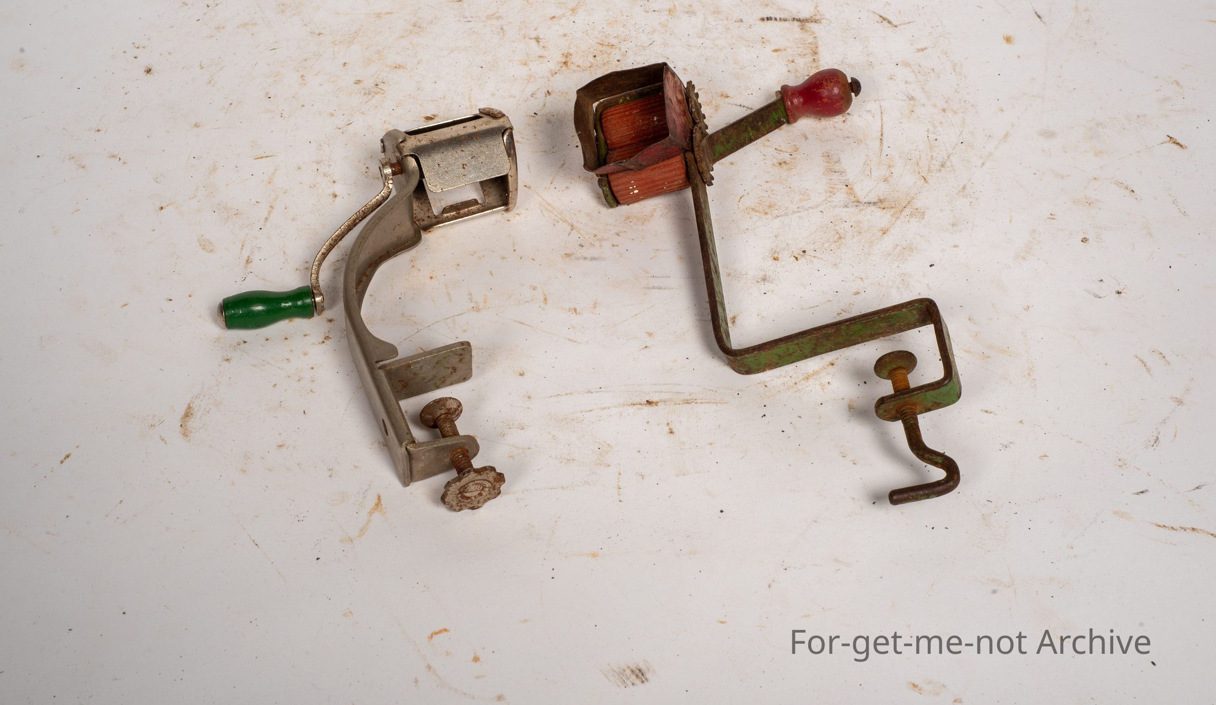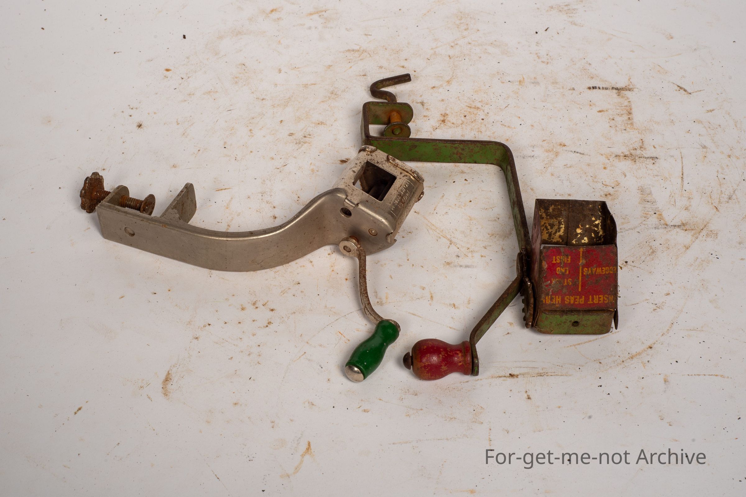 These are 2 lightly made pea shallows, both in very good working condition. One perhaps older than the other. Clamped to the table, hand operated,