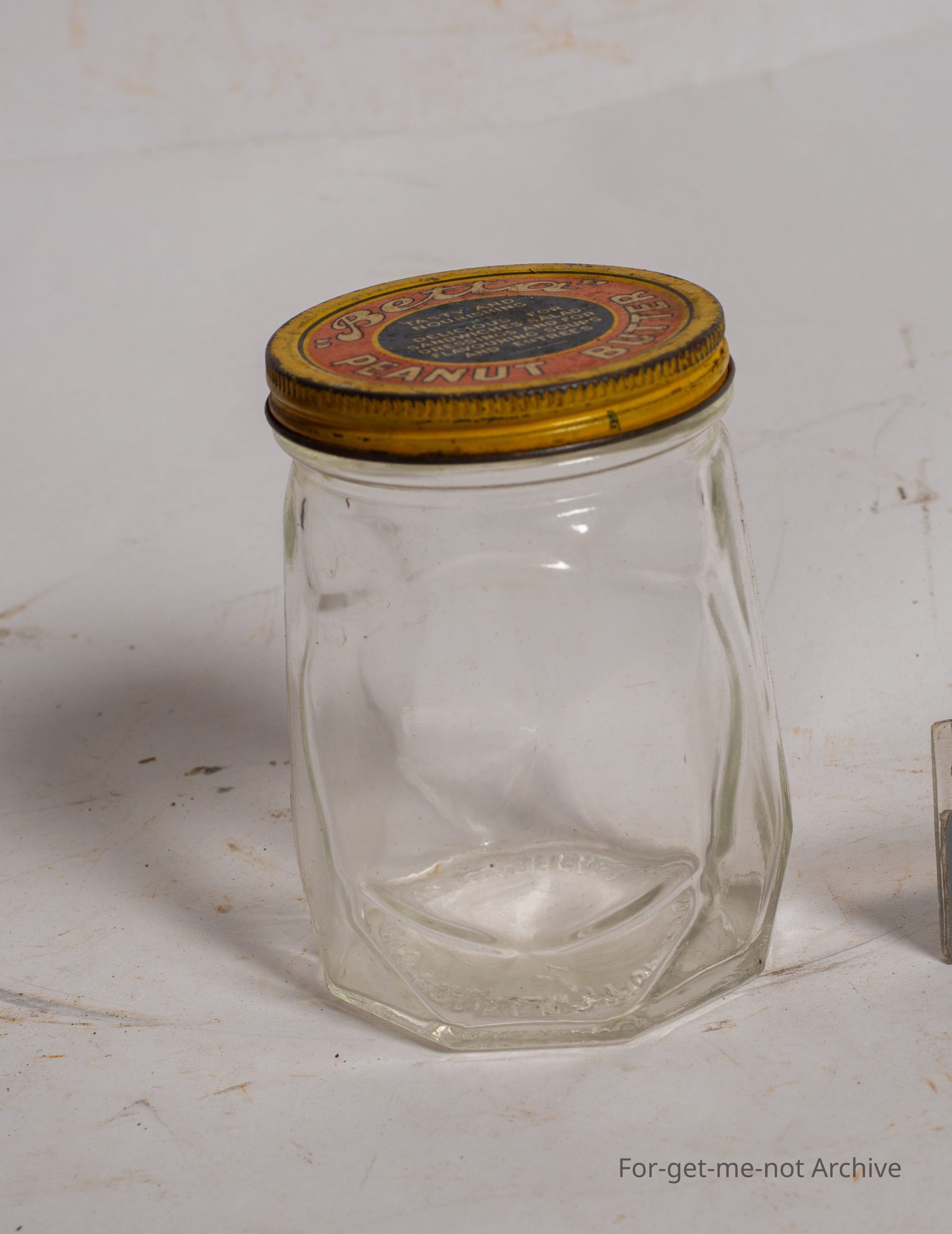 This is a glass jar, of Betta peanut butter. Tasty and nourishing. Quite a decorative jar. The paper label part is gone but a very good tin to tell you what it's all about.Collection