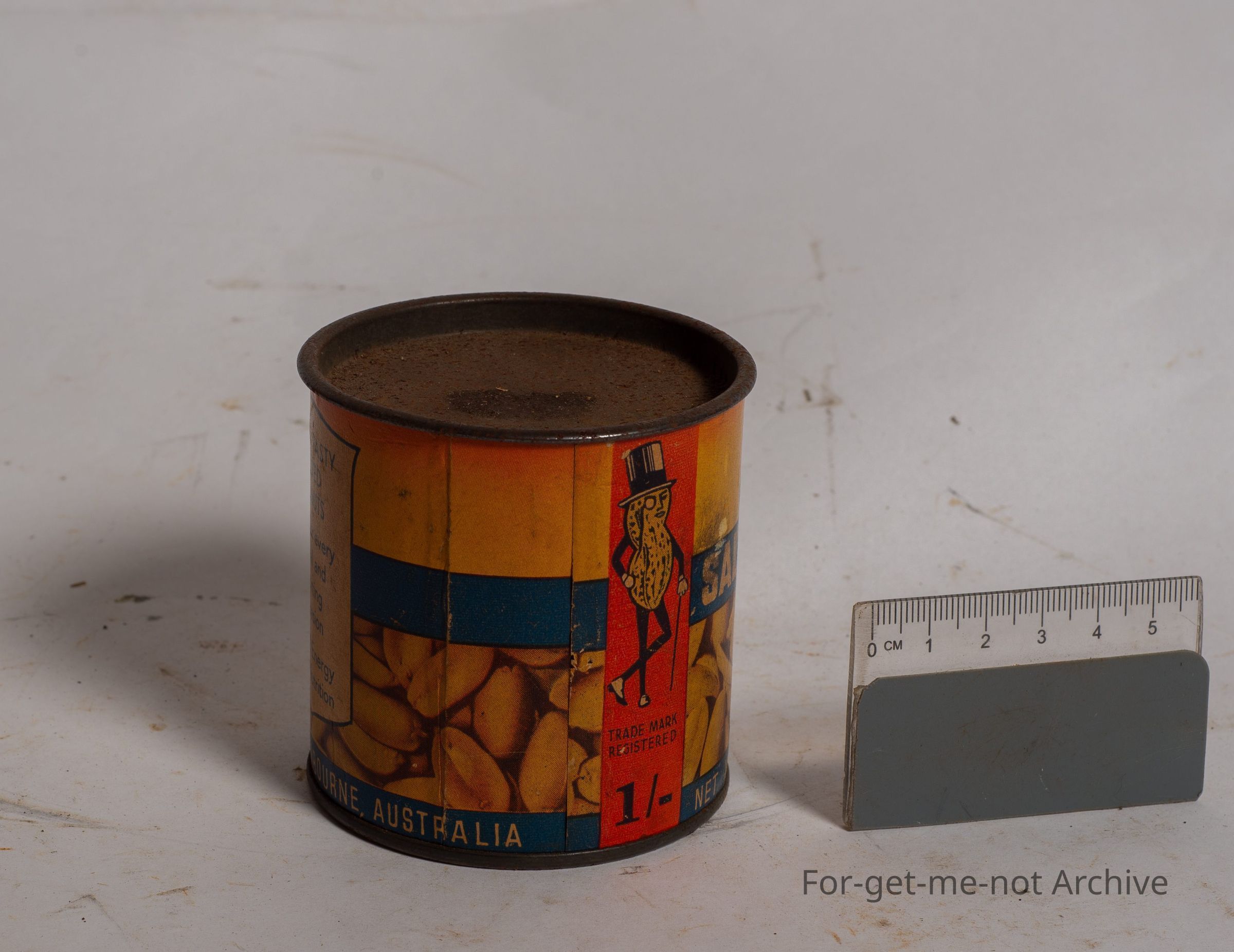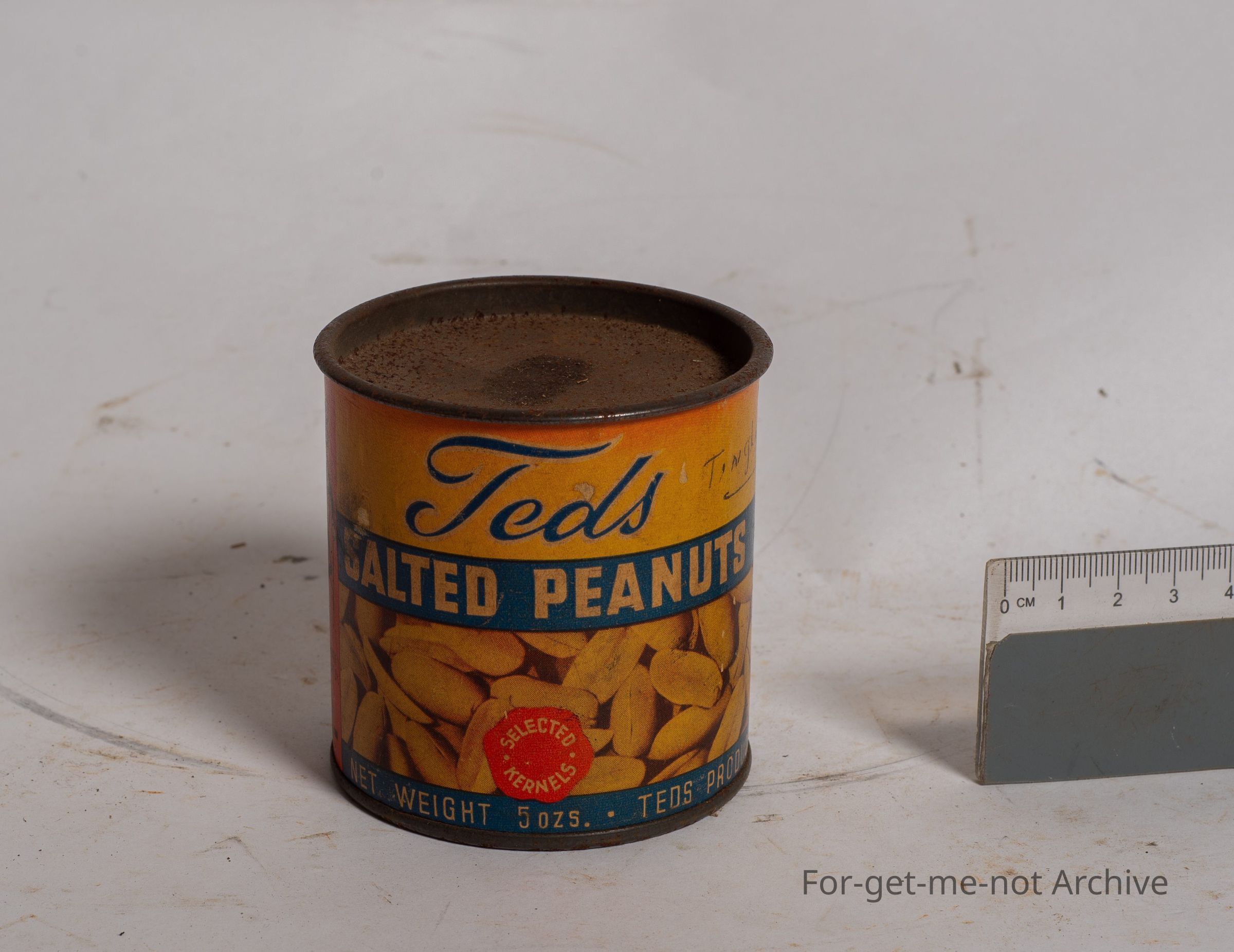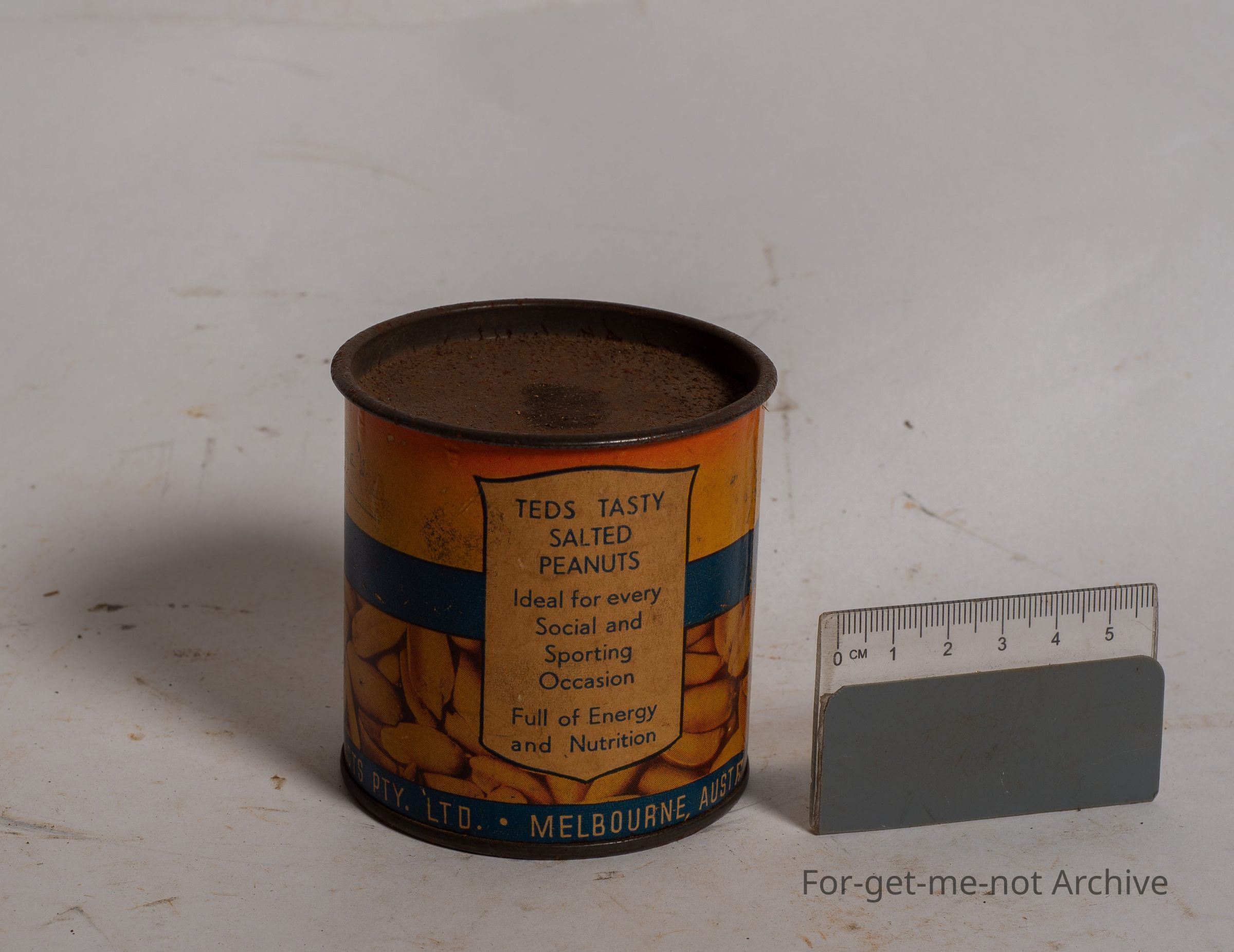 This is a small sized tin of Ted's salted peanuts, 5 ounce weight. This has the image of the cast iron symbol for Ted's peanuts, with the top hat. The price is 1 shilling, in very good order. These were packed by Ted's Products Melbourne.Collection