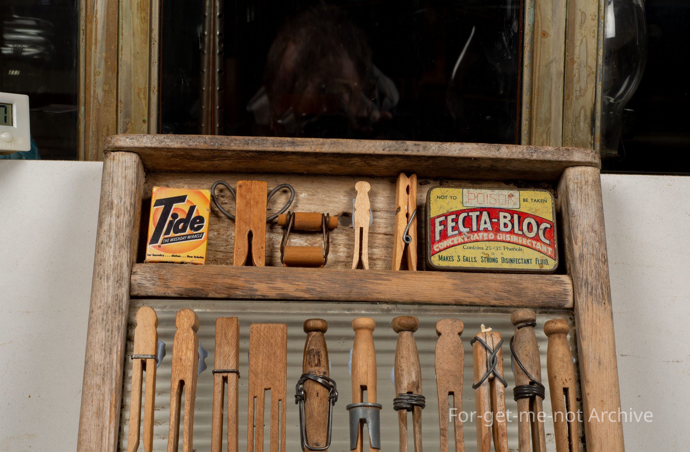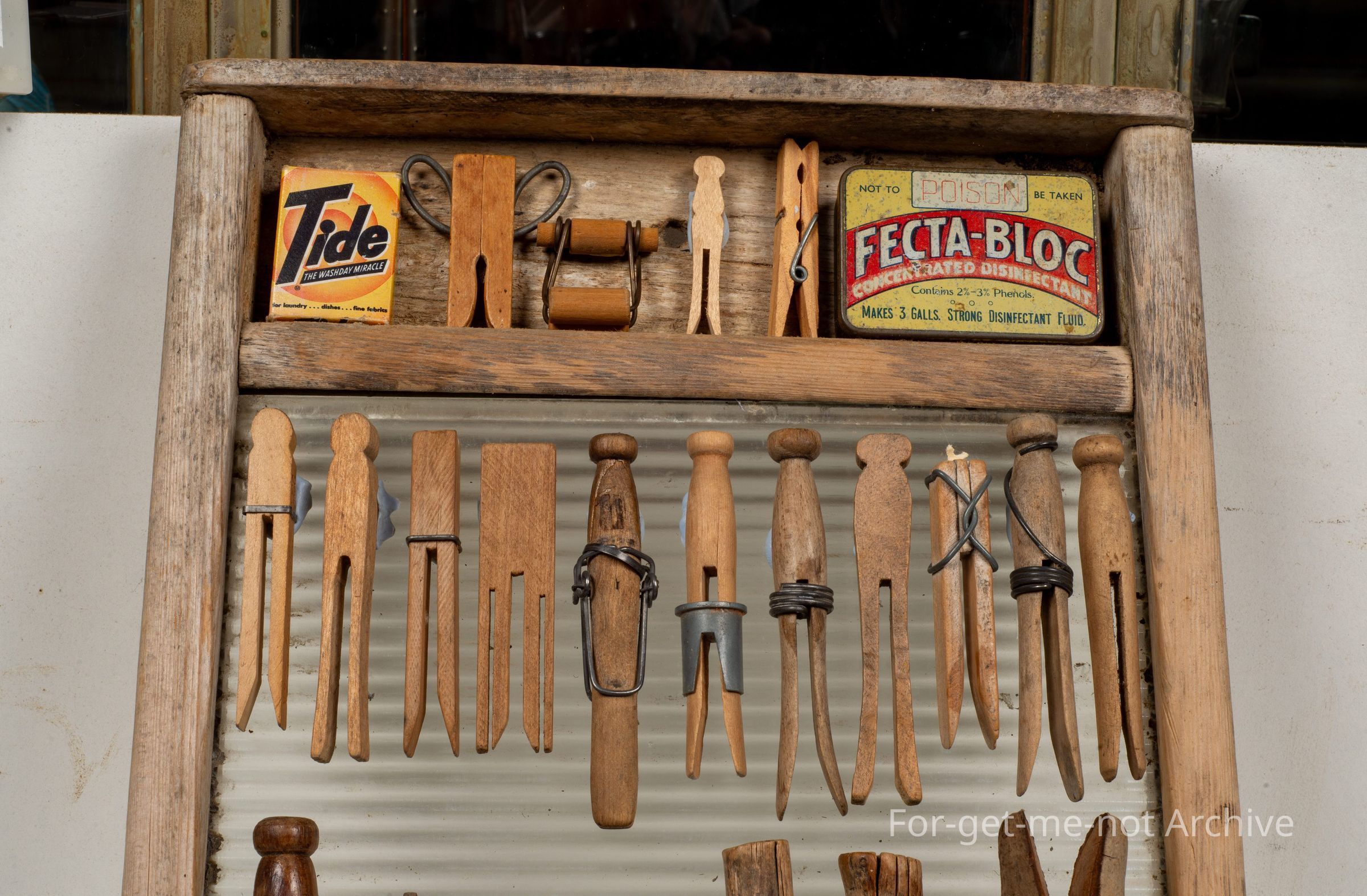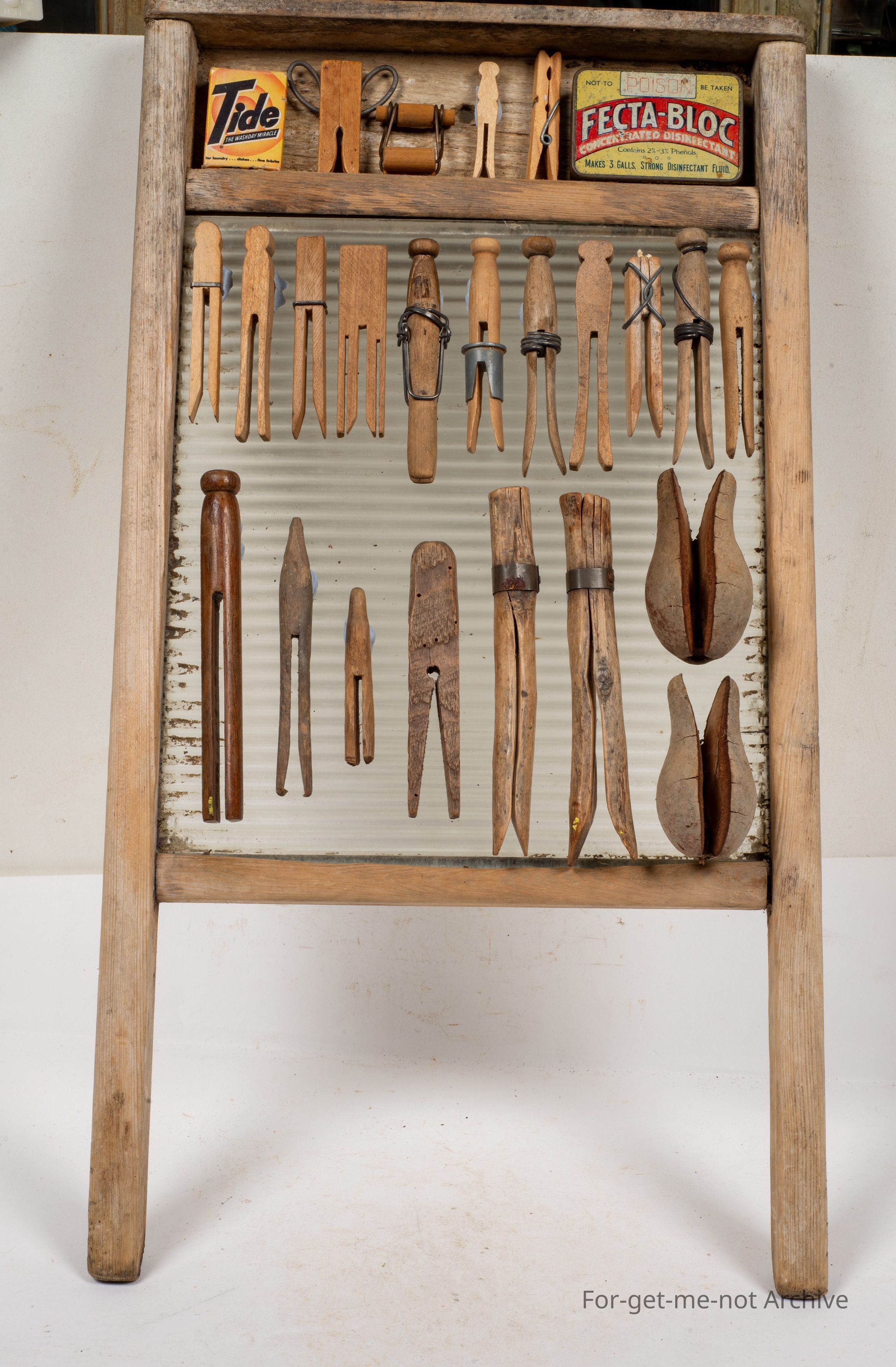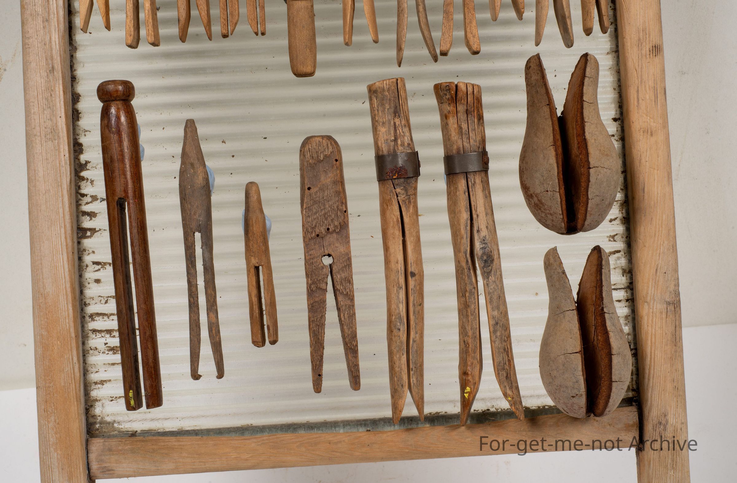 Was a washboard, with a collection of various wooden pegs from blank blanket pegs, natural pear native pear pegs, all different shapes and sizes, with the washboard.
